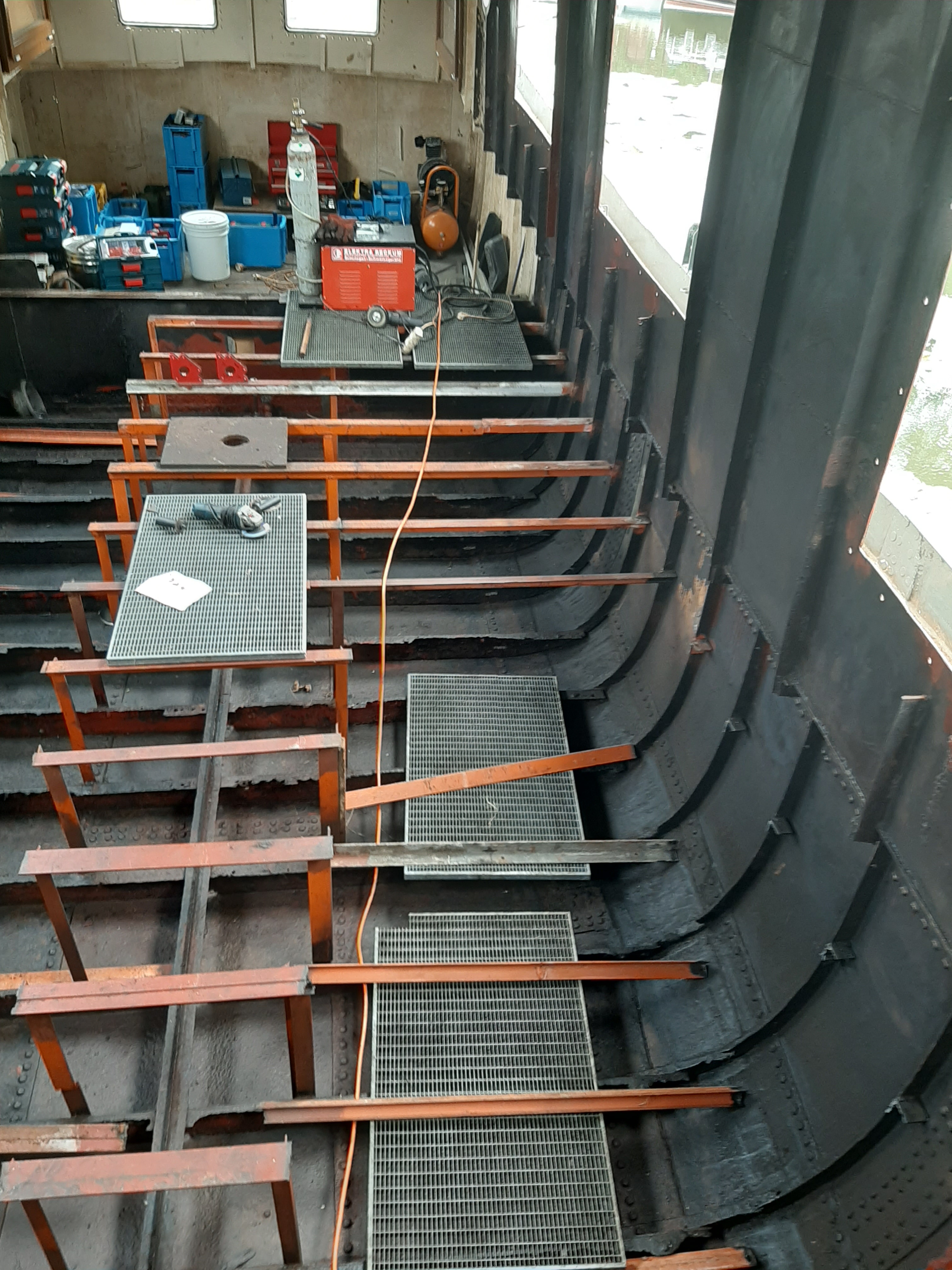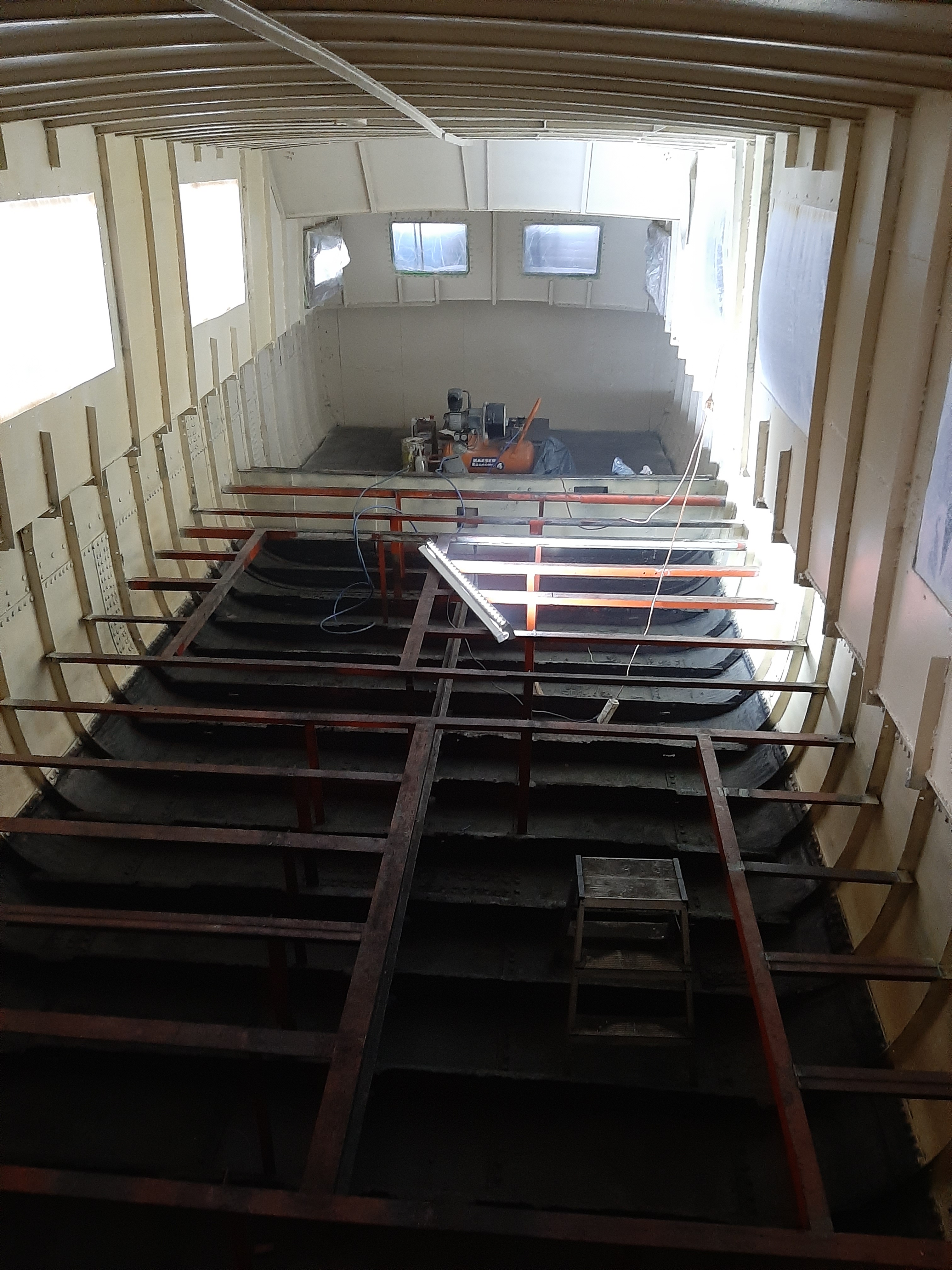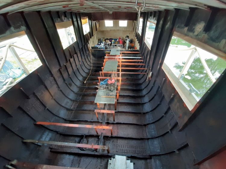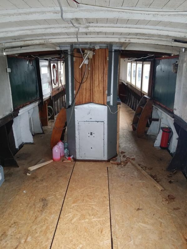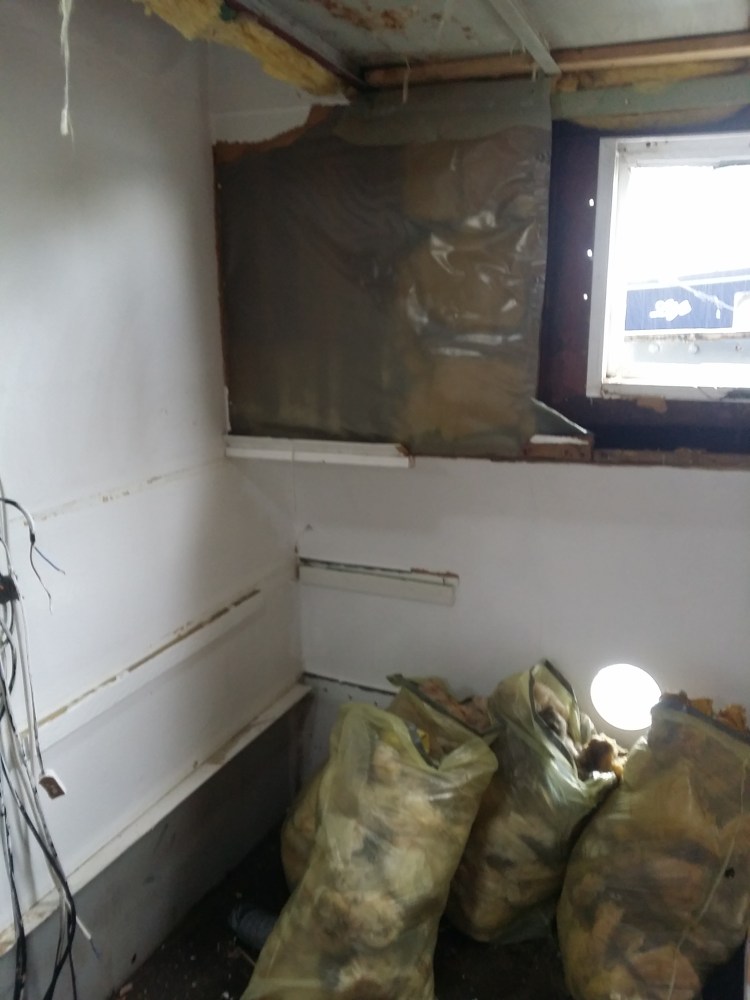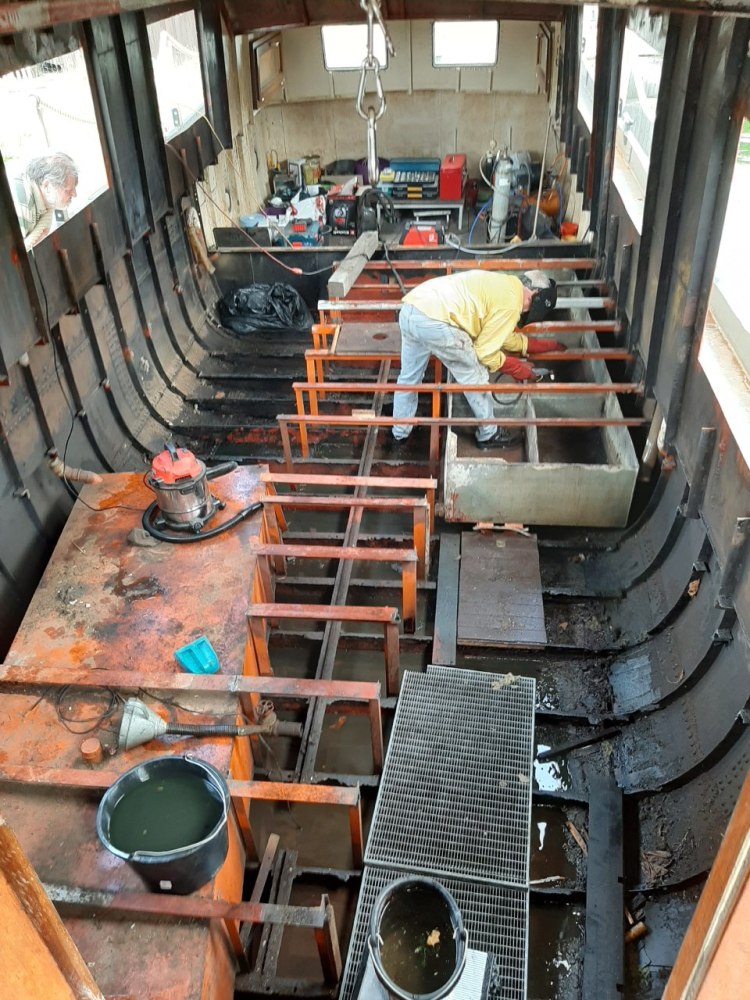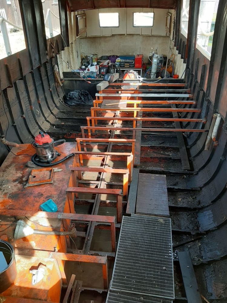 Bis 2017 wurde der Treue Gesell immer nur in „Etappen“ restauriert. Beziehungsweise es wurden nur einzelne Teilprojekte begonnen. Doch irgendwann war es an der Zeit: Abriss! Alles raus was keine Miete zahlt. Die Inneneinrichtung, die Wandverkleidung, die Fenster, die Dämmung, der Boden. Sogar die Tanks flogen raus, nachdem der Inhalt in Fässer abgepumpt und die Tanks kleingeschnitten wurden. Die Bilge im Motorraum und der Vorpiek waren im wesentlich besseren Zustand als die des Mittelschiffs. Die Spanten waren teilweise sehr durch Rost angefressen. Nachdem einmal richtig aufgeräumt und ausgesaugt wurde, ging die Laune wieder hoch. Alles halb so wild.