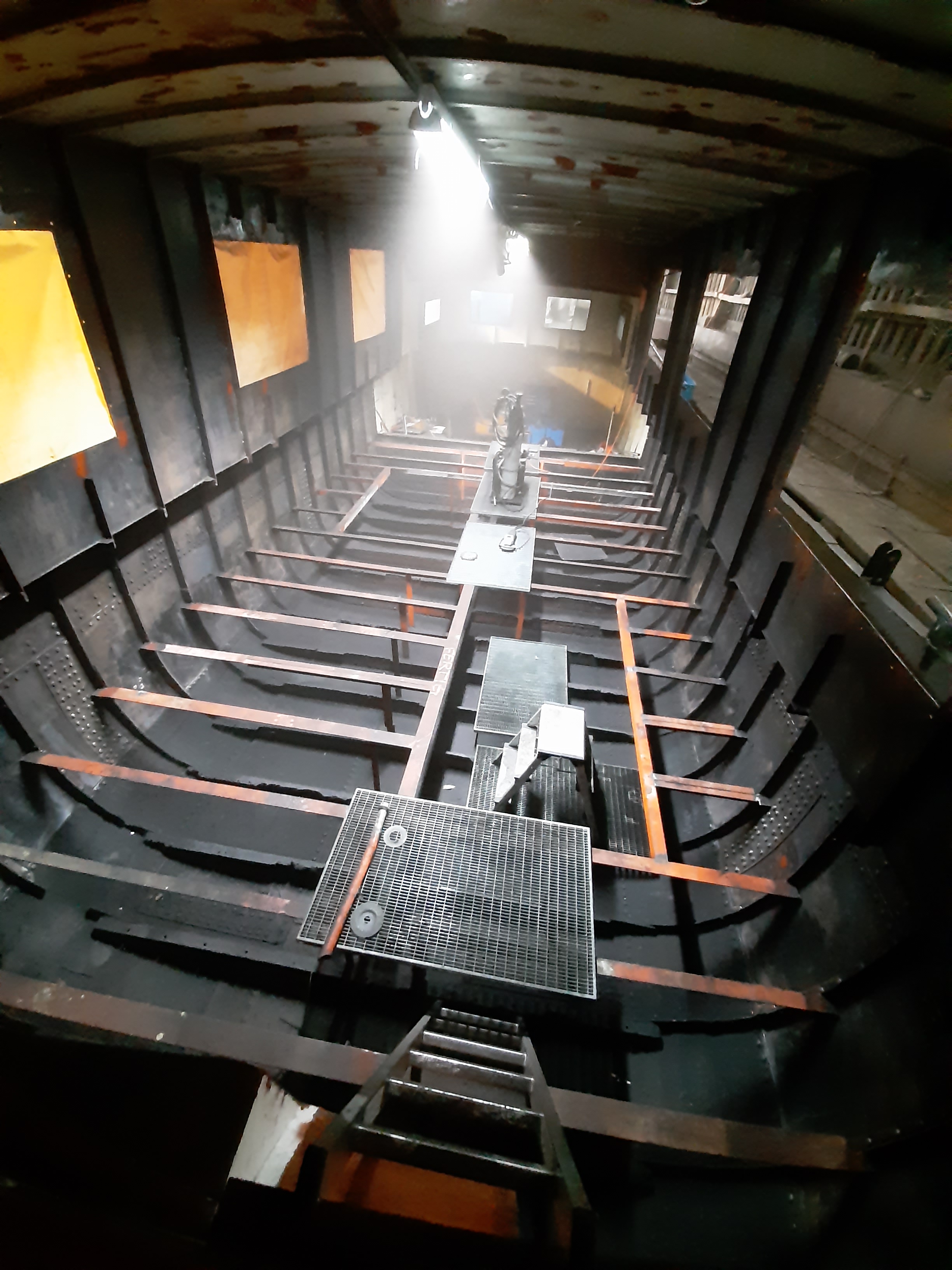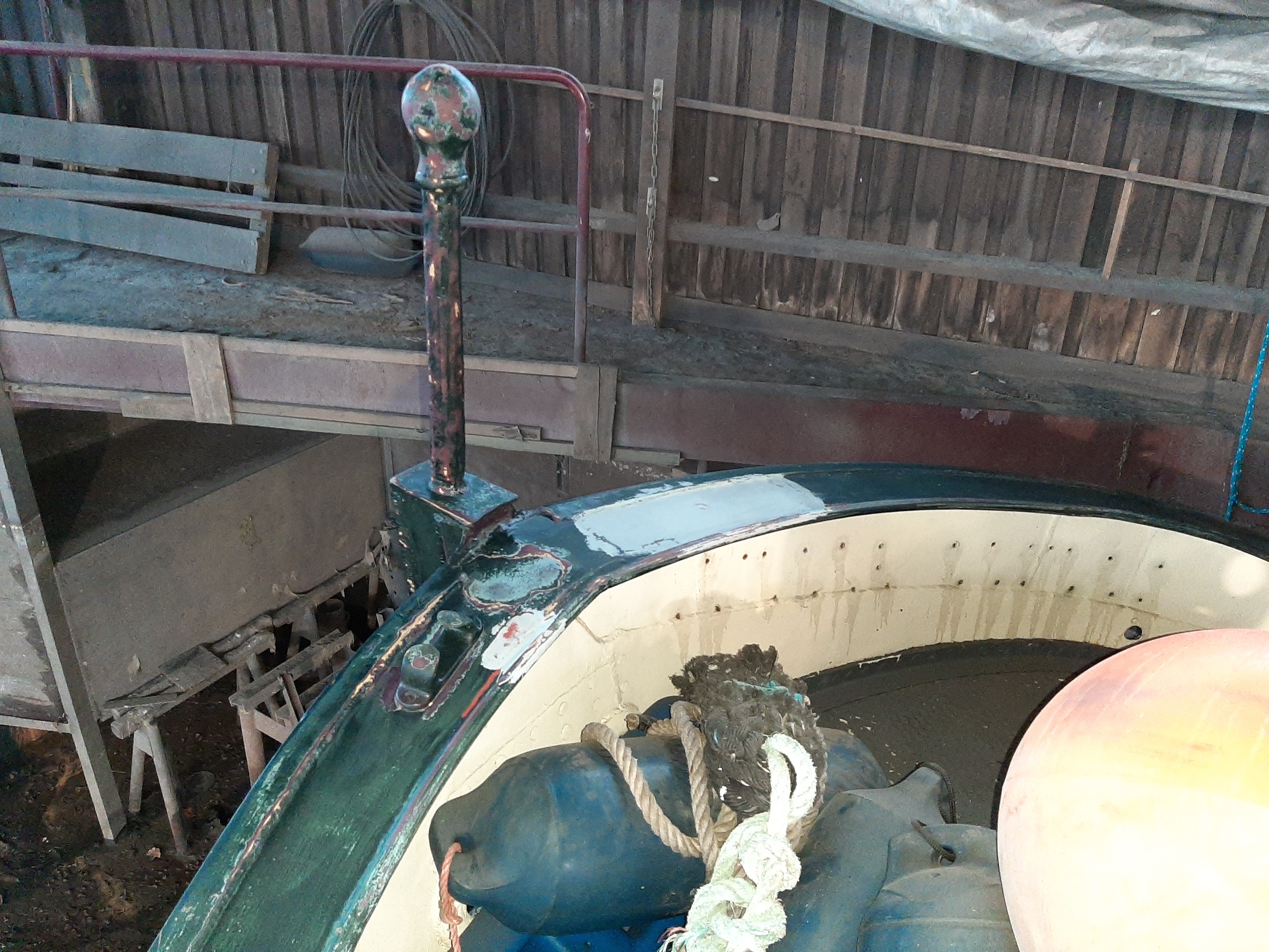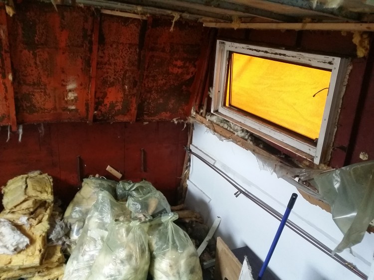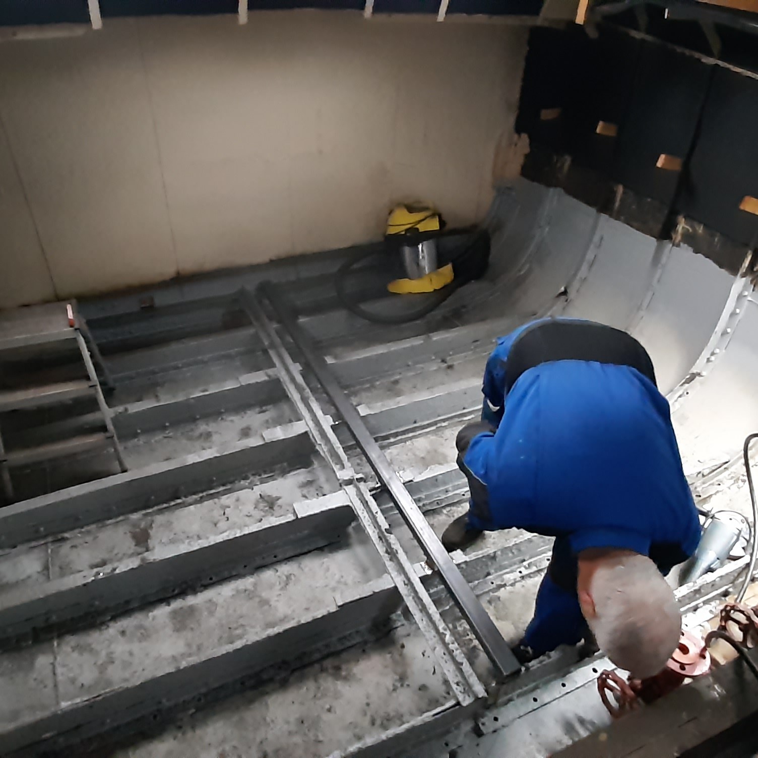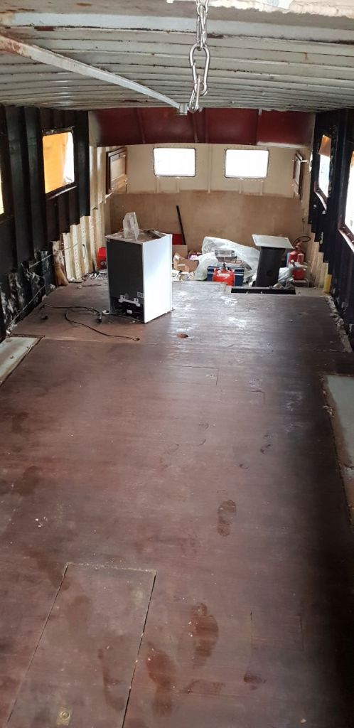Bis 2017 wurde der Treue Gesell immer nur in „Etappen“ restauriert. Beziehungsweise es wurden nur einzelne Teilprojekte begonnen. Doch irgendwann war es an der Zeit: Abriss! Alles raus was keine Miete zahlt. Die Inneneinrichtung, die Wandverkleidung, die Fenster, die Dämmung, der Boden. Sogar die Tanks flogen raus, nachdem der Inhalt in Fässer abgepumpt und die Tanks kleingeschnitten wurden. Die Bilge im Motorraum und der Vorpiek waren im wesentlich besseren Zustand als die des Mittelschiffs. Die Spanten waren teilweise sehr durch Rost angefressen. Nachdem einmal richtig aufgeräumt und ausgesaugt wurde, ging die Laune wieder hoch. Alles halb so wild.