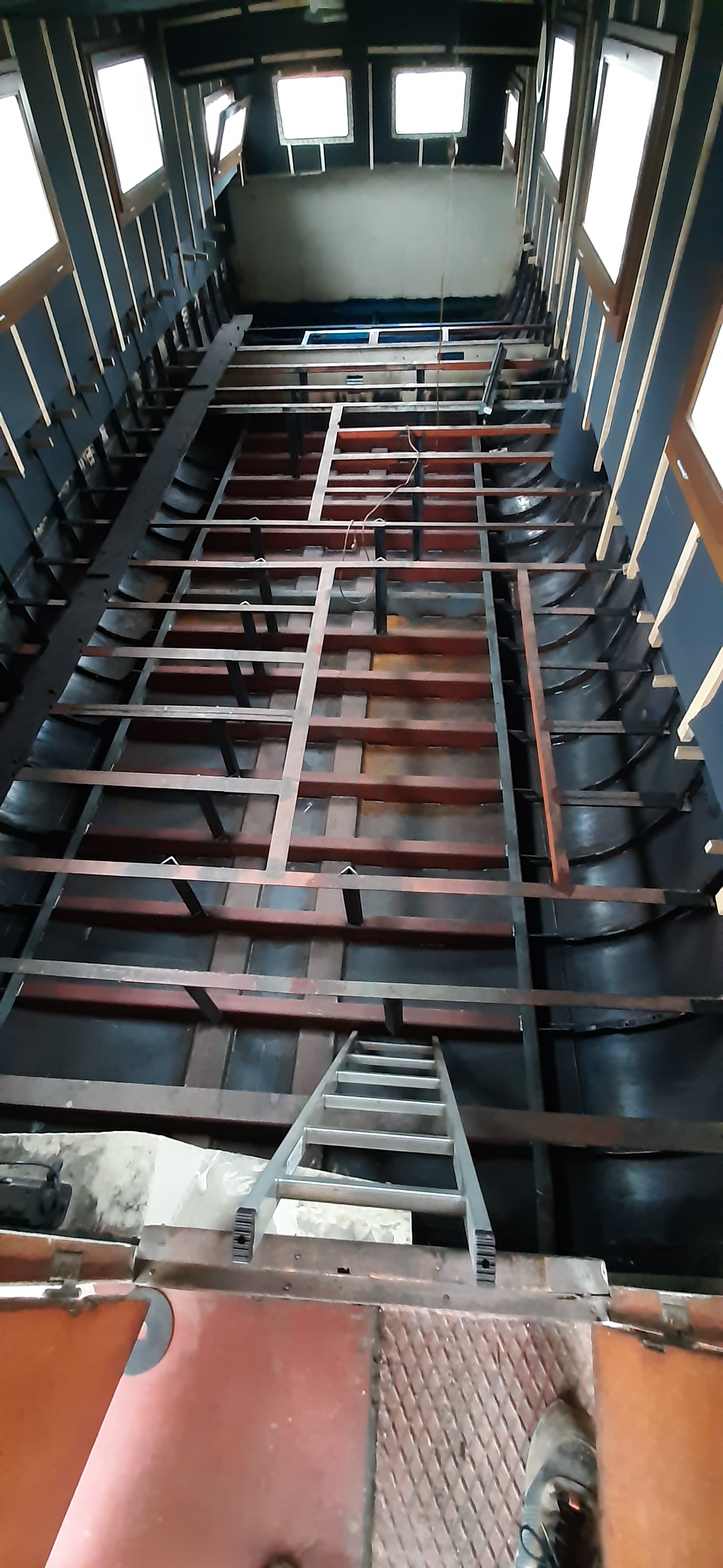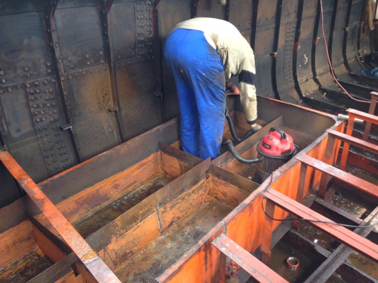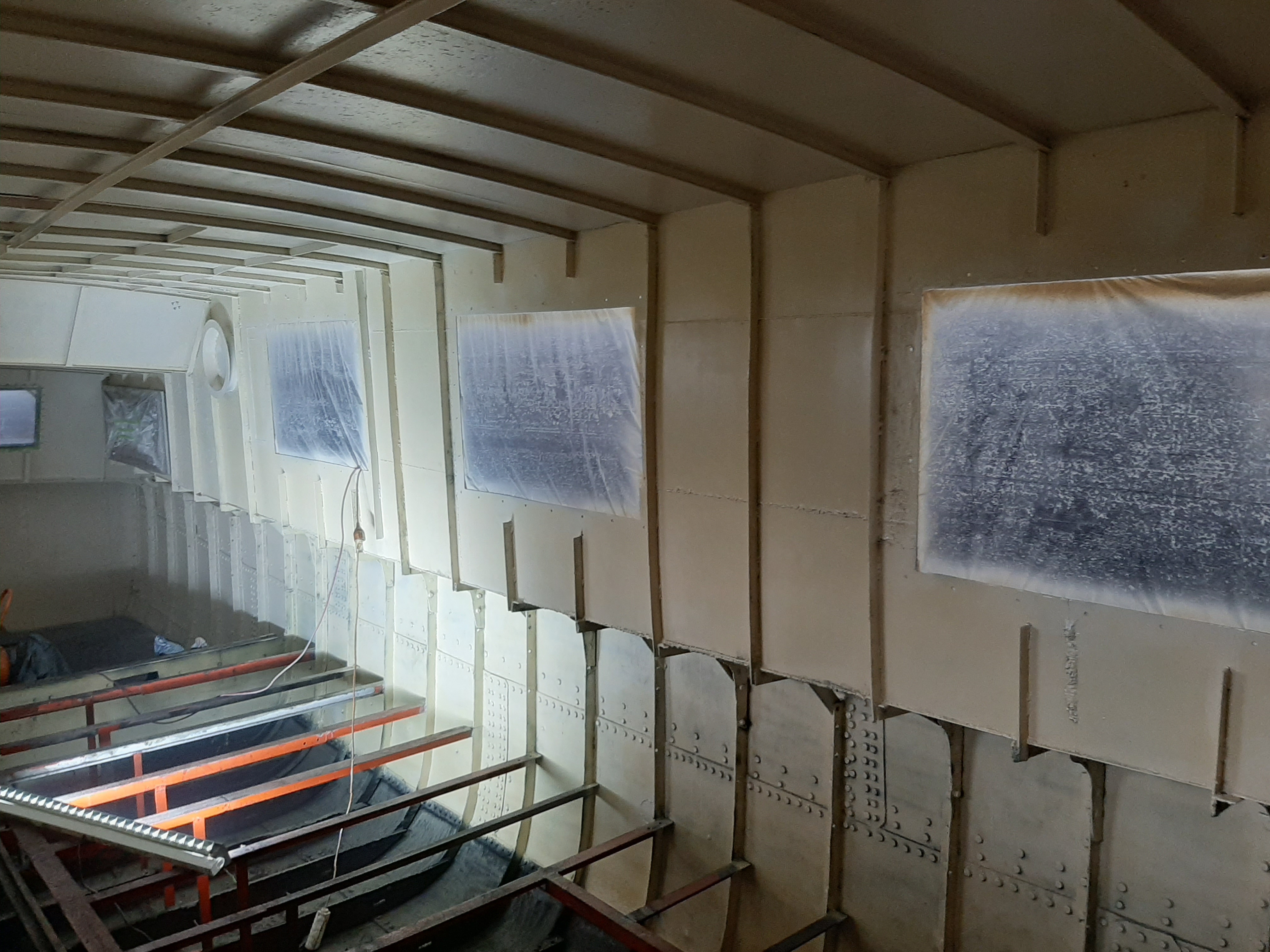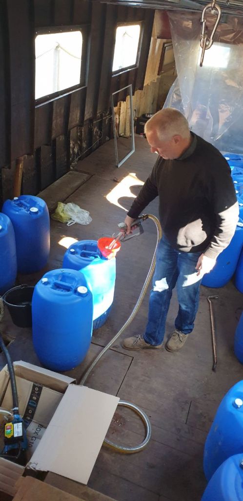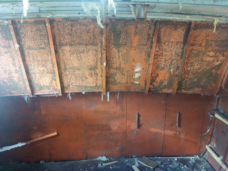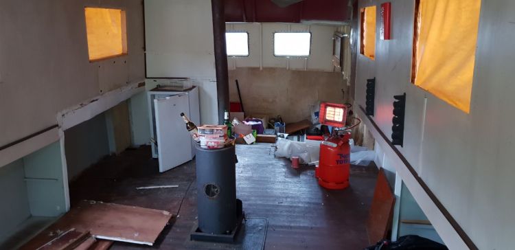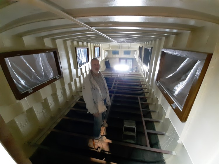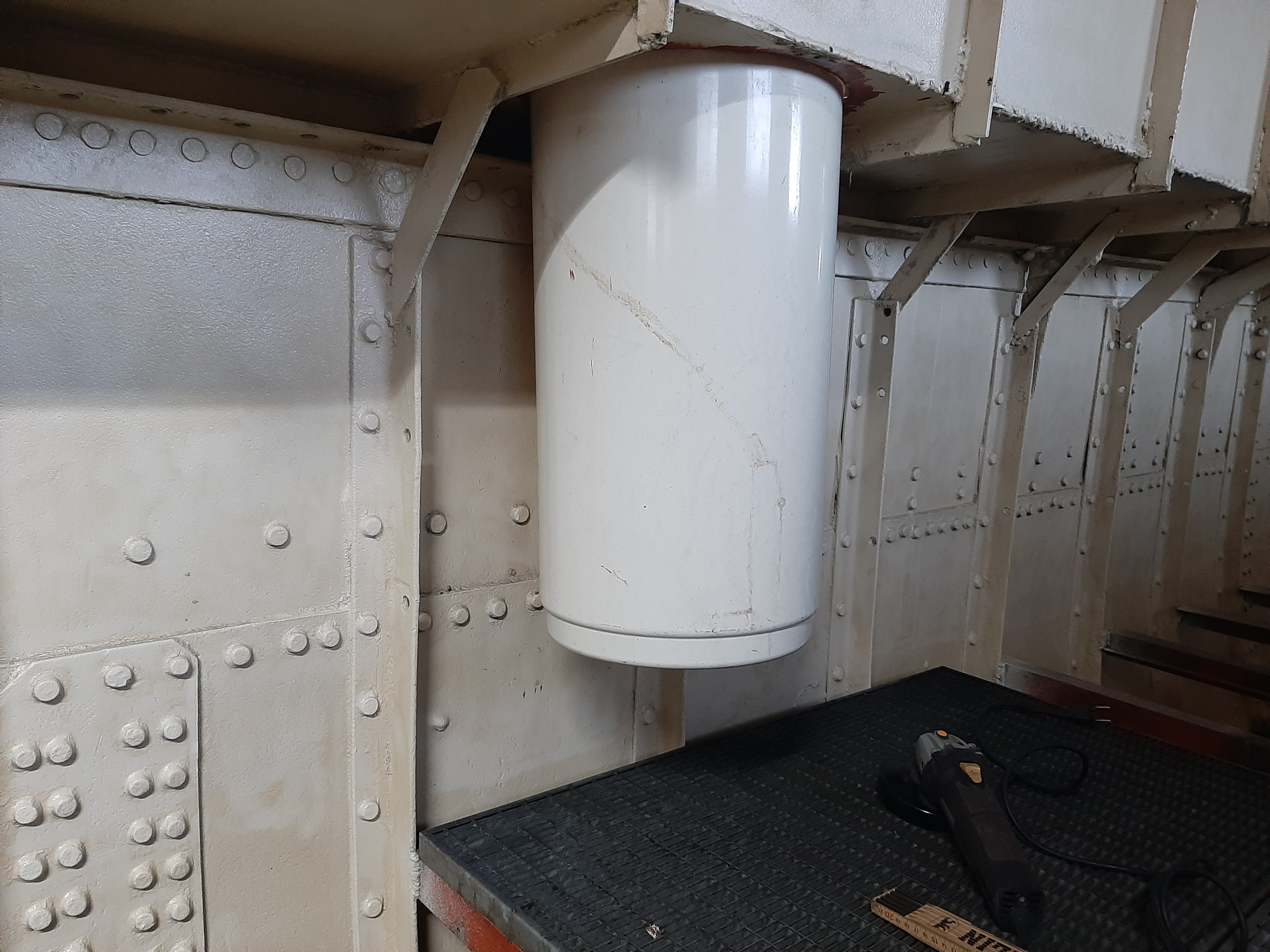 Bis 2017 wurde der Treue Gesell immer nur in „Etappen“ restauriert. Beziehungsweise es wurden nur einzelne Teilprojekte begonnen. Doch irgendwann war es an der Zeit: Abriss! Alles raus was keine Miete zahlt. Die Inneneinrichtung, die Wandverkleidung, die Fenster, die Dämmung, der Boden. Sogar die Tanks flogen raus, nachdem der Inhalt in Fässer abgepumpt und die Tanks kleingeschnitten wurden. Die Bilge im Motorraum und der Vorpiek waren im wesentlich besseren Zustand als die des Mittelschiffs. Die Spanten waren teilweise sehr durch Rost angefressen. Nachdem einmal richtig aufgeräumt und ausgesaugt wurde, ging die Laune wieder hoch. Alles halb so wild.