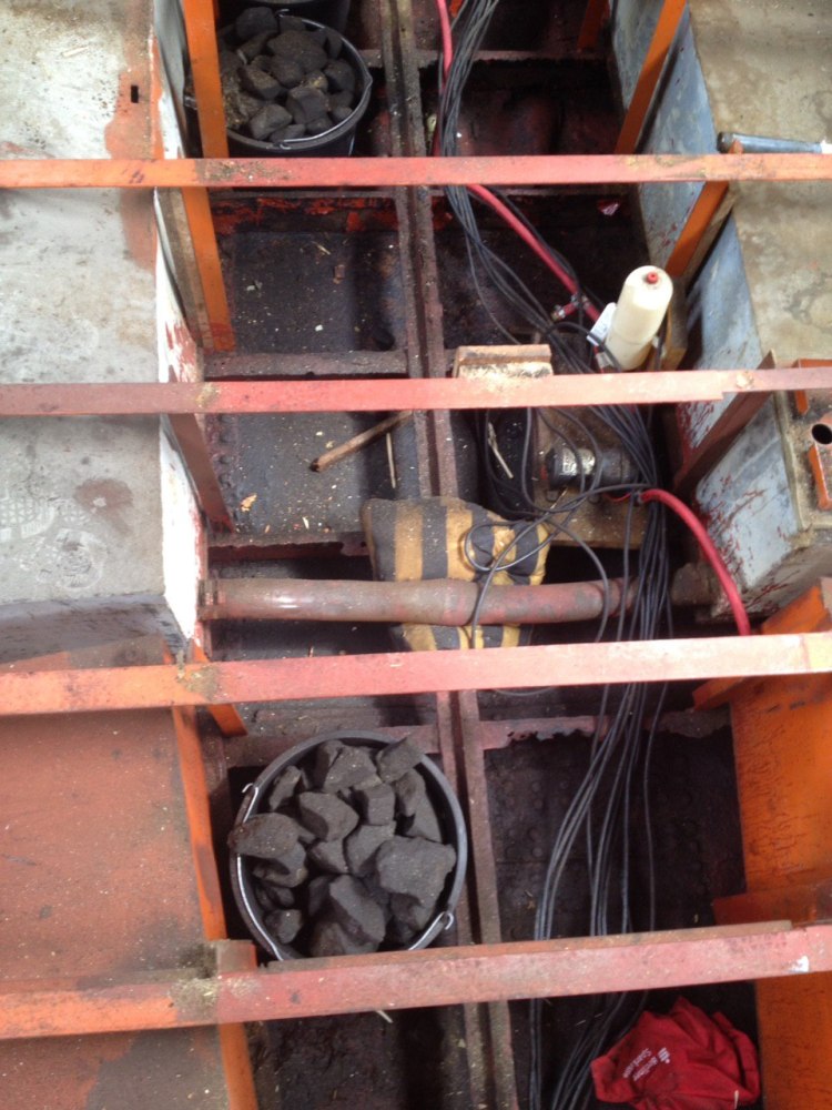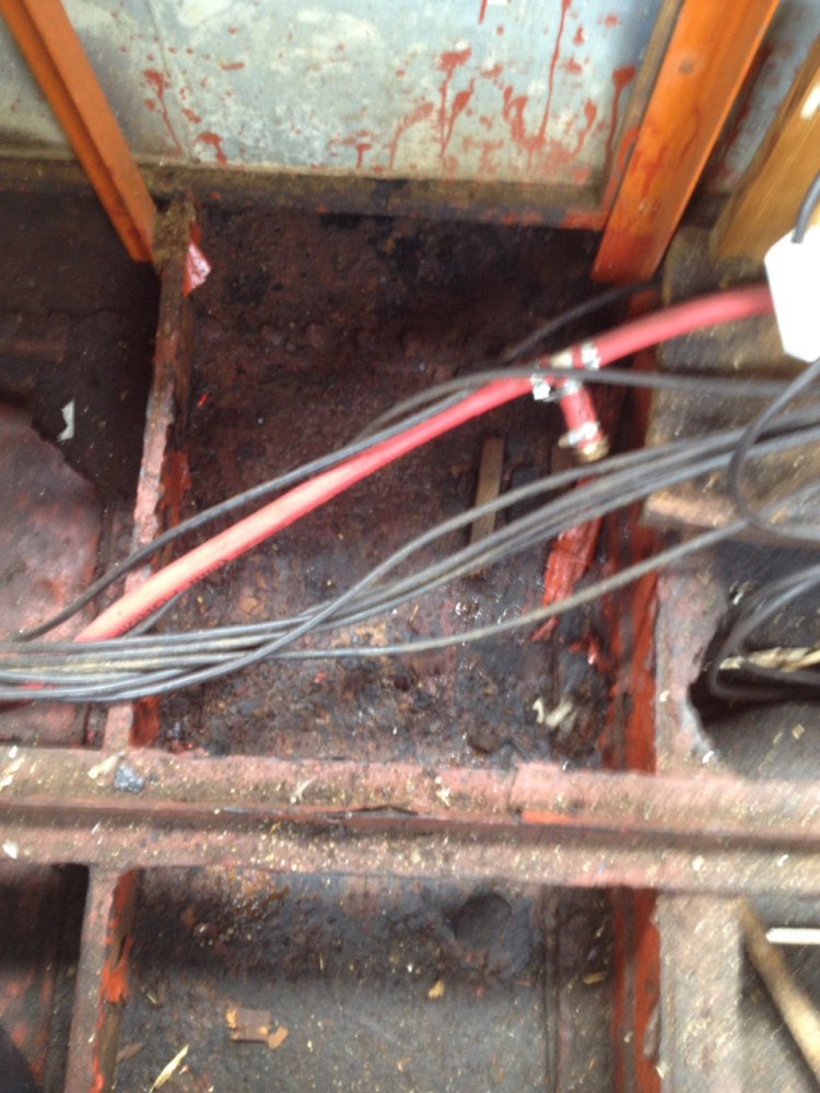 Der Basalt ist raus. Der ganze Raum zwischen den Spanten war gefüllt mit BasaltGanz schön gefährlich: hier sieht man einen Teil der alten Elektroinsallation.So viel Basalt kam raus……und so viel Blei kam rein – das Gewicht ist gleich, das Volumen ein anderes.Endlich ebener Boden im Motorraum, die Elektroinstallation hat begonnen.Auch auf der Backbordseite: ebener Boden. Darunter erkennt man die Bleibarren.