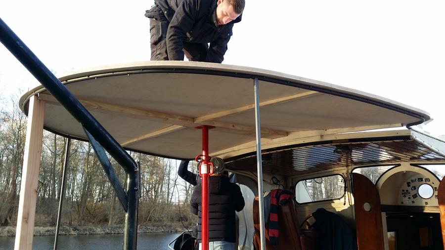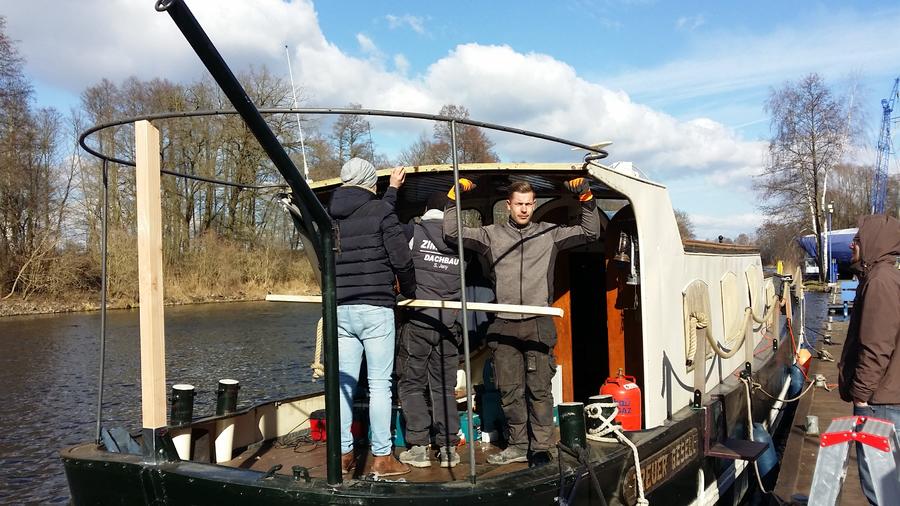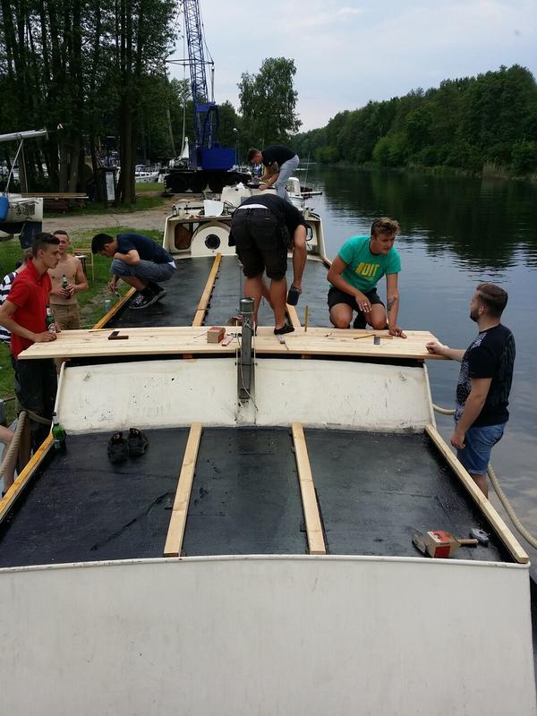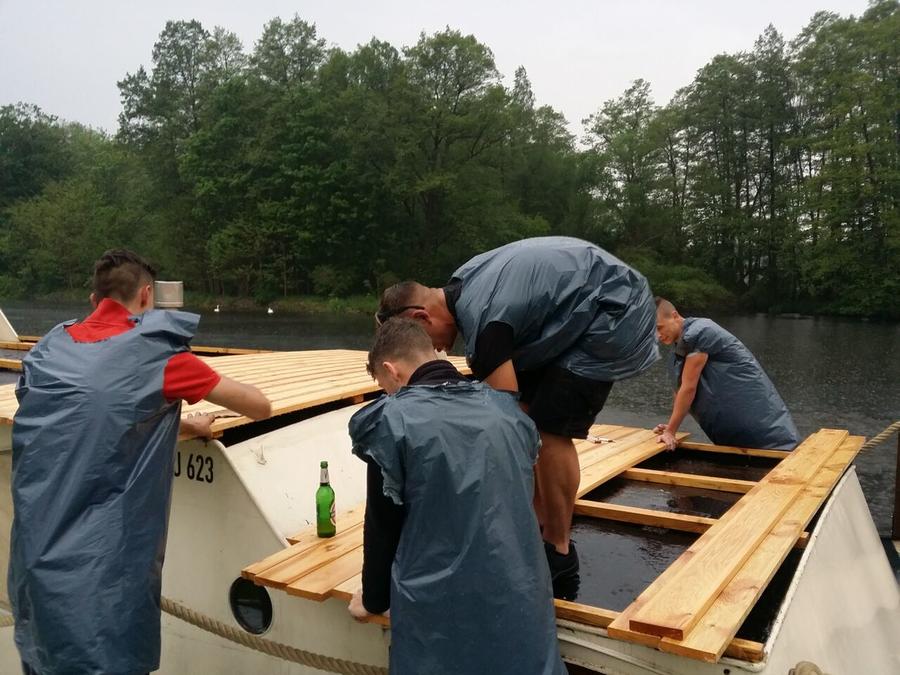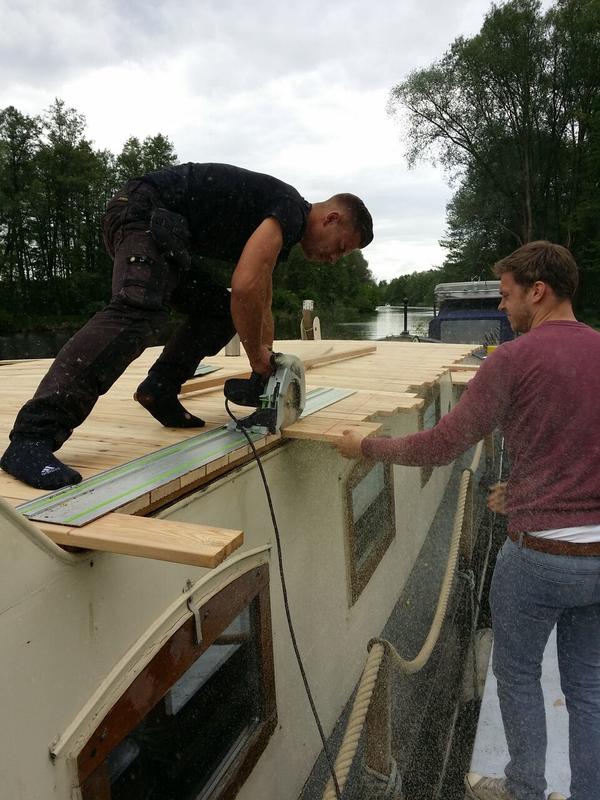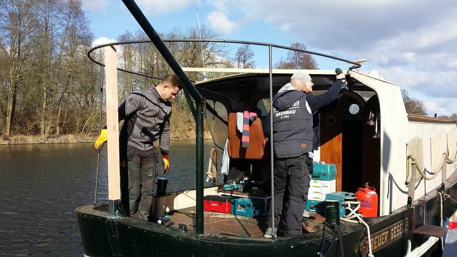Der Herrentag 2017 stand an. Tatsächlich hatten wir noch 2 Tage bis zum Ehrentag der Männer. Das Boot hatte aber keine Dachterrasse mehr. Und so kam es, dass jede Menge freiwillige Helfer am Treuen Gesellen anzutreffen waren. Früh morgens in der kühlen, sonnenfreien Zeit strichen Flori und ich das offengelegte Stahldach mit neuem Bitumen. Nach mehreren Schichten und kurzer Trockenzeit begann Leon die Unterkonstruktion zu verlegen. Es folgten die Latten. Eine Arbeit, bei der man von Minute zu Minute einen Fortschritt sieht. Das macht Spaß, selbst im Regen. Bis spät abends waren wir vor Ort und machten mit der letzten Latte Feierabend. Dann, am nächsten Tag – Herrentag – mussten nur noch die Handläufe montiert werden und die Überstände der Latten abgeschnitten werden.