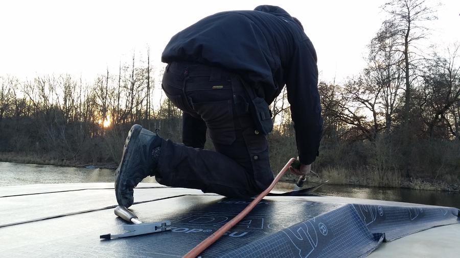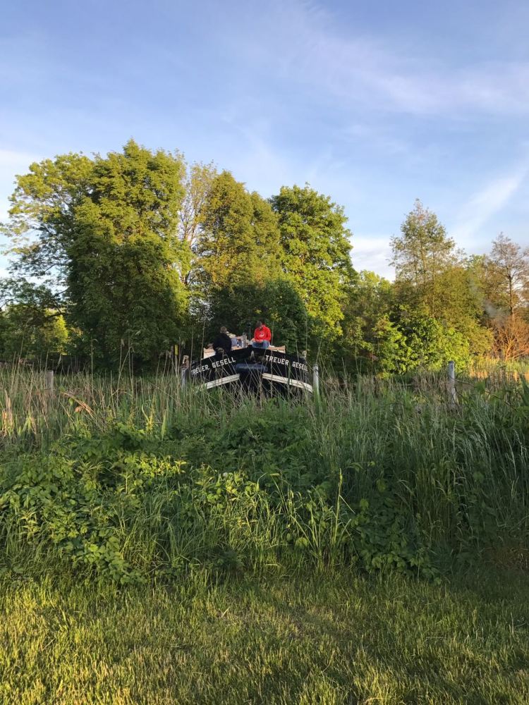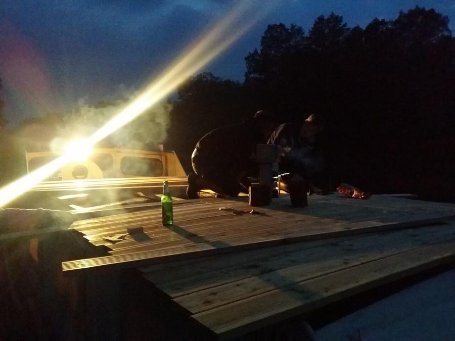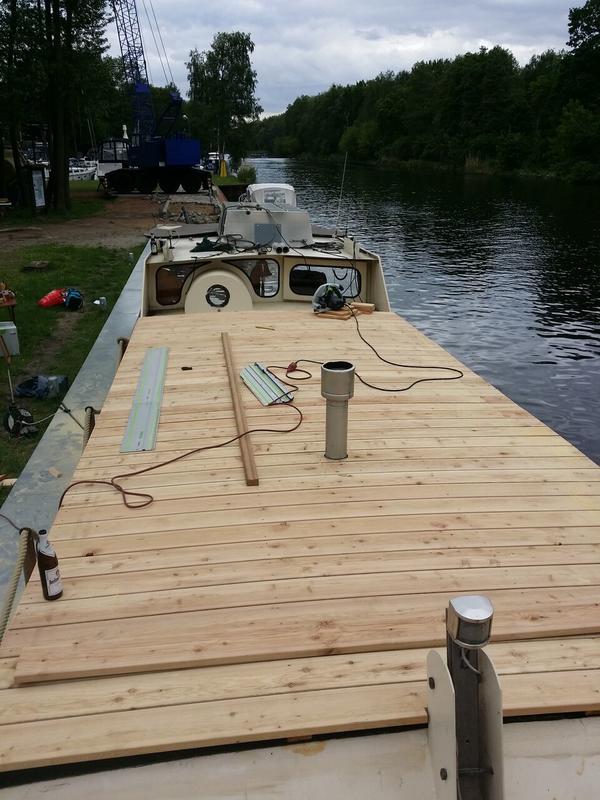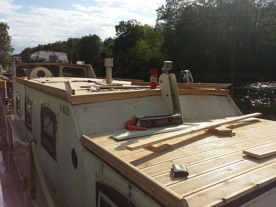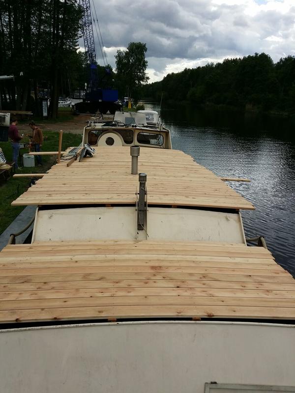 Der Herrentag 2017 stand an. Tatsächlich hatten wir noch 2 Tage bis zum Ehrentag der Männer. Das Boot hatte aber keine Dachterrasse mehr. Und so kam es, dass jede Menge freiwillige Helfer am Treuen Gesellen anzutreffen waren. Früh morgens in der kühlen, sonnenfreien Zeit strichen Flori und ich das offengelegte Stahldach mit neuem Bitumen. Nach mehreren Schichten und kurzer Trockenzeit begann Leon die Unterkonstruktion zu verlegen. Es folgten die Latten. Eine Arbeit, bei der man von Minute zu Minute einen Fortschritt sieht. Das macht Spaß, selbst im Regen. Bis spät abends waren wir vor Ort und machten mit der letzten Latte Feierabend. Dann, am nächsten Tag – Herrentag – mussten nur noch die Handläufe montiert werden und die Überstände der Latten abgeschnitten werden.