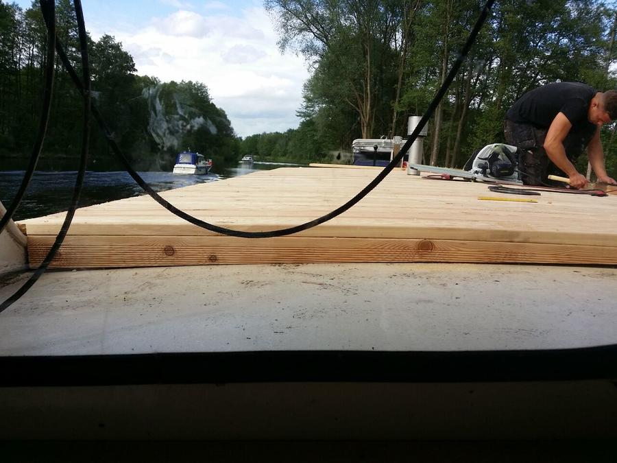 Die ersten Umbauten waren beschlossen und ich wollte gerne beginnen. Die Dachterrasse war marode. Außerdem war der oben montierte Handlauf eine Gefahr und sollte schnellstmöglich erneuert werden. Ein Fall für Leon. Ich: „Meinst du wir könnten uns mal die Terrasse auf meinem Boot angucken?“ Er: „Klar, wann?“