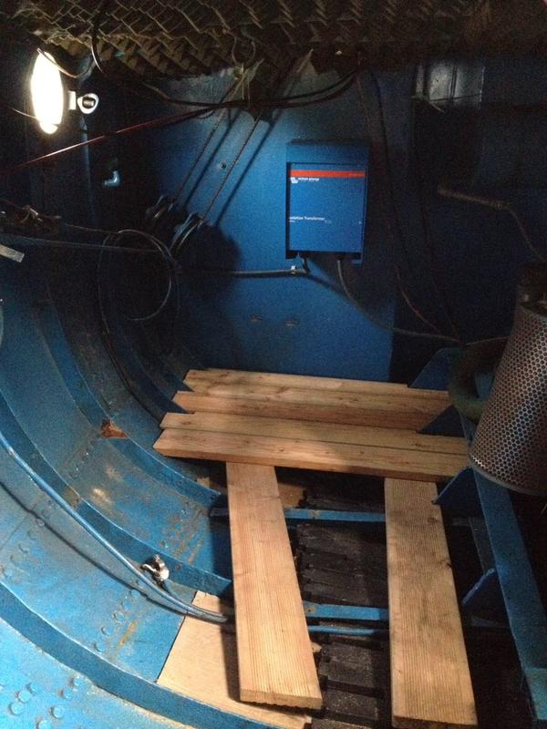 Gemeinsam mit meiner Freundin fuhr ich also mit einer Robbe Richtung Norden und die Buckelei begann. 700 Kilogramm Blei und 300 Kilogramm Stahl wurden in den Transporter gewuchtet. Zurück am Boot wurden die Gewichte ausgeladen und den Steg entlang zum Boot getragen. Zum Glück kam Justus zur Hilfe vorbei. Nun galt es die Basaltbrocken im engen Motorraum in stabile Eimer zu verfrachten und anschließend zu wiegen. Daraufhin wieder den Steg zurück zum Transporter und er Tausch Basalt gegen Blei und Stahl war abgeschlossen. Was für ein Platz auf einmal im Motorraum. Das gute an den Bleibarren ist, dass sie nur 2cm stark sind und sich so problemlos mit der Hand verbiegen lassen. So konnten wir die Barren perfekt an die Rumpfform anpassen. Mein Vater hat anschließend die Barren unter einem, aus den übrig gebliebenen Dielen, Boden versteckt. Die Elektroinstallation konnte beginnen.