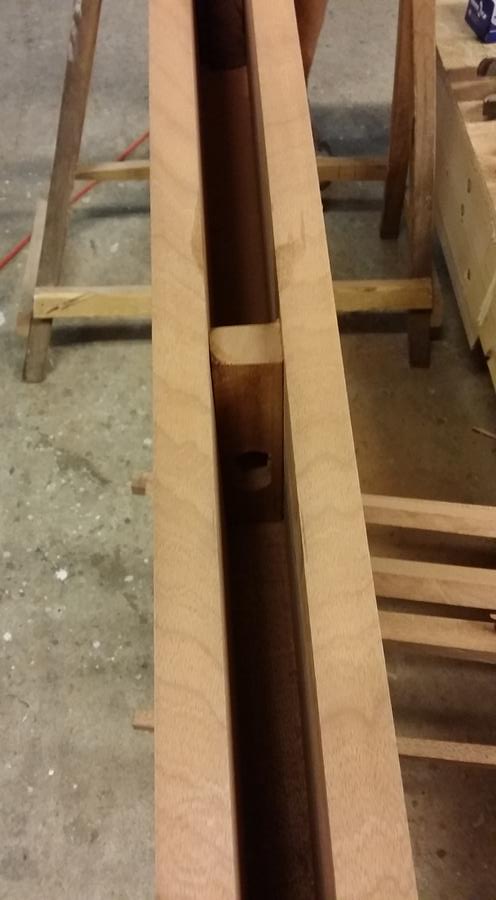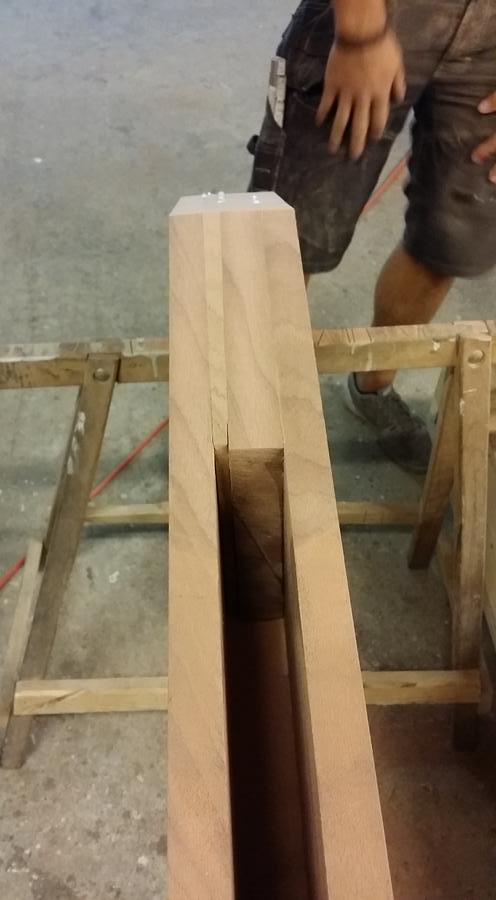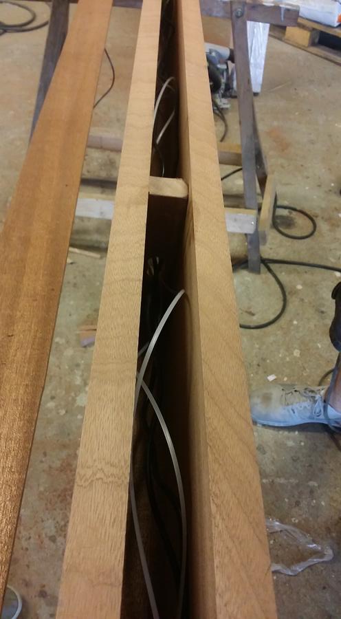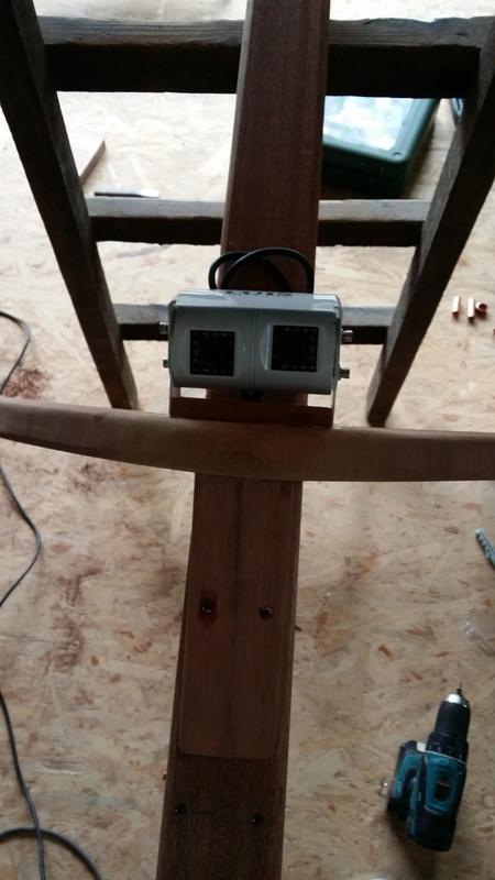 Anschließend wurden alle 4 Seiten miteinander verleimt und geschraubt, natürlich nachdem die Kabel eingezogen waren. Jeweils eines für das Toplicht, Ankerlicht und die Kamera. Im unteren Drittel des Mastes haben wir den Mast mit Brettern „gefüttert“ um ihn aus Vollholz zu gestalten damit er ausreichend stark für die Befestigung im Mastfuß ist. Außerdem haben wir in der Mitte des Mastes einen Steg gebaut, um mehr Stabilität zu bekommen.