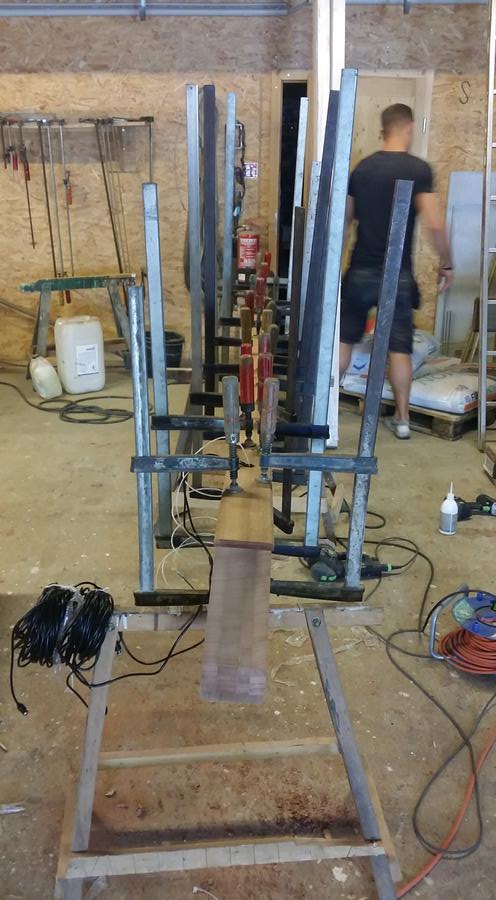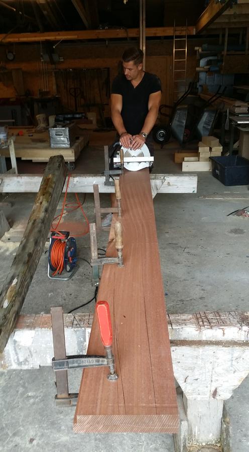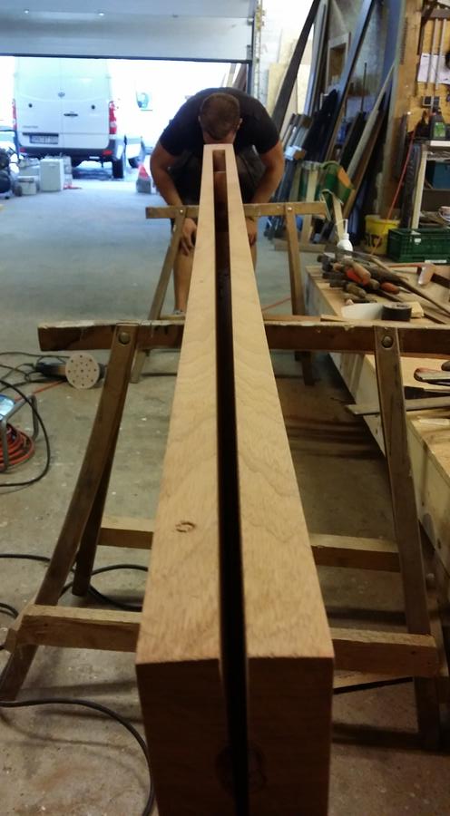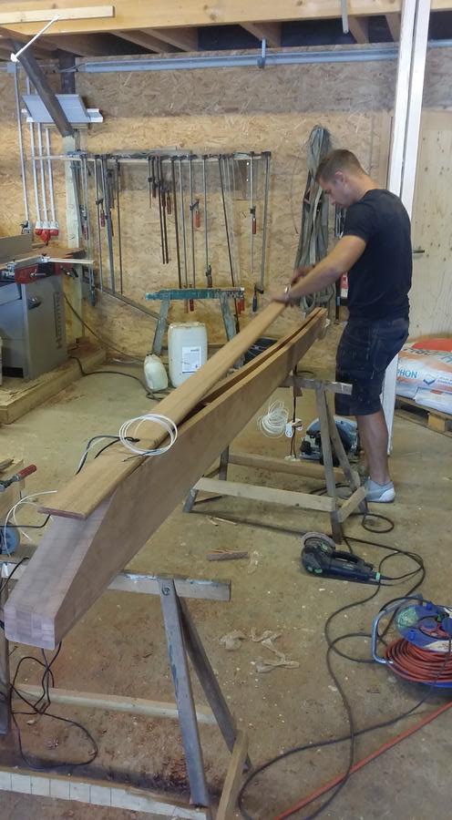 Er hatte jedenfalls bessere Kennnisse über die handwerklichen Arbeiten. Außerdem war er glaube ich ziemlich angefixt vom Thema Boot. Und ich war ziemlich angefixt von seiner Arbeitsmoral. Jedenfalls fiel es mir nicht schwer auf einen Freund zu kommen, der mir helfen würde einen neuen Mast für den Treuen Gesellen zu bauen. Und Leon war sofort dabei. Mal was Neues für ihn. Wir mieteten uns in einer Werkstatt eines Freundes von ihm ein. Ich hatte zwei Tage frei und so begannen wir in der früh. Ausgangsmaterial waren 2 fette Bohlen Vollholz Mahagoni. Mir wird noch heute Schlecht beim Anblick des m³-Preises. Doch lest selbst aus dem Bericht des Boote-Forum: