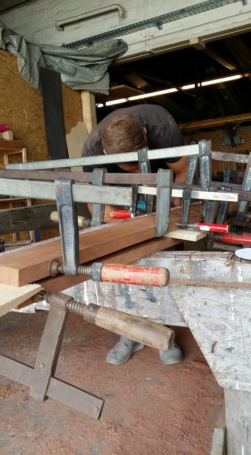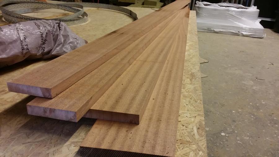 Wir haben Stammware Mahagoni verarbeitet. Die Bohlen waren beide circa 4 cm stark. Diese wurden erstmal runtergehobelt auf 3 cm um eine glatte Oberfläche zu erhalten. Die beiden Seitenteile des Mastes wurden zurechtgeschnitten und bereit gelegt. Die Stirn- und Rückseite haben wir noch etwas dünner gehobelt, um sie biegsamer zu machen.