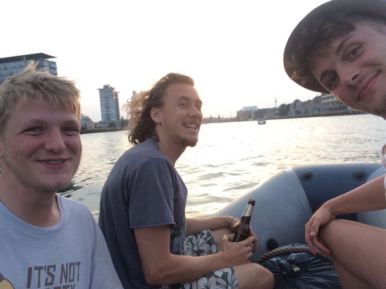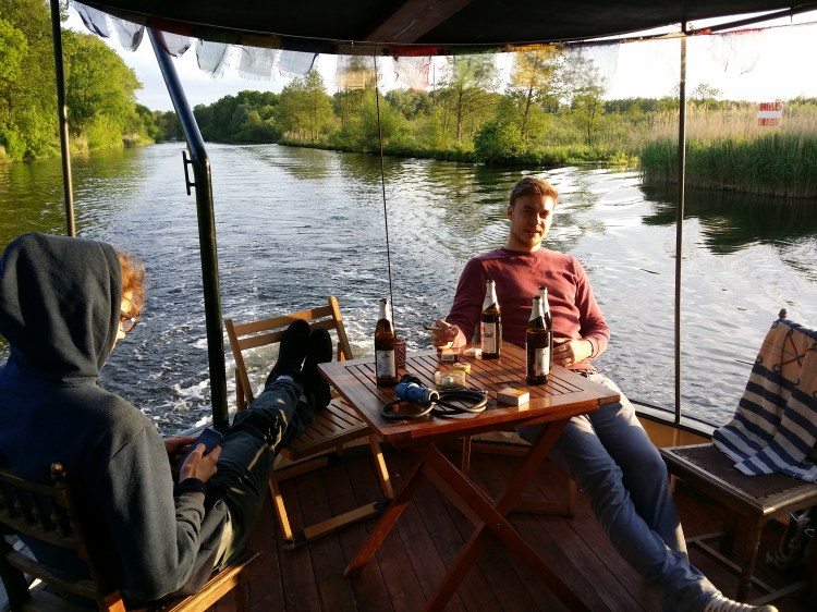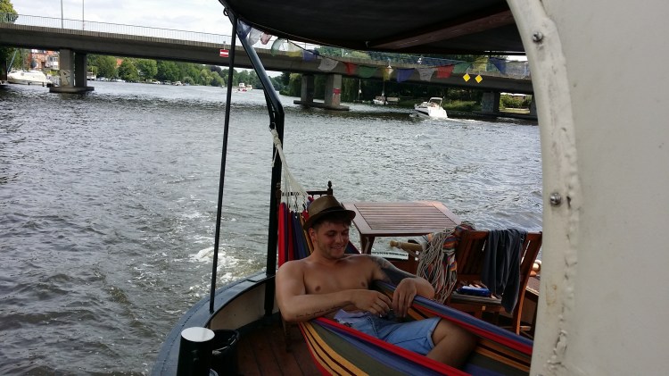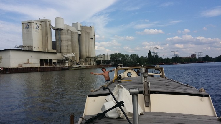Mit zweien meiner fleißigsten Helfer, plante ich dann auch die erste Tour. Komplettes Neuland. Alleine dieses riesen Boot steuern. Flori und Sandro sollten sich um die Fender und Leinen kümmern und aufpassen, dass ich nirgends gegen rausche. Ich sagte mir bei dem Ablegemanöver: „Immer schön ruhig. Keine Hektik. Lass dir Zeit.“ Und so klappte das wunderbar. Schon waren wir raus aus der Box und setzten unseren Kurs Richtung Müggelsee. Wir fuhren durch Klein-Venedig und bekamen das Grinsen gar nicht mehr aus dem Gesicht. Prompt war die Hängematte gespannt und wir genossen das Wetter. Geplant war ein Wochenende an der Rummelsburger Bucht. Dort wo ich fast ein Boot gekauft hätte.