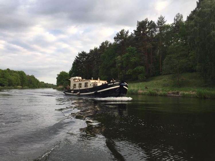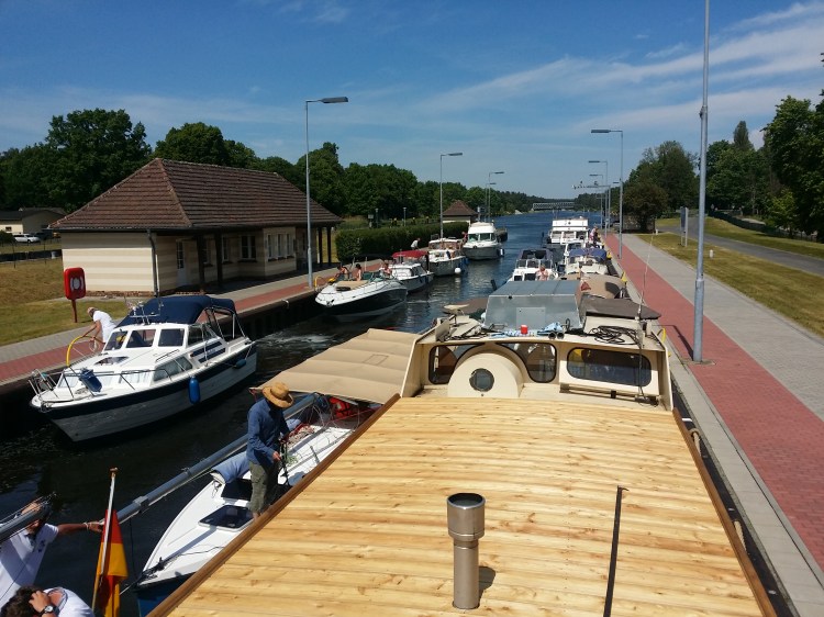 Dann kam unsere Abzweigung. Bei Marienwerder ging es Richtung Norden auf den Werbellinkanal. Was für ein Unterschied. Und wie schmal das ist. Oh Gott. Wenn uns hier einer entgegenkommt. An einer Schleuse traf ich dann ein Forumsmitglied vom Boote-Forum. Wir grüßten einander. Kurzer Schnack. Und nach unserer Rückkehr fand ich ein Foto des Treuen Gesellen in meinem Thread. Danke.