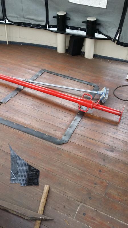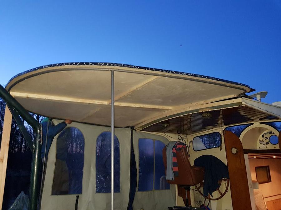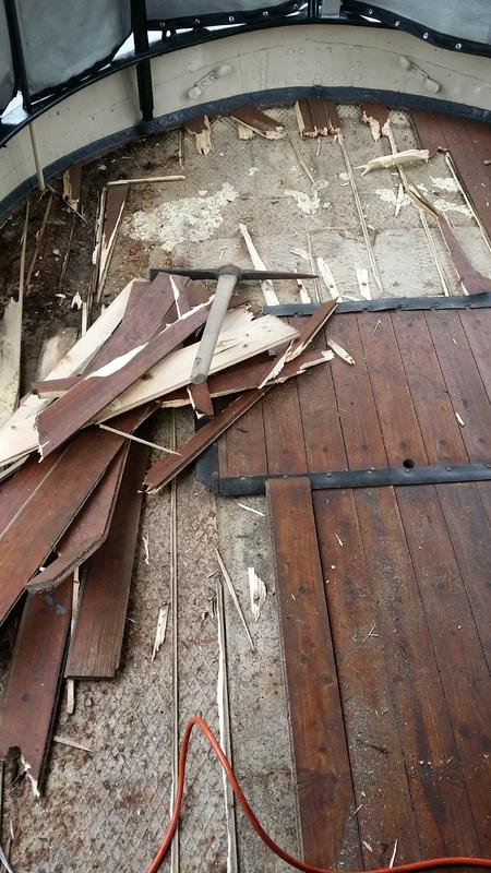 Nachdem ein Schweißer einen zweiten Davit (Kran) zur Besfestigung des Beibootes angefertigt und montiert hatte, passte die Persenning nicht mehr und der Umbau konnte beginnen. Wie so oft mit der Demontage: Holzboden raus, Dach ab und die Luke weg.