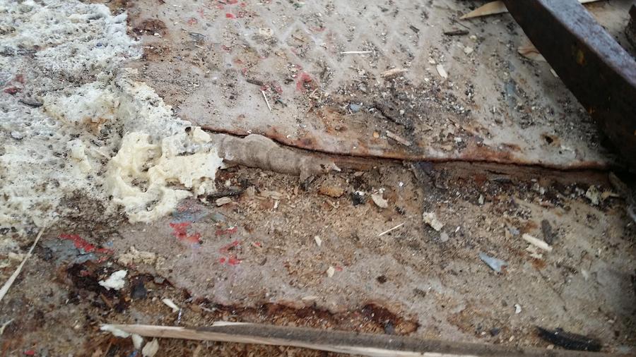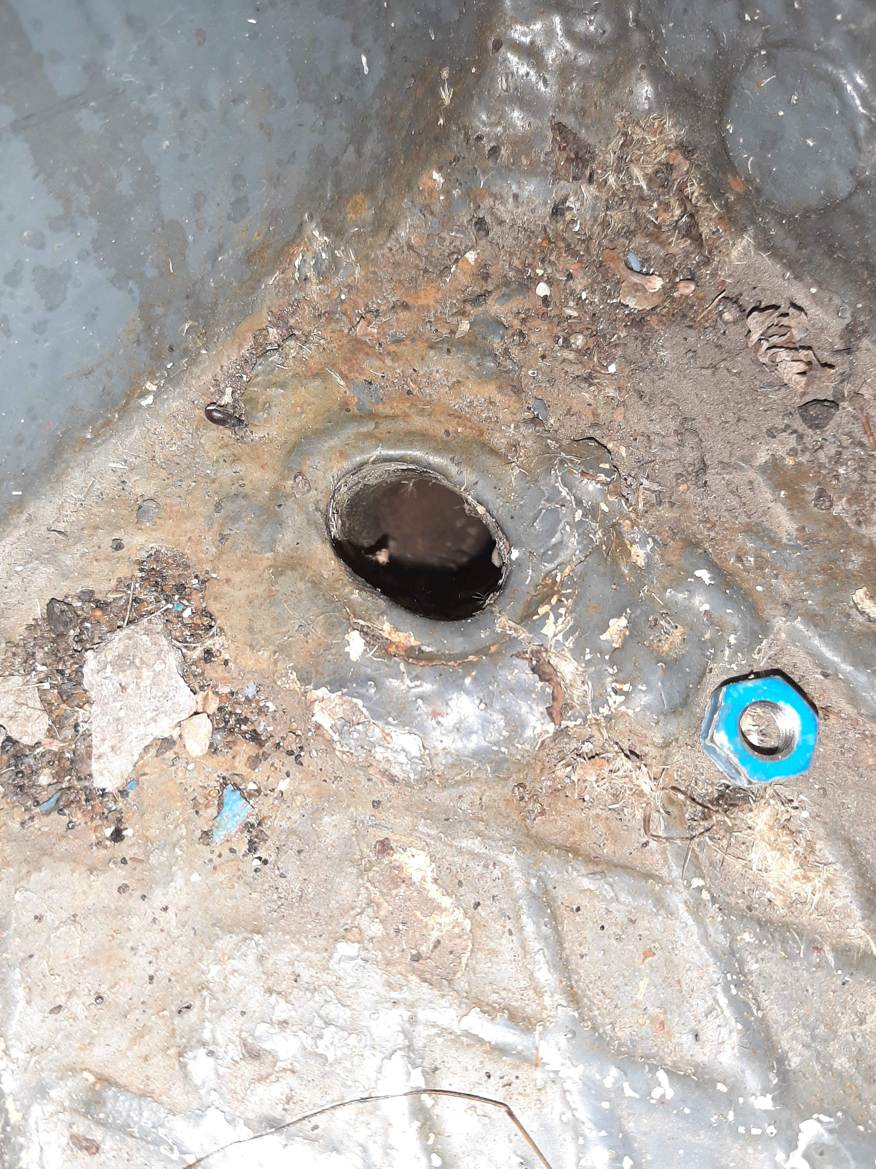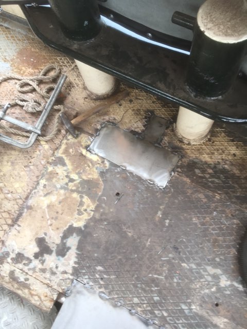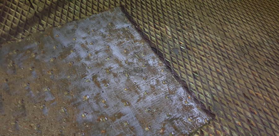 Der Boden wurde mit Schrauben in das Stahldeck geschraubt. Das hatte zur Folge, dass sich Wasser seinen Weg entlang der Schrauben durch das Holz, entlang der Schrauben bis zum Motorraum suchen konnte. Dementsprechen viel Rost gab es auf dem Stahl. Teilweise waren einzelne Platten so marode, dass sie ersetzt werden mussten. Auch die ganzen kleinen Bohrlöcher mussten zugeschweißt werden. Dann der nächste Schock – einer der Vorbesitzer hatte versucht die Vertiefungen des Riffelblechbodens mit einer Epoxymasse auszugleichen. So richtig funktioniert hat das nicht. Die Folg: noch mehr Rost und eine Menge Arbeit für uns. Denn diese Epoxymasse galt es wieder zu entfernen. Nach einigen Versuchen mit verschiedenen Werkzeugen, darunter auch teure Tercoo-Scheiben, entschieden wir uns für die Flex mit Drahtbürstenaufsatz. Naja ihr könnt euch denken, dass das eine der weniger beliebten Arbeiten war und mehrere Tage beanspruchte.