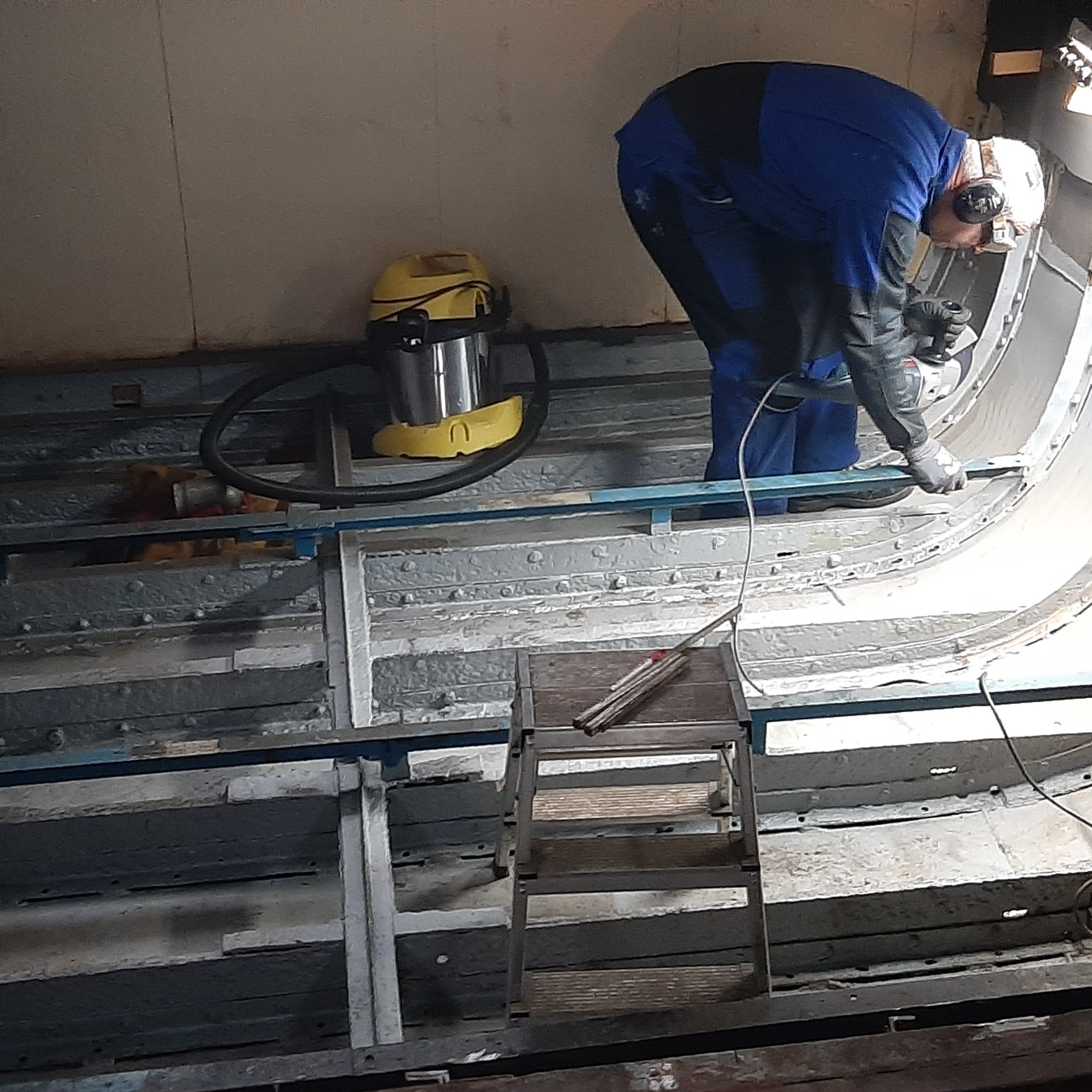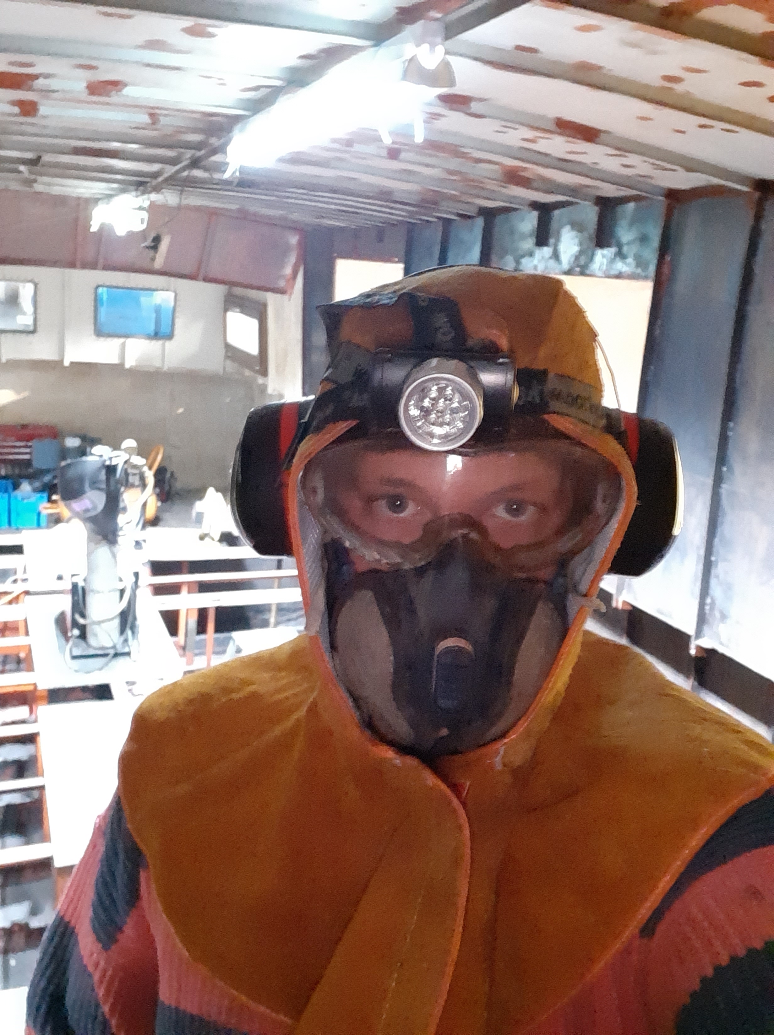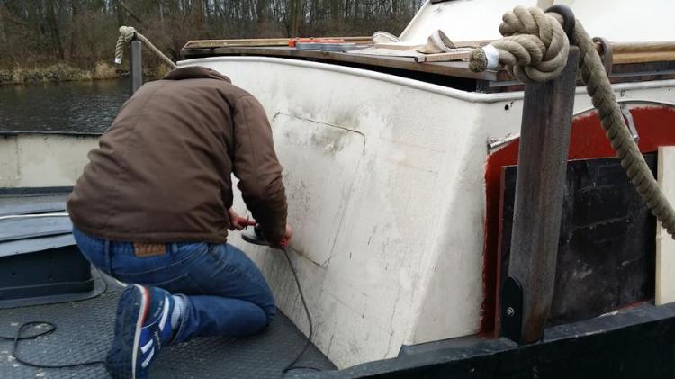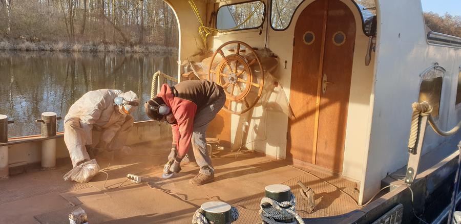 Im Innenraum haben wir zunächst die alte Farbe und den losen Rost von den Innenwänden mit der Flex abgeschliffen. Das war bis dato die unangenehmste Arbeit am Boot. Man bekam keine Luft, schwitzte und man kam nur mühsam voran. Doch Dank der Hilfe von Claras Bruder war auch diese Arbeit irgendwann beendet.