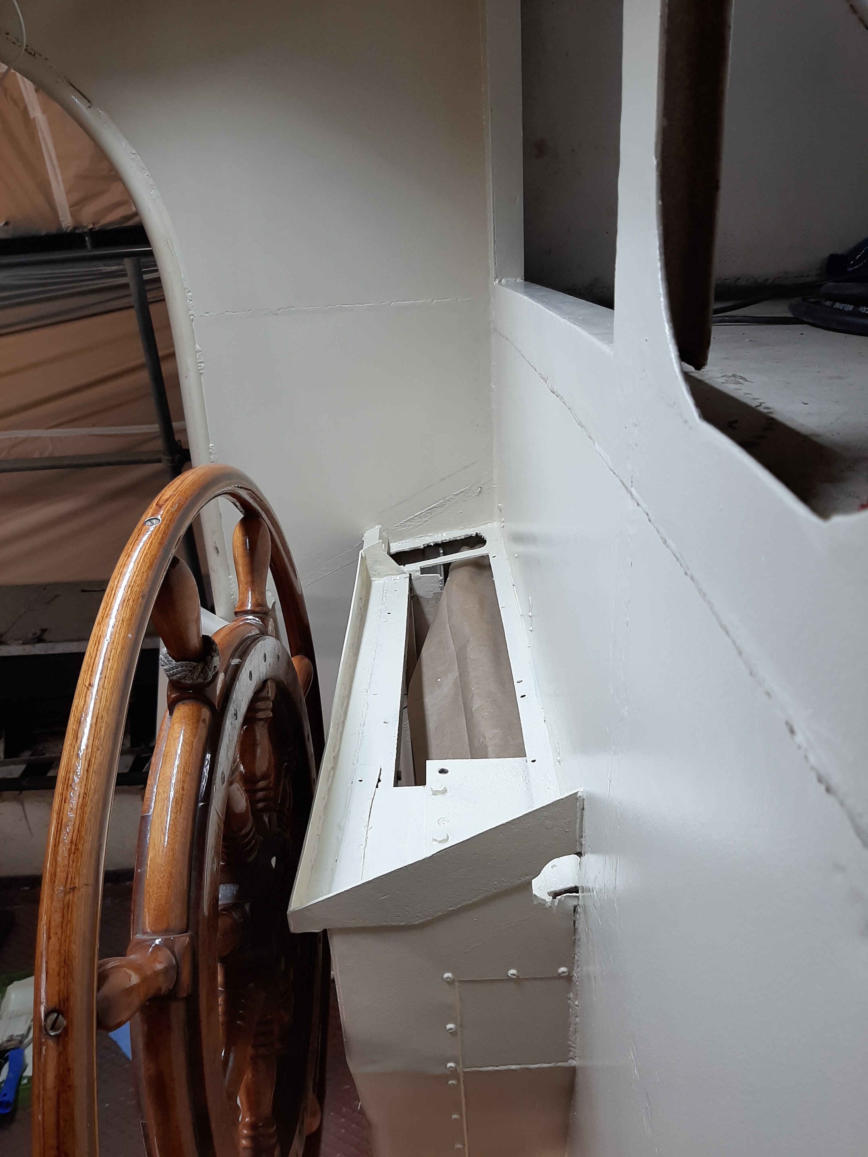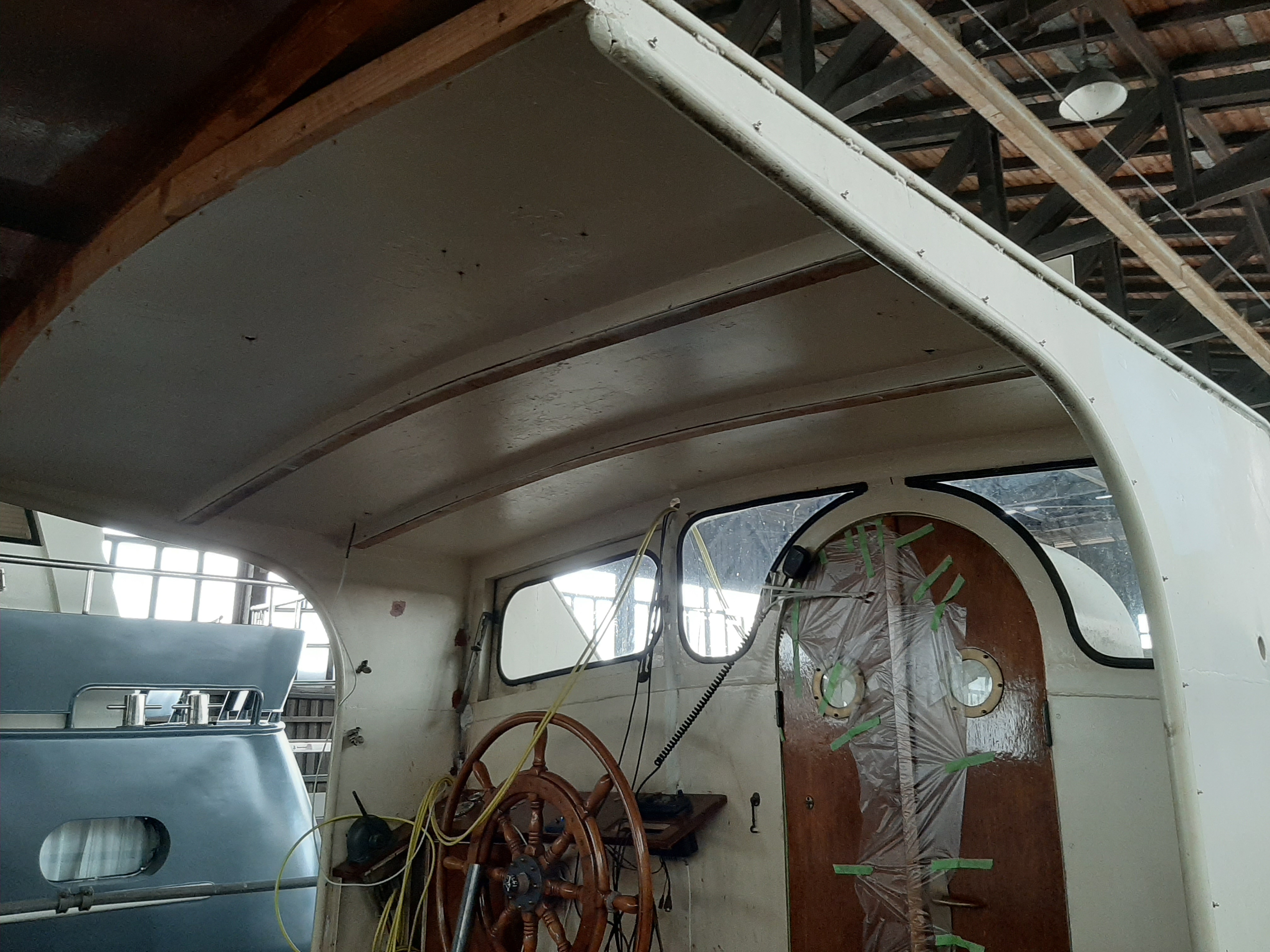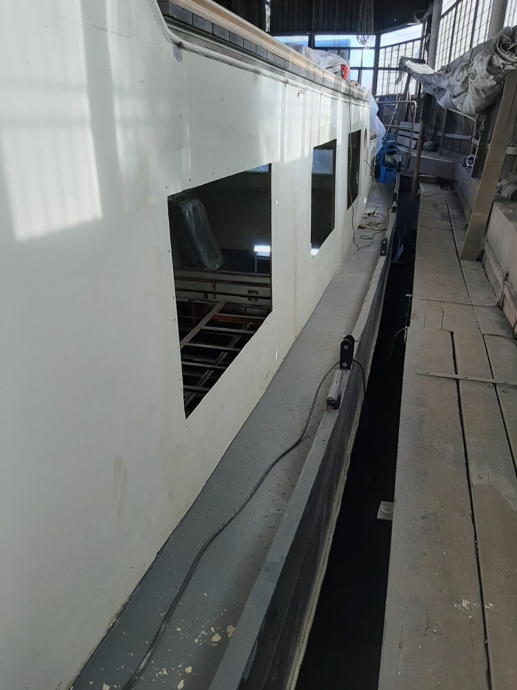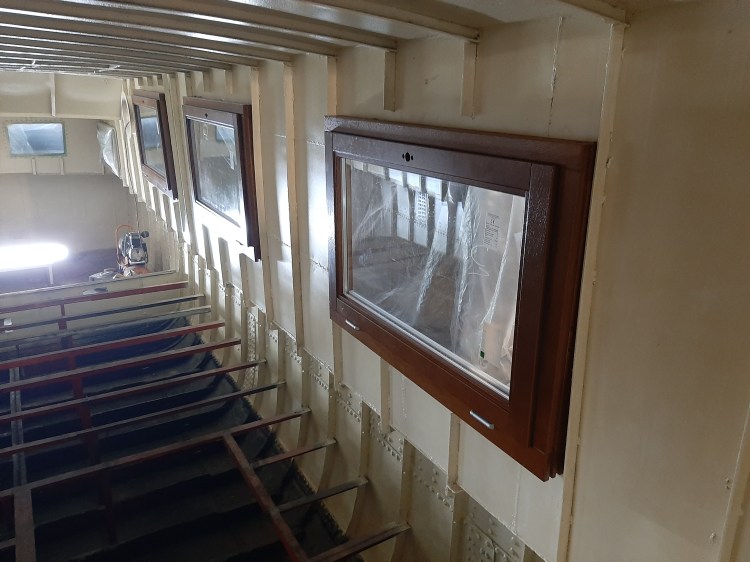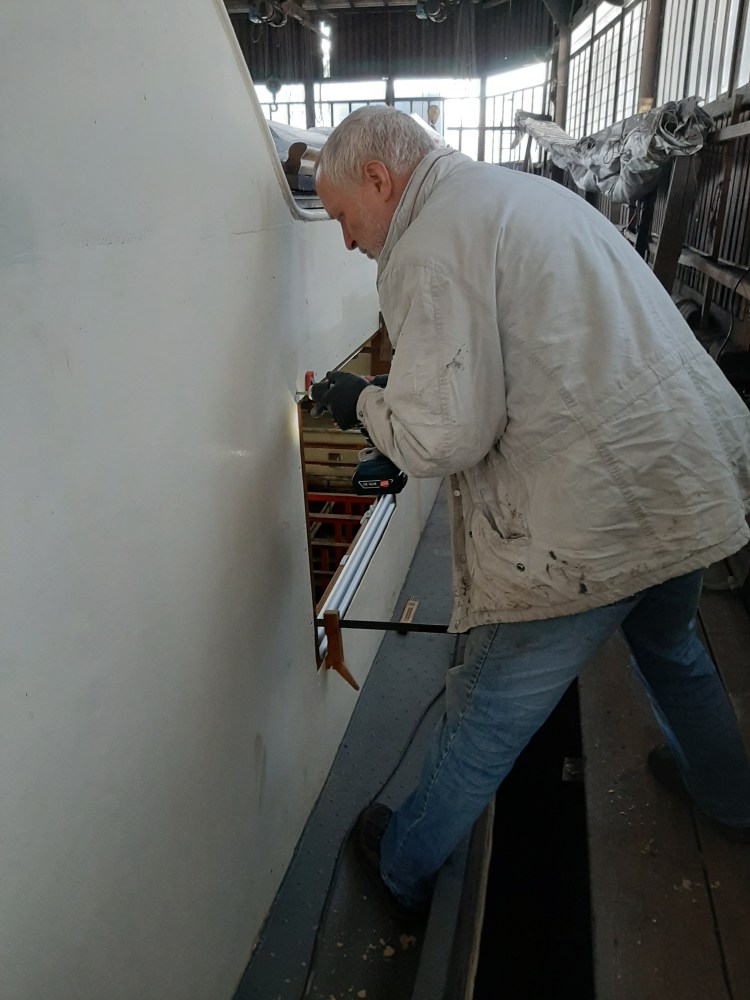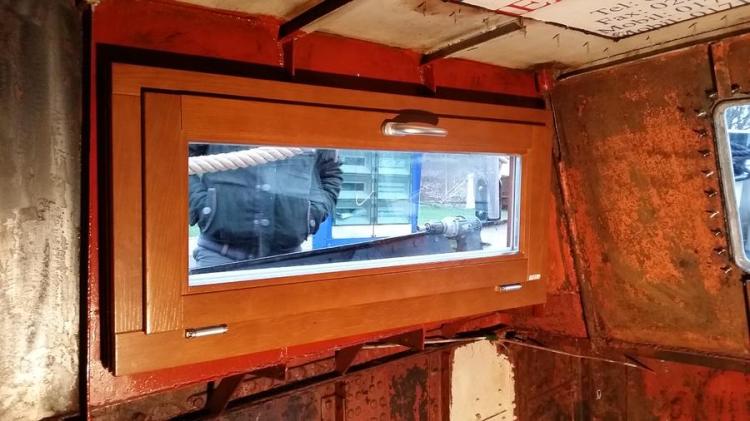 Der Fenstereinbau erfolgte in 2 Phasen. Die neue Eignerkabine wurde bereits im Jahr 2018 mit 2 neuen Bullaugen und 2 neuen Doppelverglasten Holzfenstern ausgestattet. Die Fenster haben uns so gut gefallen, dass wir sie etwas größer, auch für das Mittschiff bestellten. Die Montage der Fenster im Mittschiff erfolgte erst nach Lackierung der Bordinnenwände. Ein echter Meilenstein. Der Gesell ist wieder geschlossen. Ich erhoffe mir davon, dass auch im Winter im Innenraum weitergearbeitet werden kann. Die Fenster wurden in Polen nach eigenen Angaben hergestellt. Die Qualität ist sehr gut – bei Interesse gebe ich gerne den Kontakt weiter.