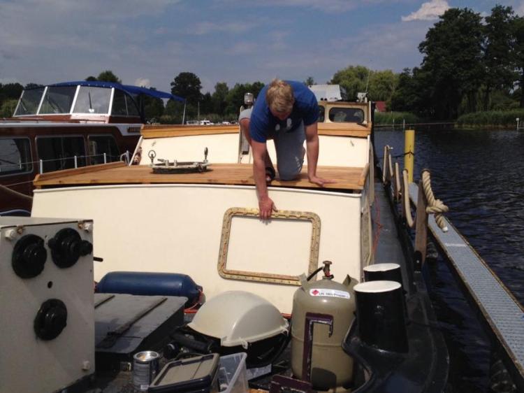 Das Achterdeck. Der Bereich wo der Schiffsführer während der Fahrt die meiste Zeit verbringt. Aber auch bei schlechtem Wetter, oder nettem Beinandersitzen ein schöner Fleck auf dem Treuen Gesellen.Von hier aus gelangt man außerdem in den Motorraum. Ein Bereich mit vielen Aufgaben. Beim Kauf war ein Holzboden in das Deck verschraubt. Die Luke des Motorraums war billlig abgedichtet und generell störte mich so Einiges am Achterdeck.