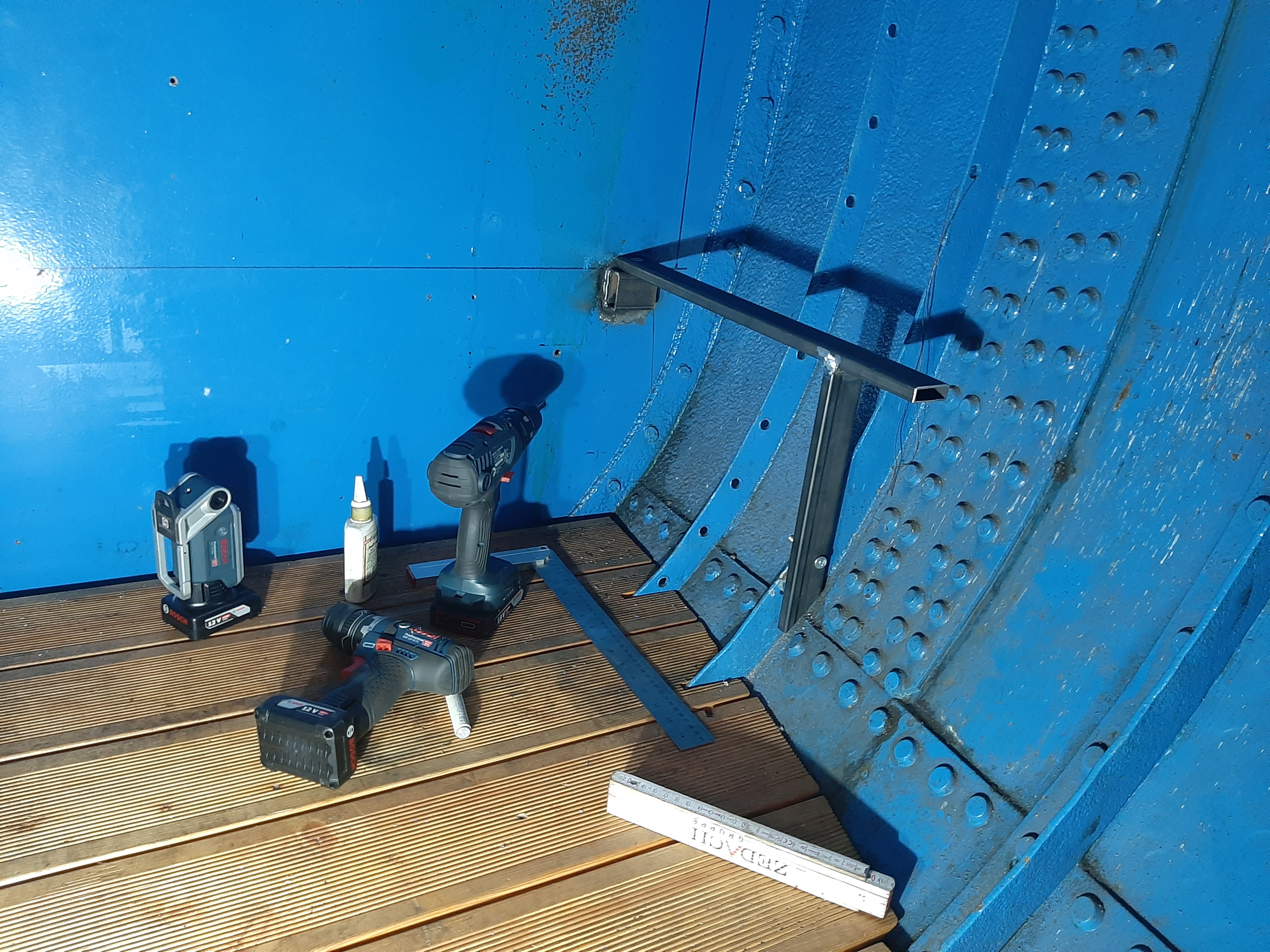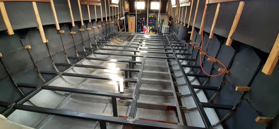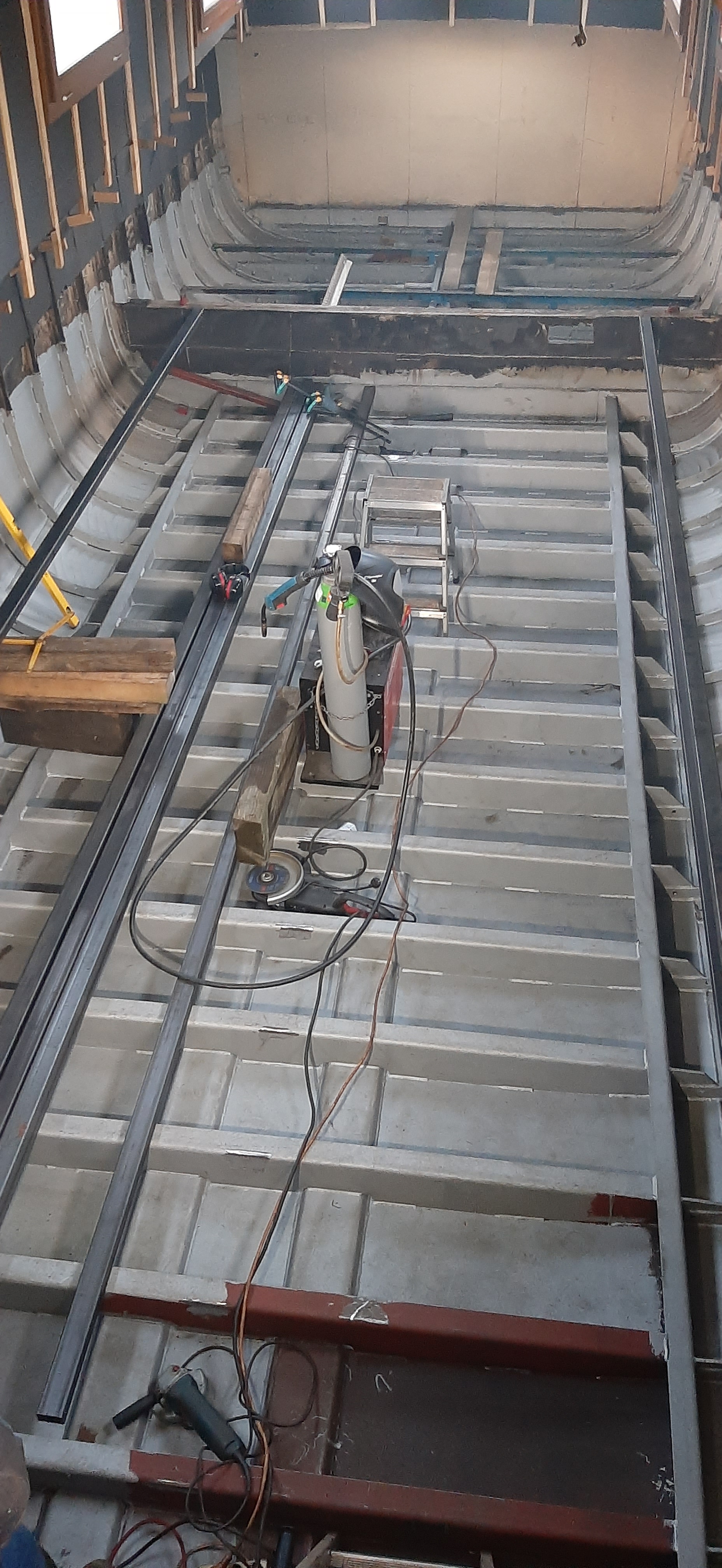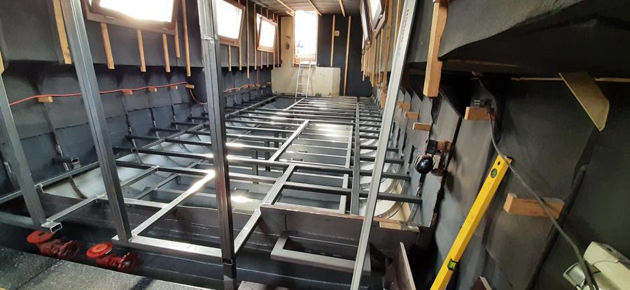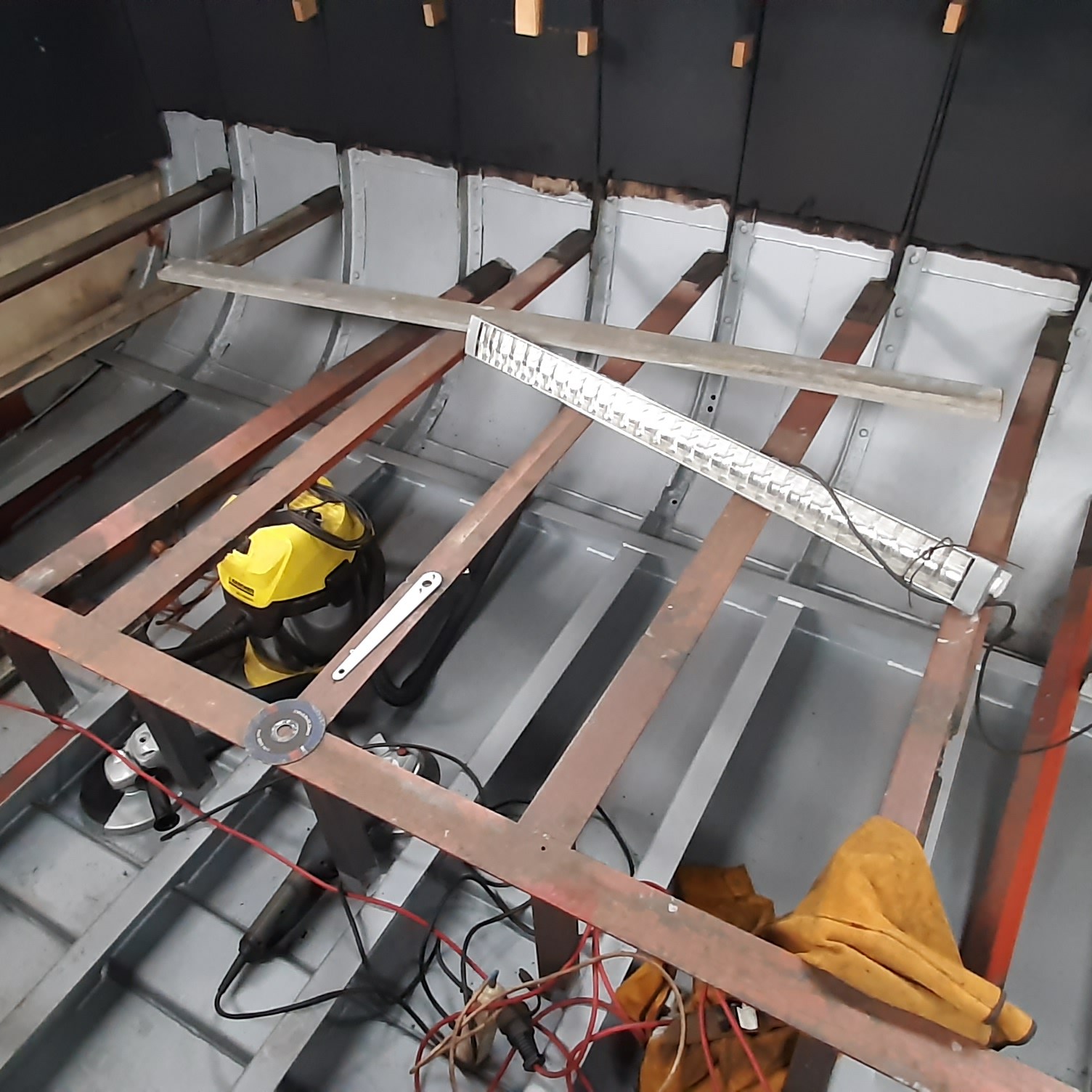 Der Zwischenboden wird doch nochmal knapp 10 cm abgesenkt, um etwas mehr Stehhöhe zu gewinnen. Das Angebot der Werft für die Arbeit war uns zu teuer und wir haben mal wieder Lust aufs Schweißen.