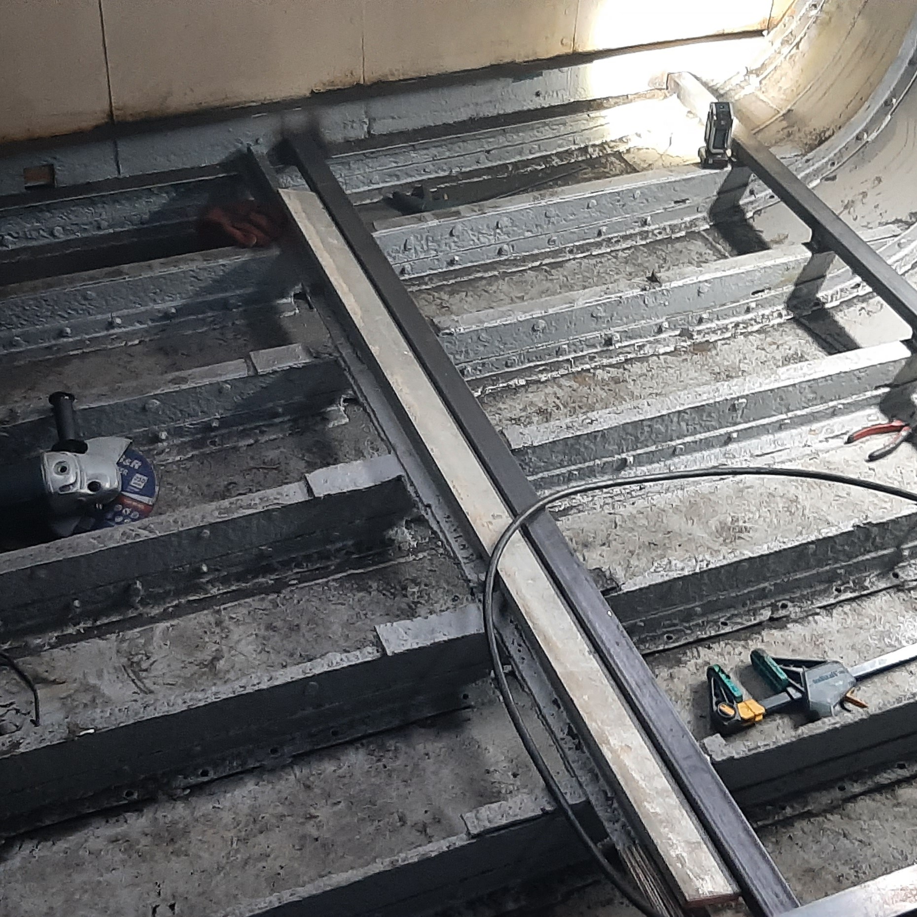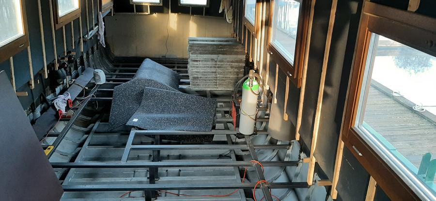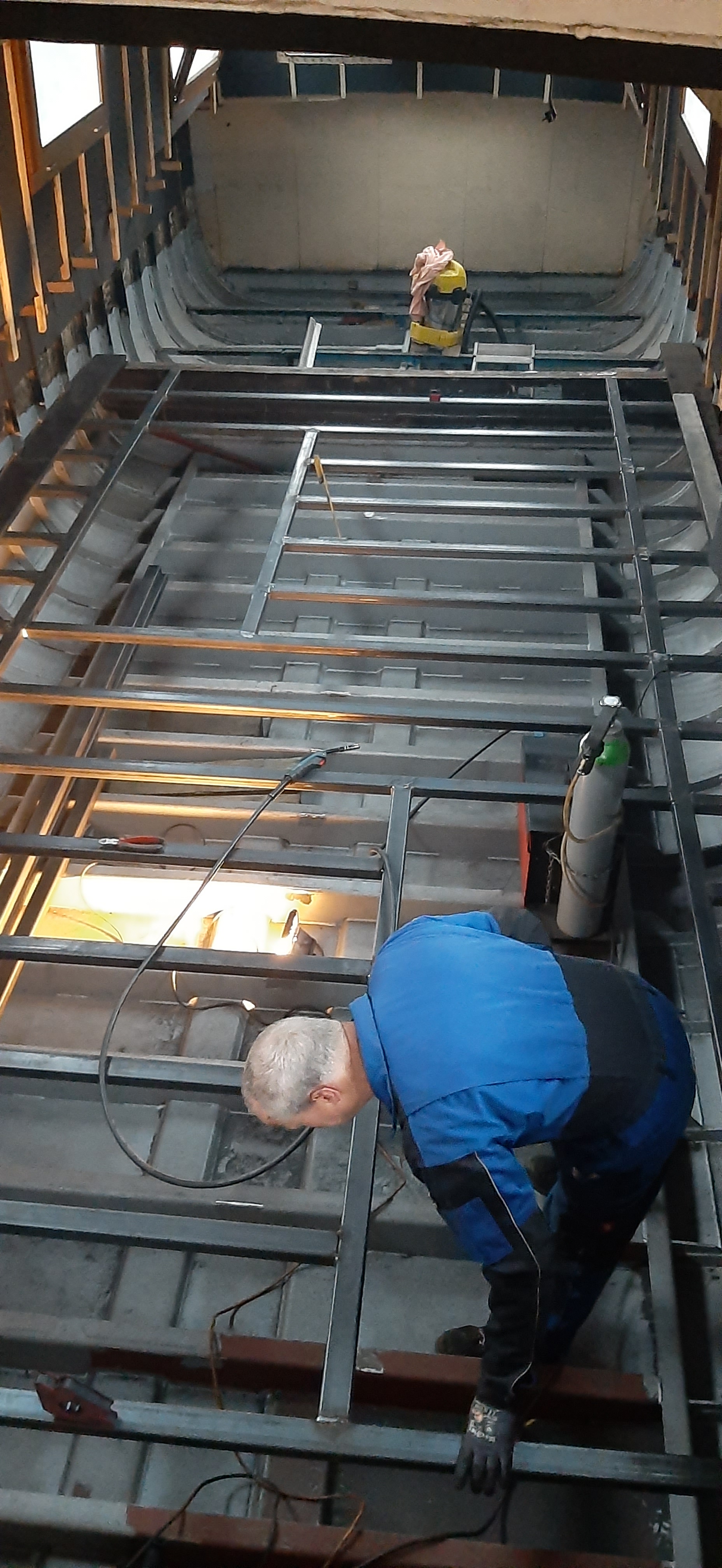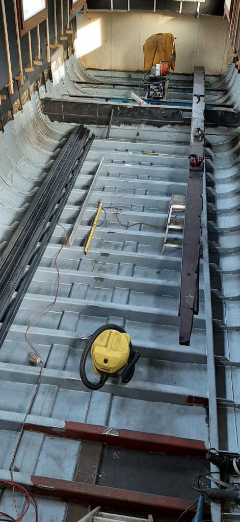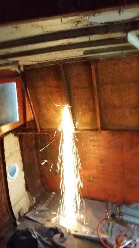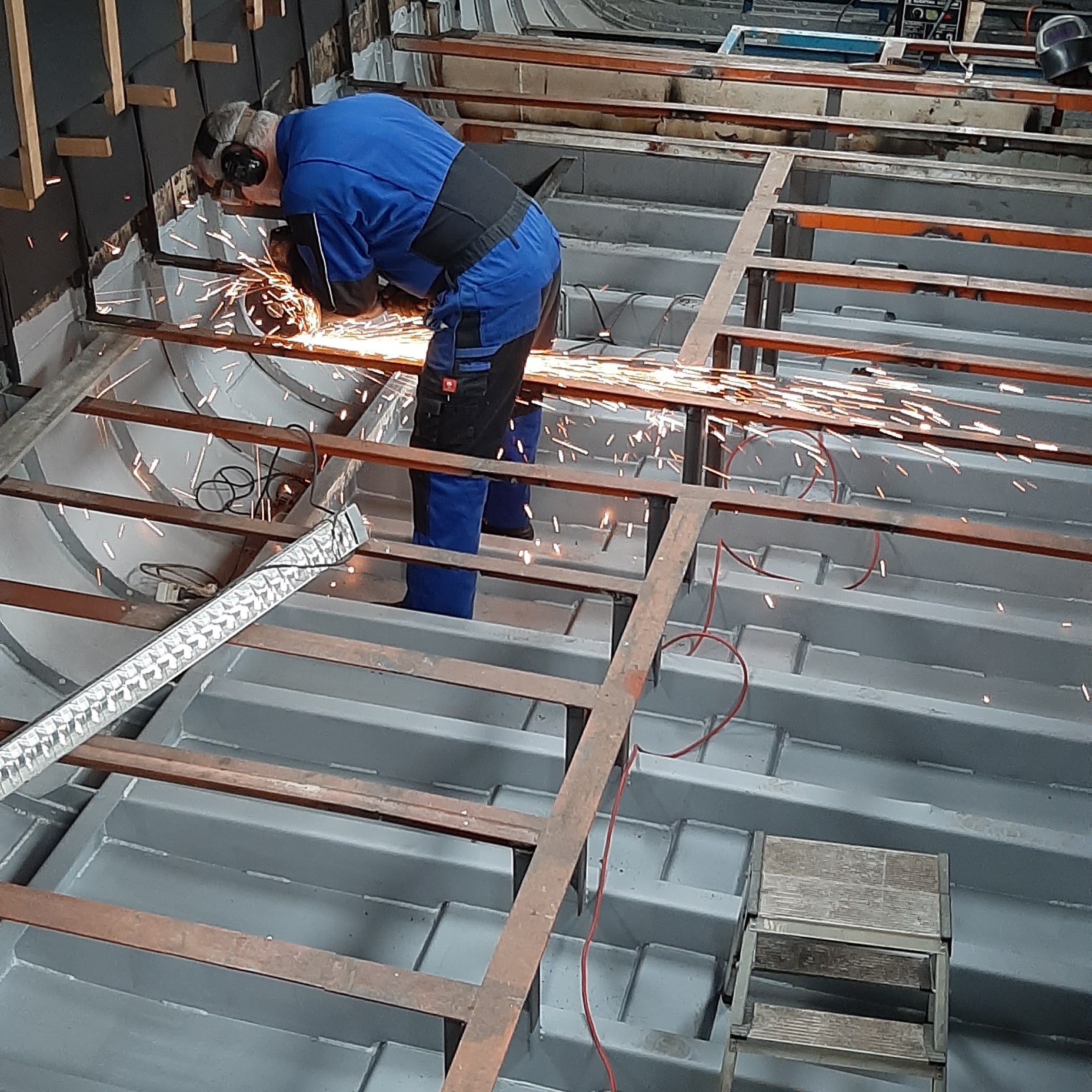 Der Zwischenboden wird doch nochmal knapp 10 cm abgesenkt, um etwas mehr Stehhöhe zu gewinnen. Das Angebot der Werft für die Arbeit war uns zu teuer und wir haben mal wieder Lust aufs Schweißen.
