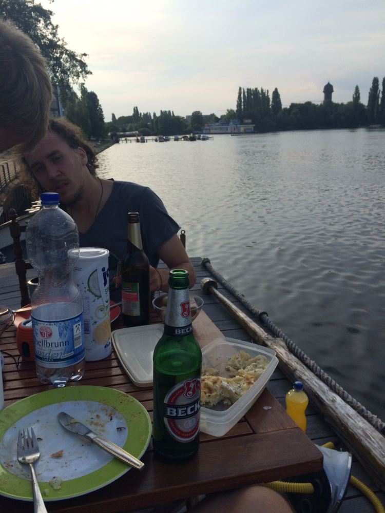 Keine 10 Minuten später erreichten wir die Rummelsburger Bucht. Wir legten ein 1A Anlegemanöver hin und klatschten mit breiter Brust ab. Ziel erreicht. Alle Finger dran. Sonnenuntergang. Wir schmissen den Grill an und setzten uns auf die Dachterrasse und speisten fürstlich.