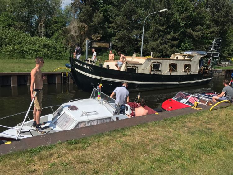 Kurze Dusche und wir konnten ablegen. „Pflong“ – die Kronkorken flogen nur so durch die Gegend. Ich blieb gesetzestreu nüchtern. Wir waren insgesamt eine Truppe von gut 25 Mann, aufgeteilt auf 3 Boote. Ein Lotos 2 eines Freundes, einem weiteren Kajütboot eines Freundes mit Außenborder und eben der Treue Gesell. Unser Ziel war die Marina Liebenwalde. Da wir auf Grund der Arbeiten erst recht spät losgekommen sind, mussten wir bei Lehnitz irgendwo übernachten. Wir machten an einem Schubverband an der Malzer Werft fest. Hier kamen weitere Freunde an Bord und es wurde sich auf den nächsten Tag eingestimmt. Am nächsten Tag ging es dann früh weiter. Schon bald erreichten wir unseren Zielhafen. Ganz schön eng, aber mittlerweile konnten wir den Gesellen schon ganz gut manövrieren. Das Zauberwort lautet Leinenarbeit.