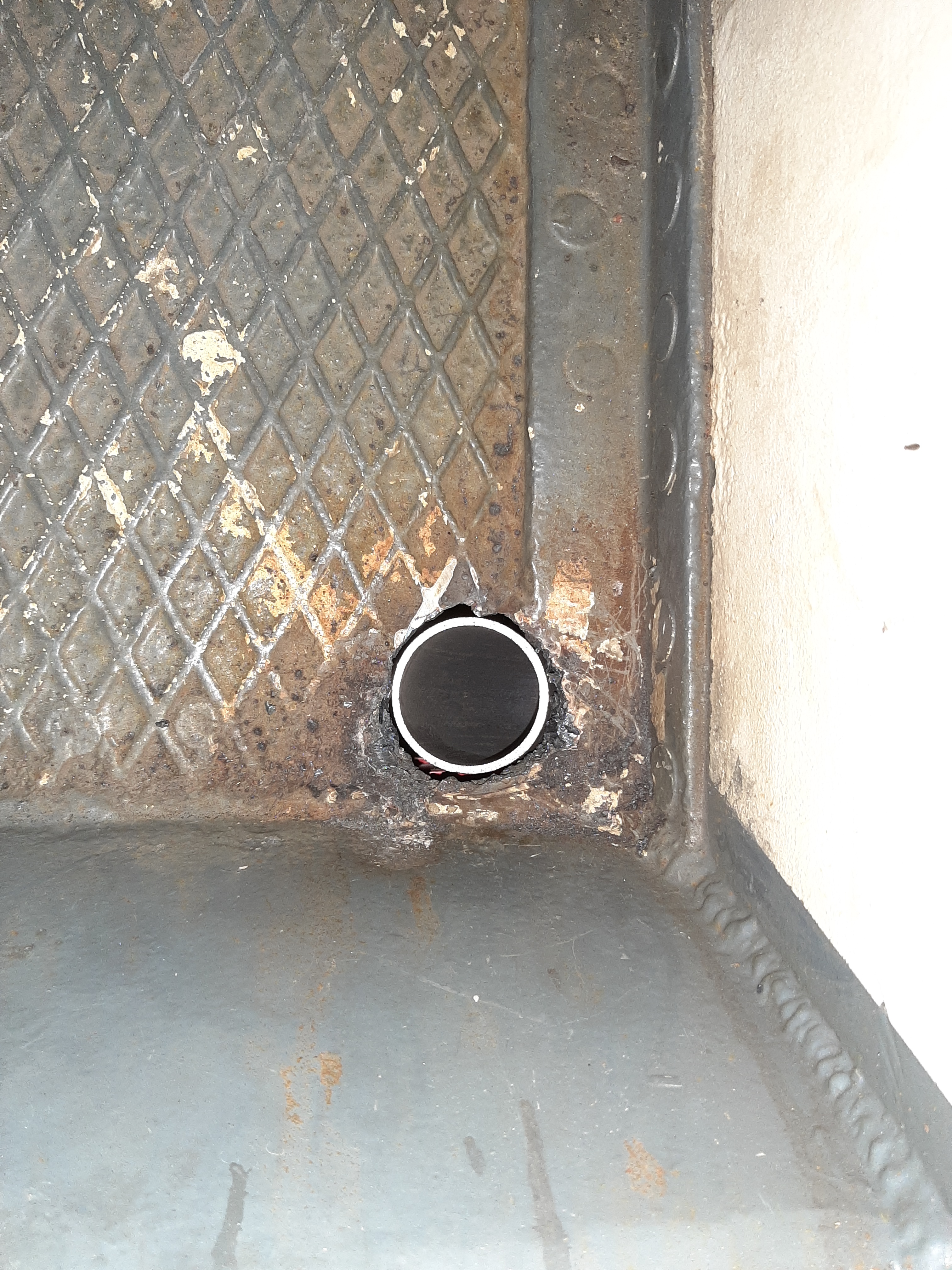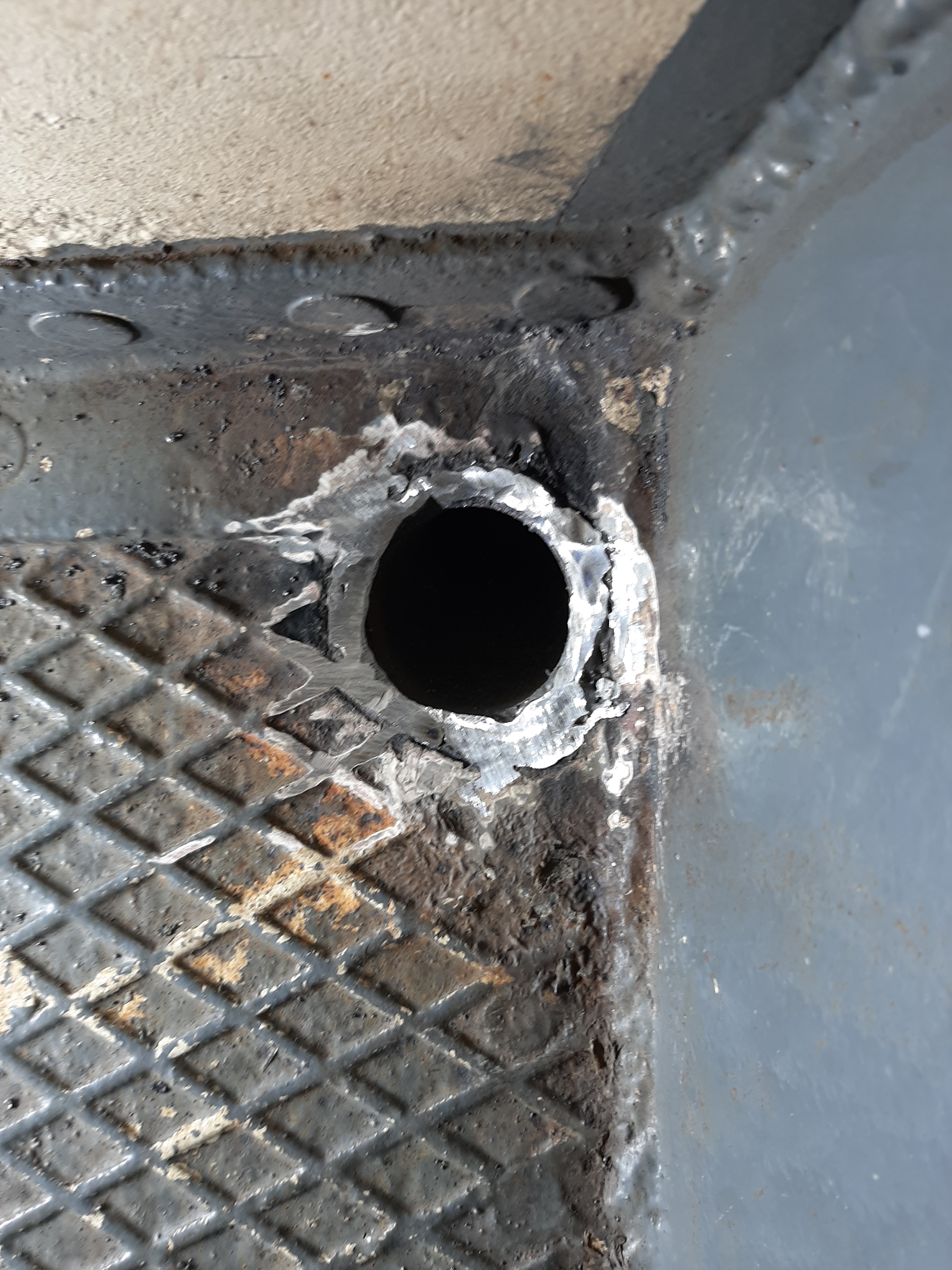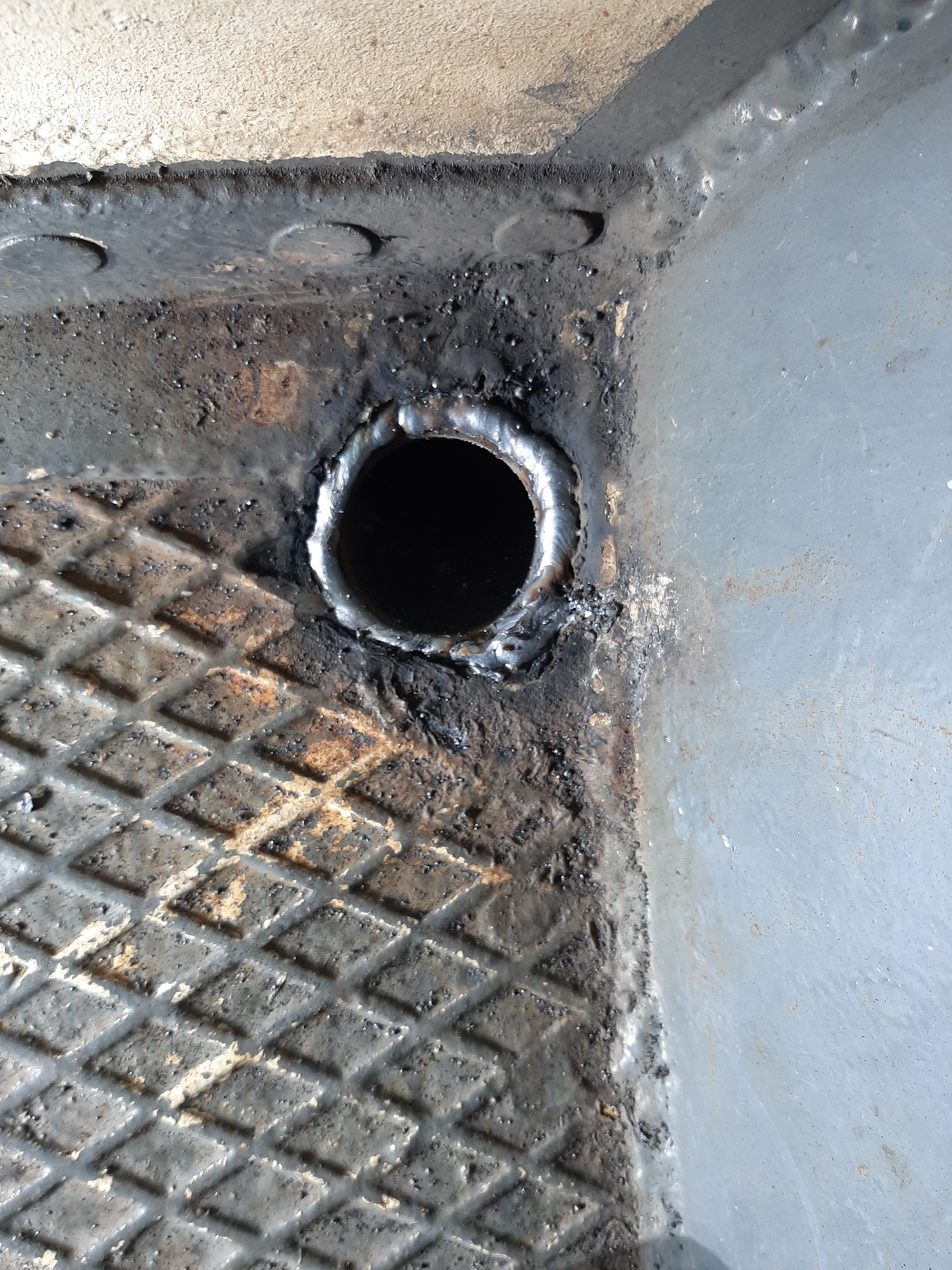 Danach galt es die alten Regenwasserabläufe im Vorschiff zu erneuern. In die alten, durchgerosteten hat irgendeine „Fachkraft“ ganz normale Gummischläuche rein gezwängt und diese mit reichlich Mumpe „dicht“ geschmiert. Das sah nicht nur furchtbar aus, sondern wäre bestimmt irgendwann undicht geworden. Ich habe die alten rausgeplasmat, dann 90° Bögen aus 3mm Stahl eingepasst und eingeschweißt. Die alten Durchlässe wurden dicht geschweißt und „schon“ war die nächste Spalte aus der To-Do-Liste gestrichen.
