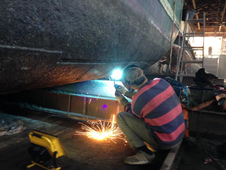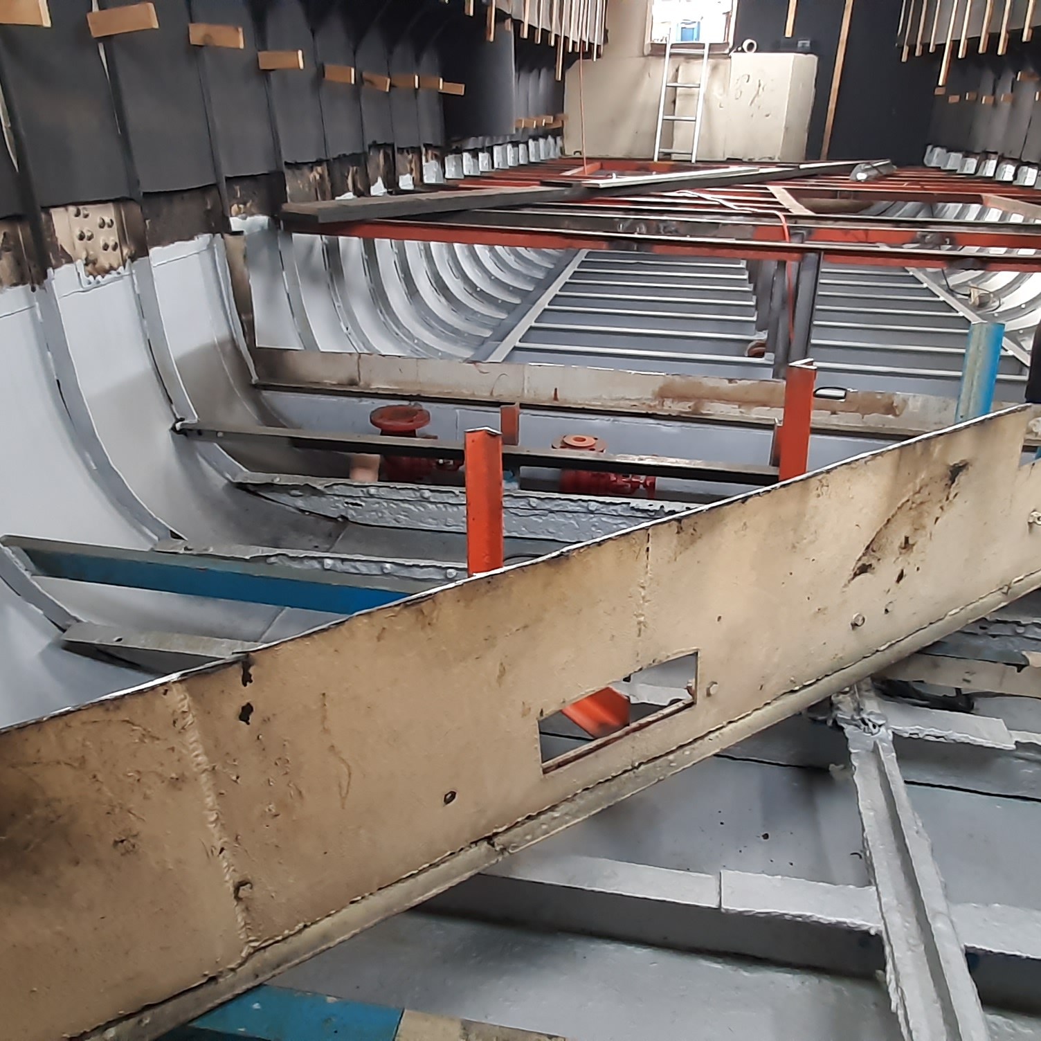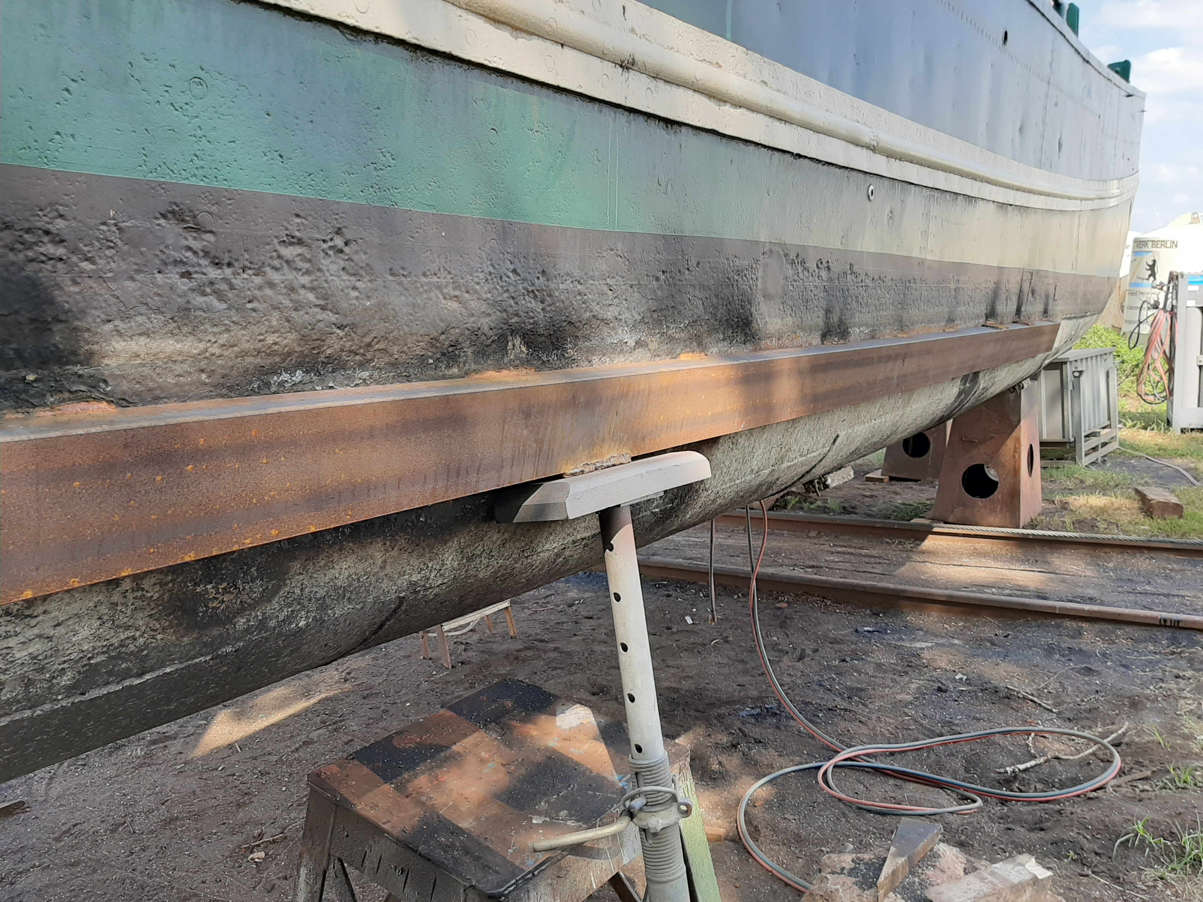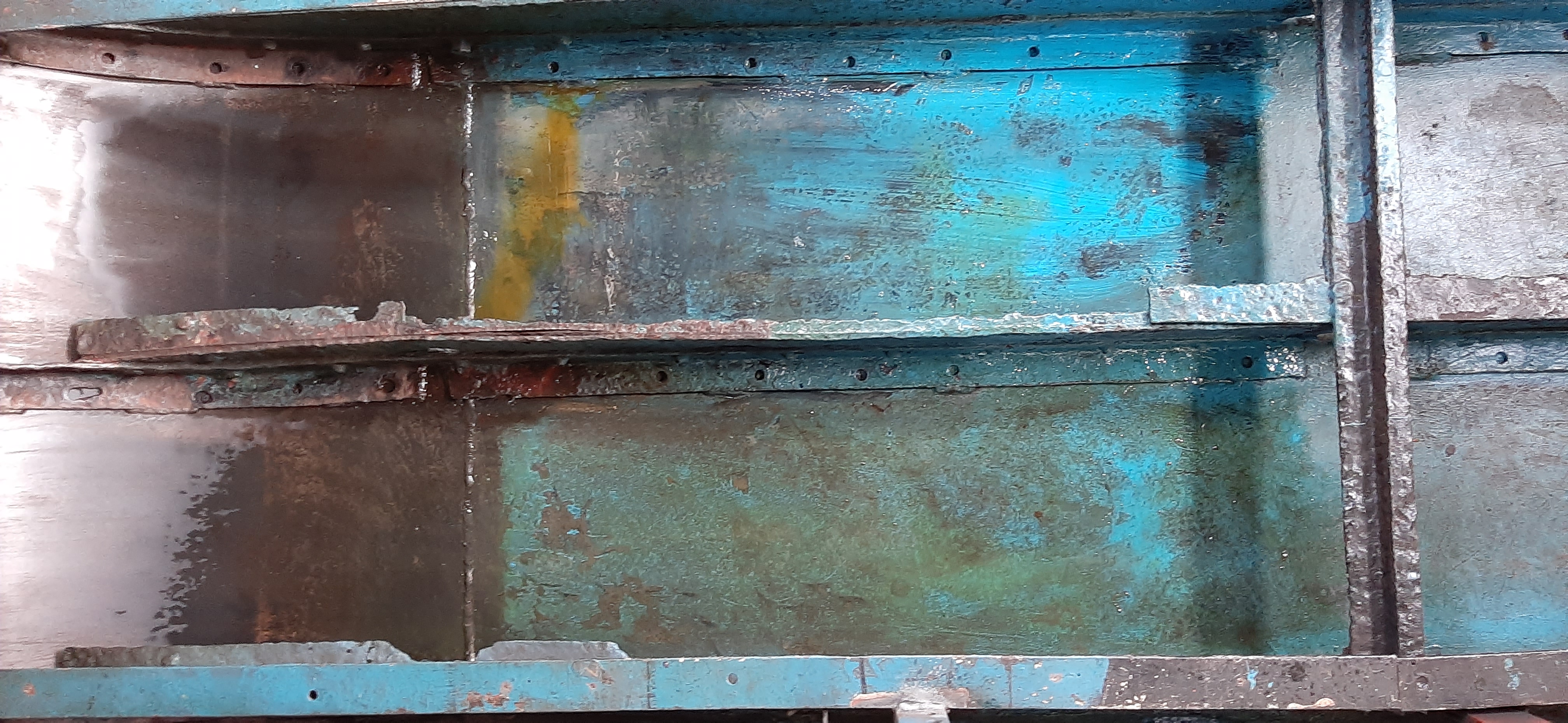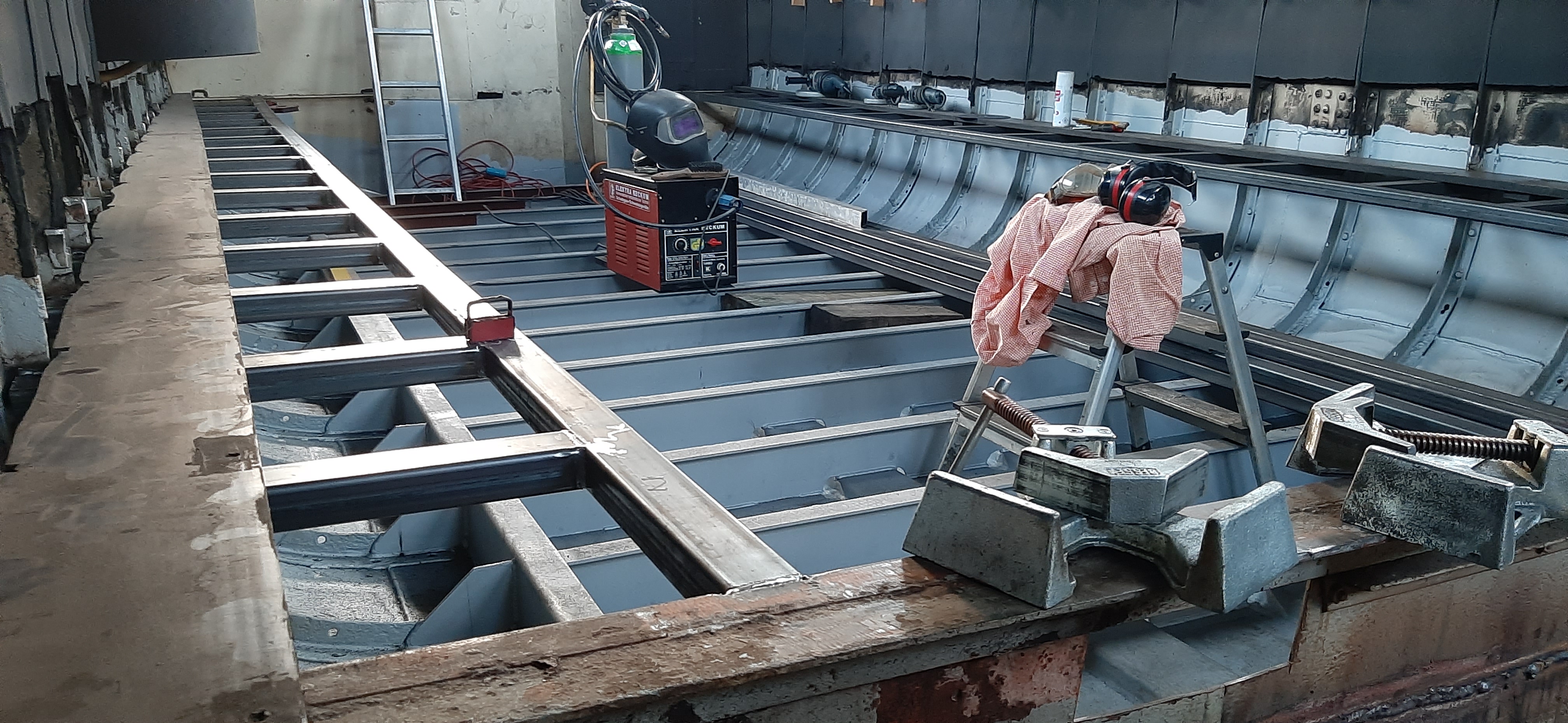 In der Zwischenzeit wurde der neue Boden, mit innen liegender Kühlschlange, gefertigt. Dieser wurde dann an die bestehenden Spanten angeschweißt. Die nun noch offenen Rundungen des Unterwasserschiffs wurden anschließend mit der Bordwand verbunden.