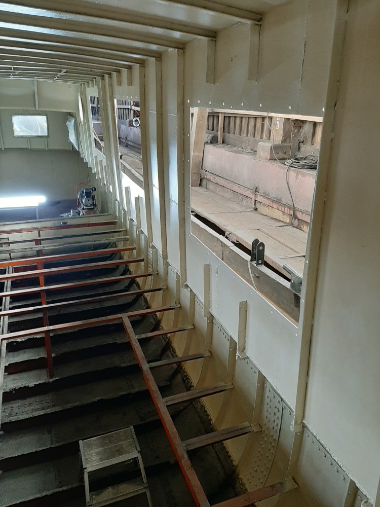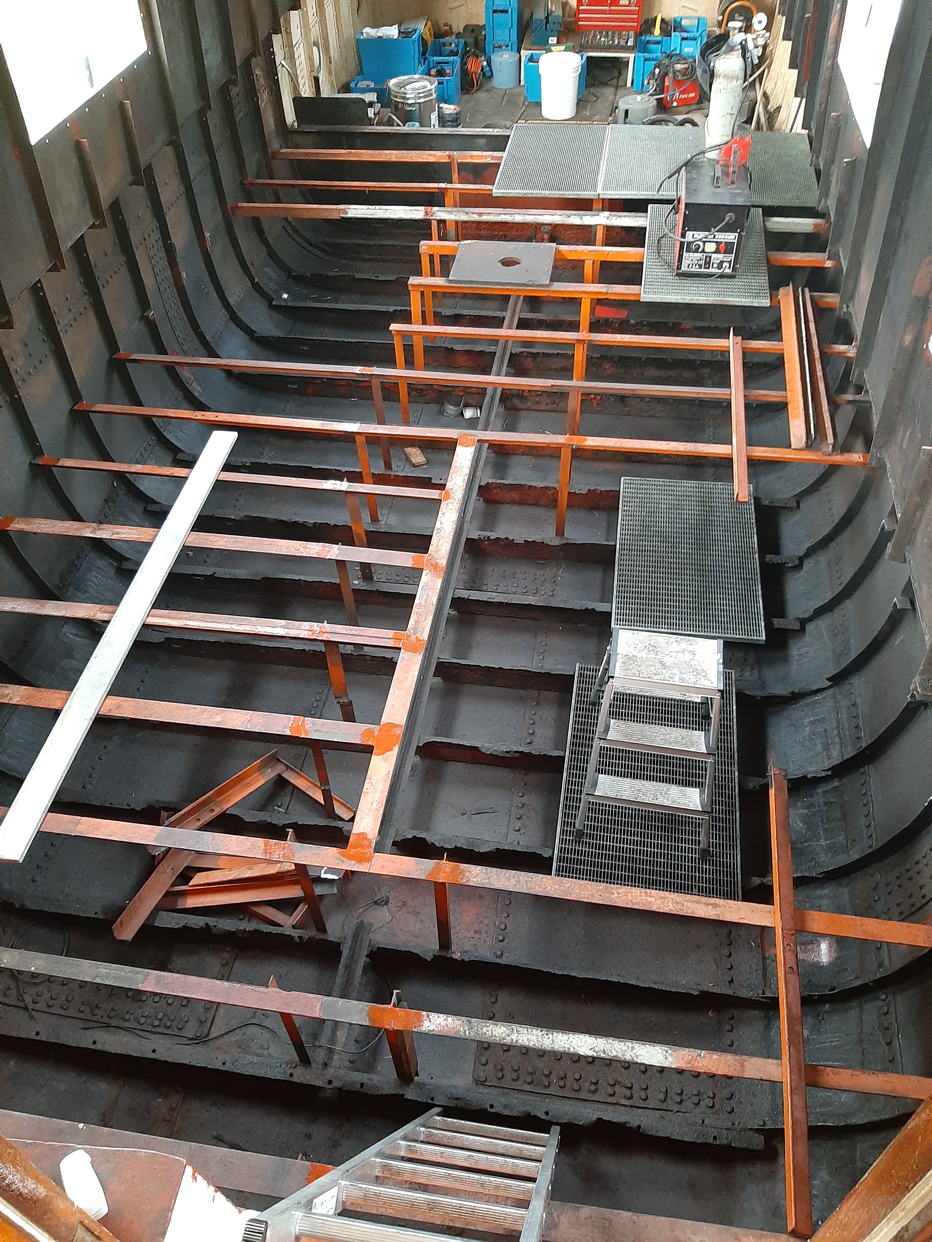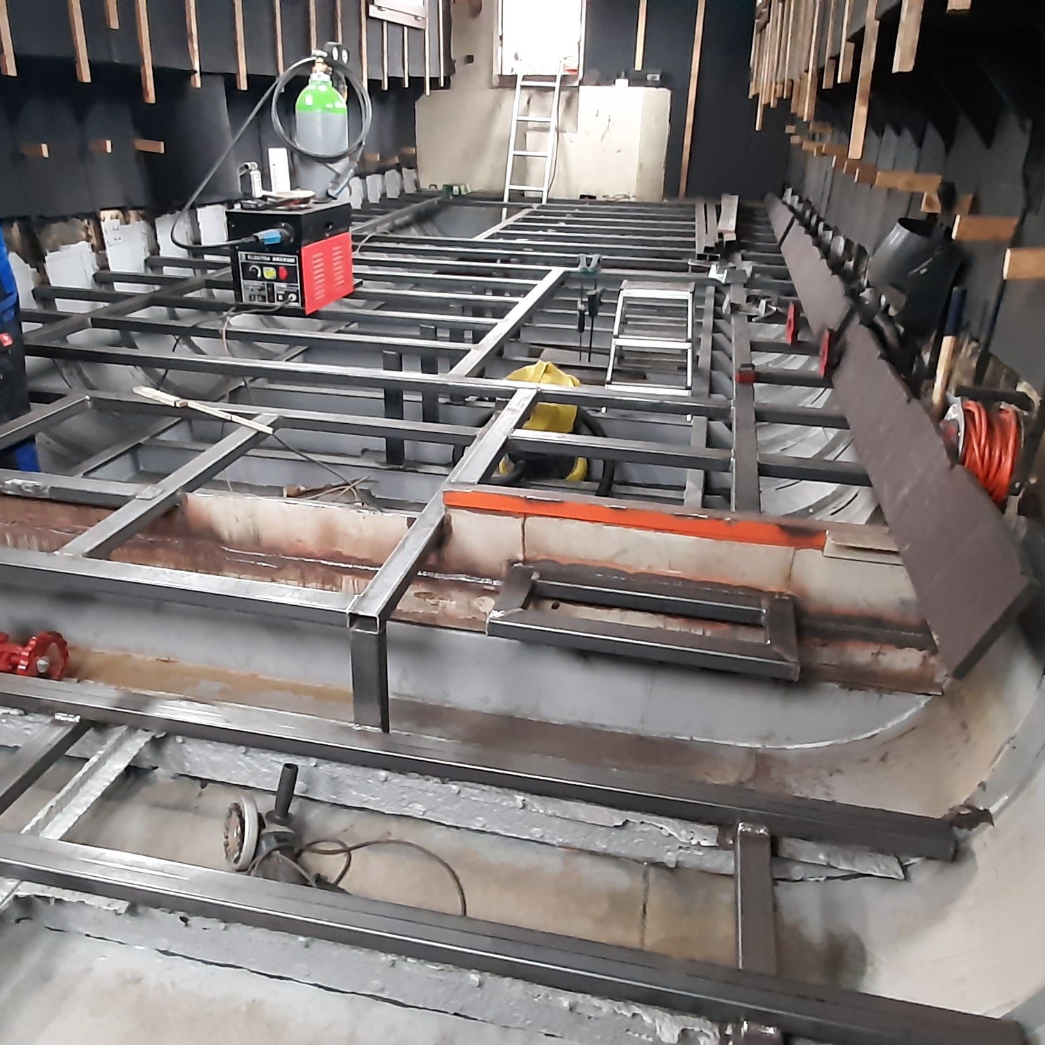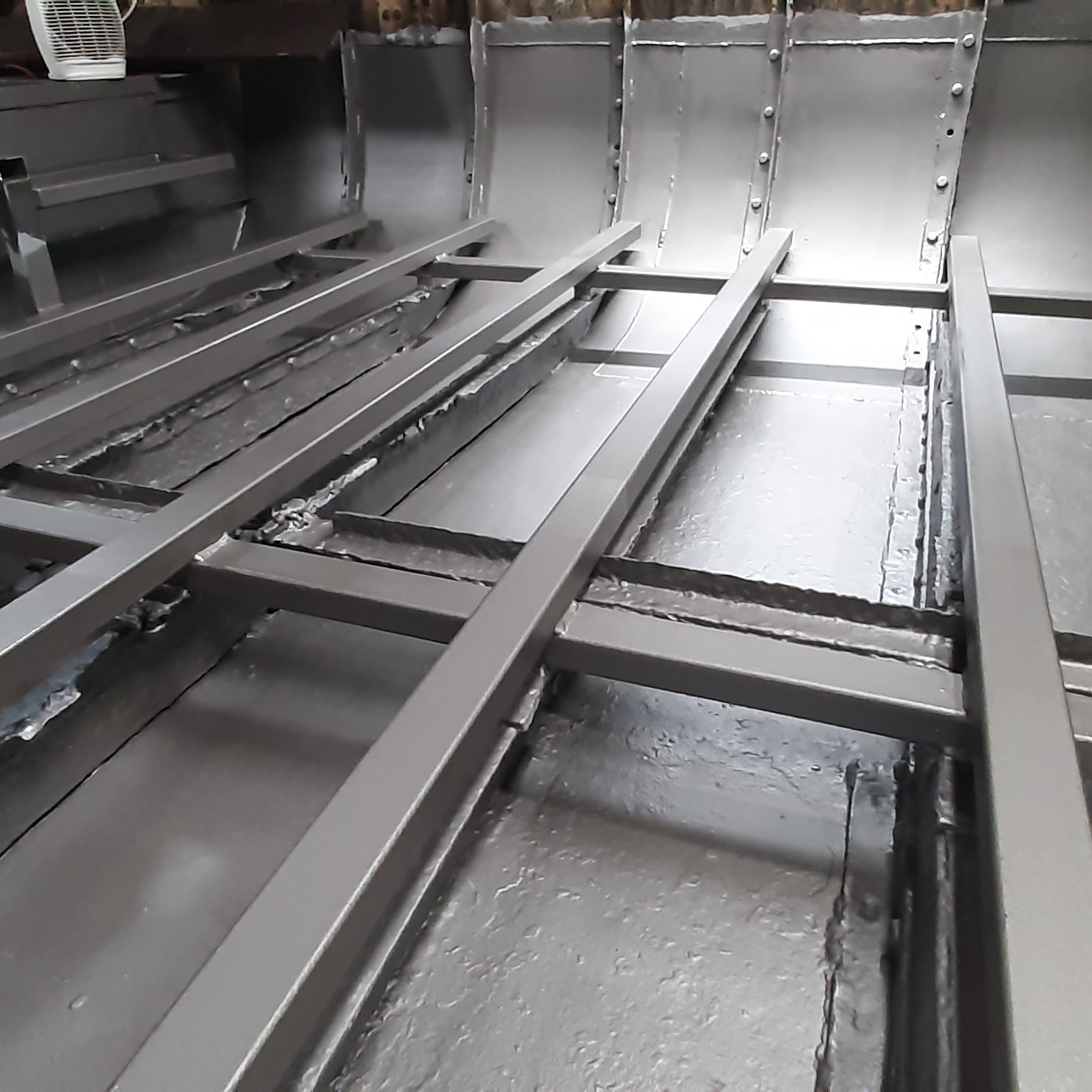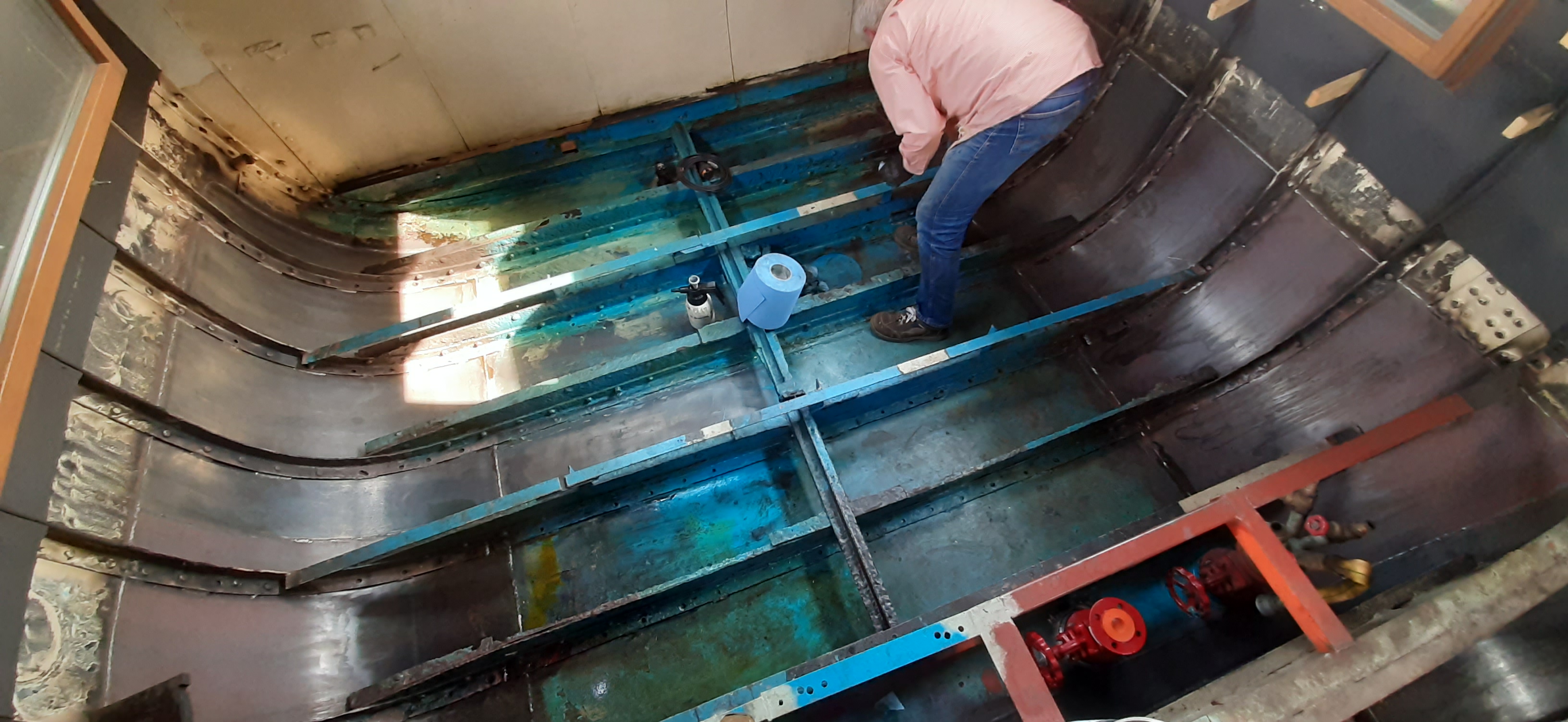 In der Zwischenzeit wurde der neue Boden, mit innen liegender Kühlschlange, gefertigt. Dieser wurde dann an die bestehenden Spanten angeschweißt. Die nun noch offenen Rundungen des Unterwasserschiffs wurden anschließend mit der Bordwand verbunden.