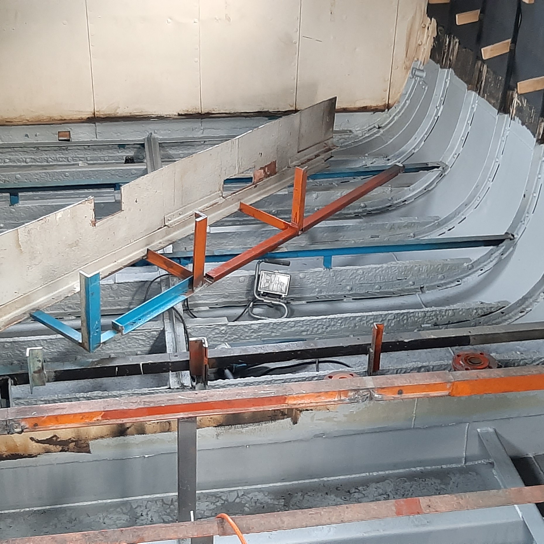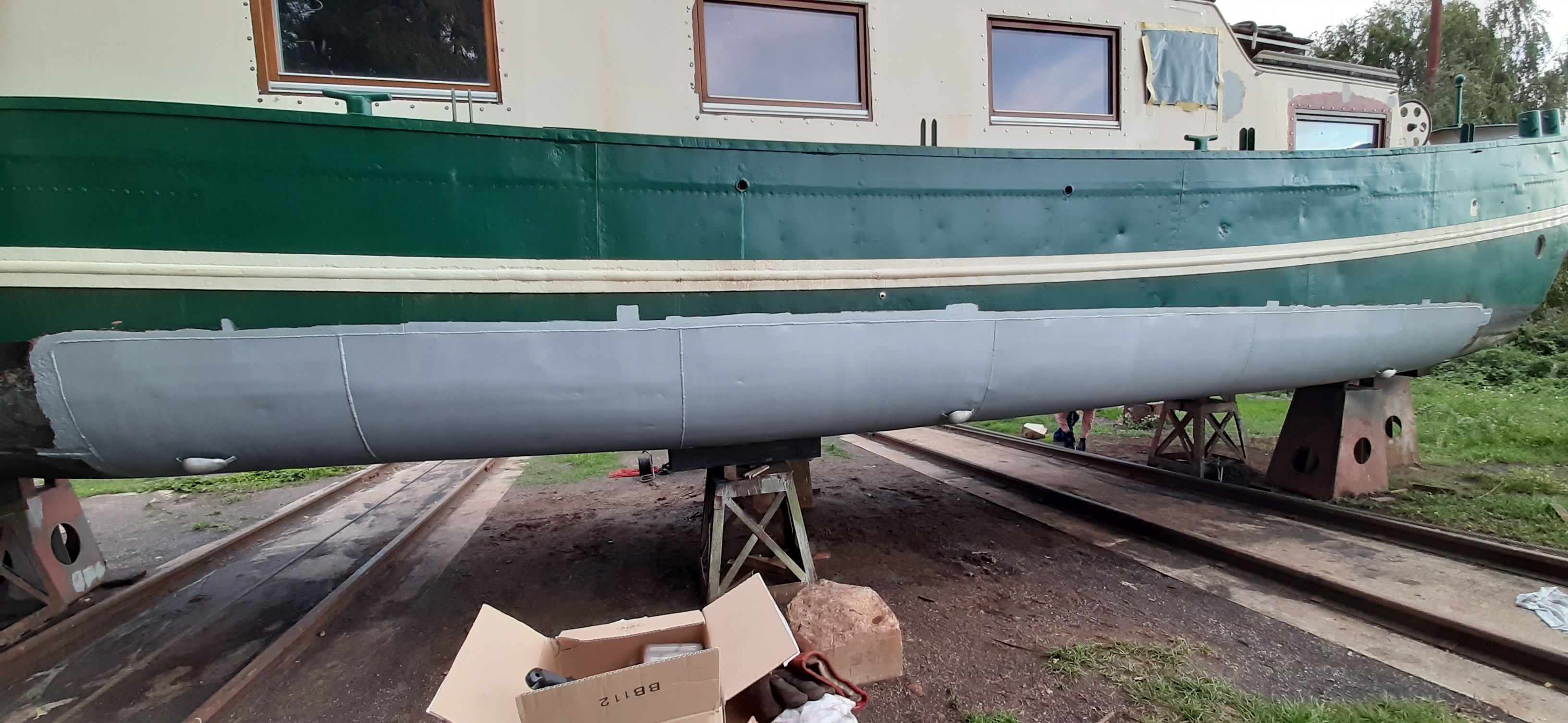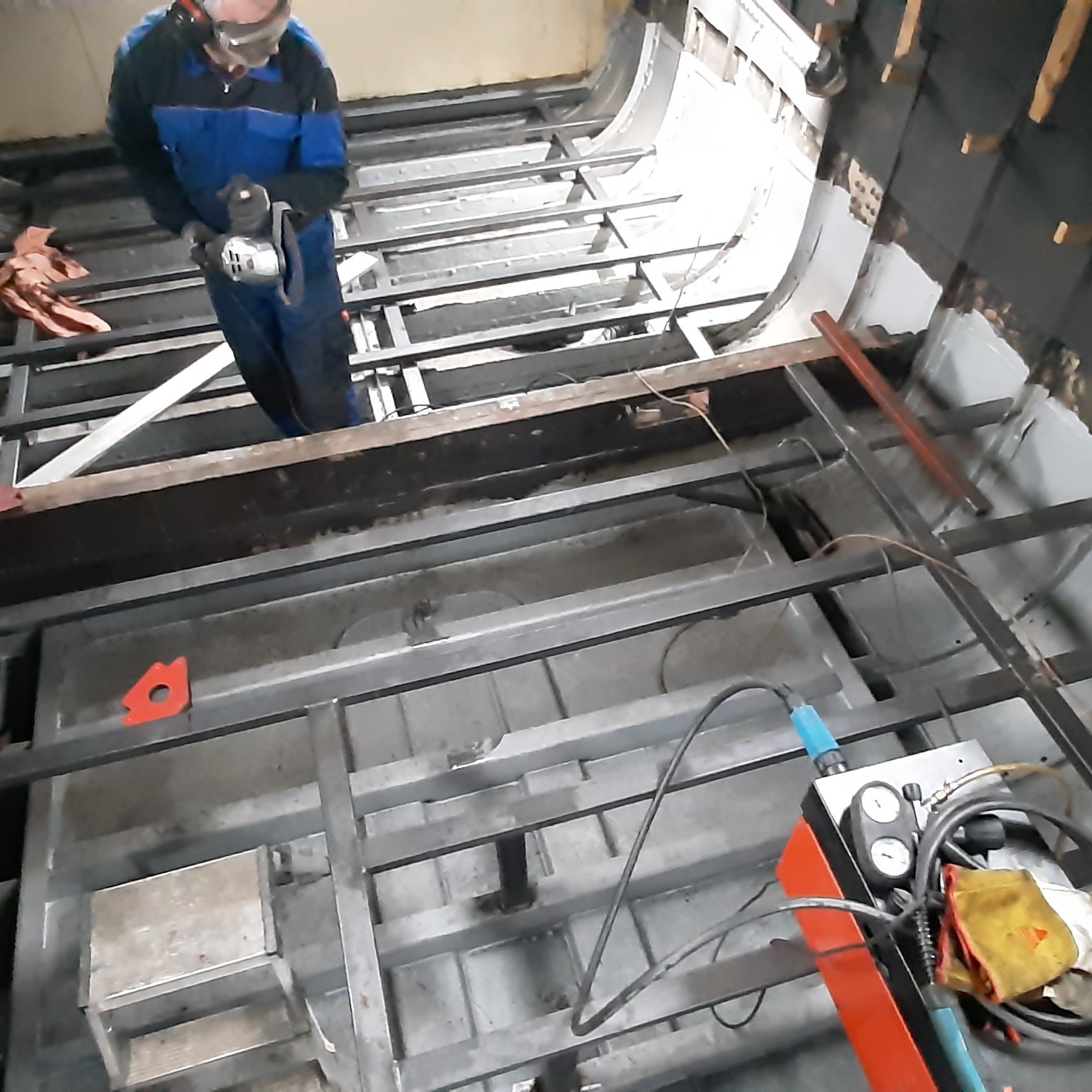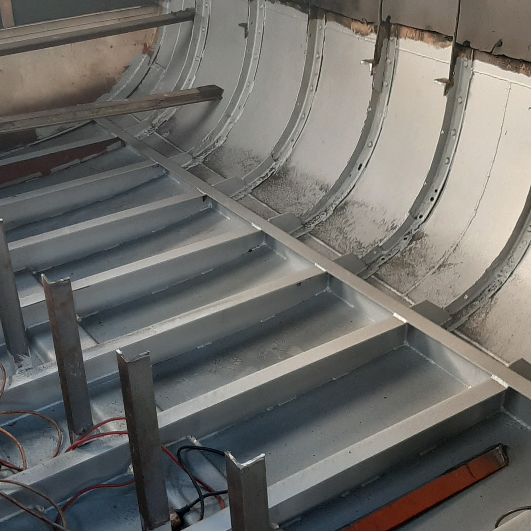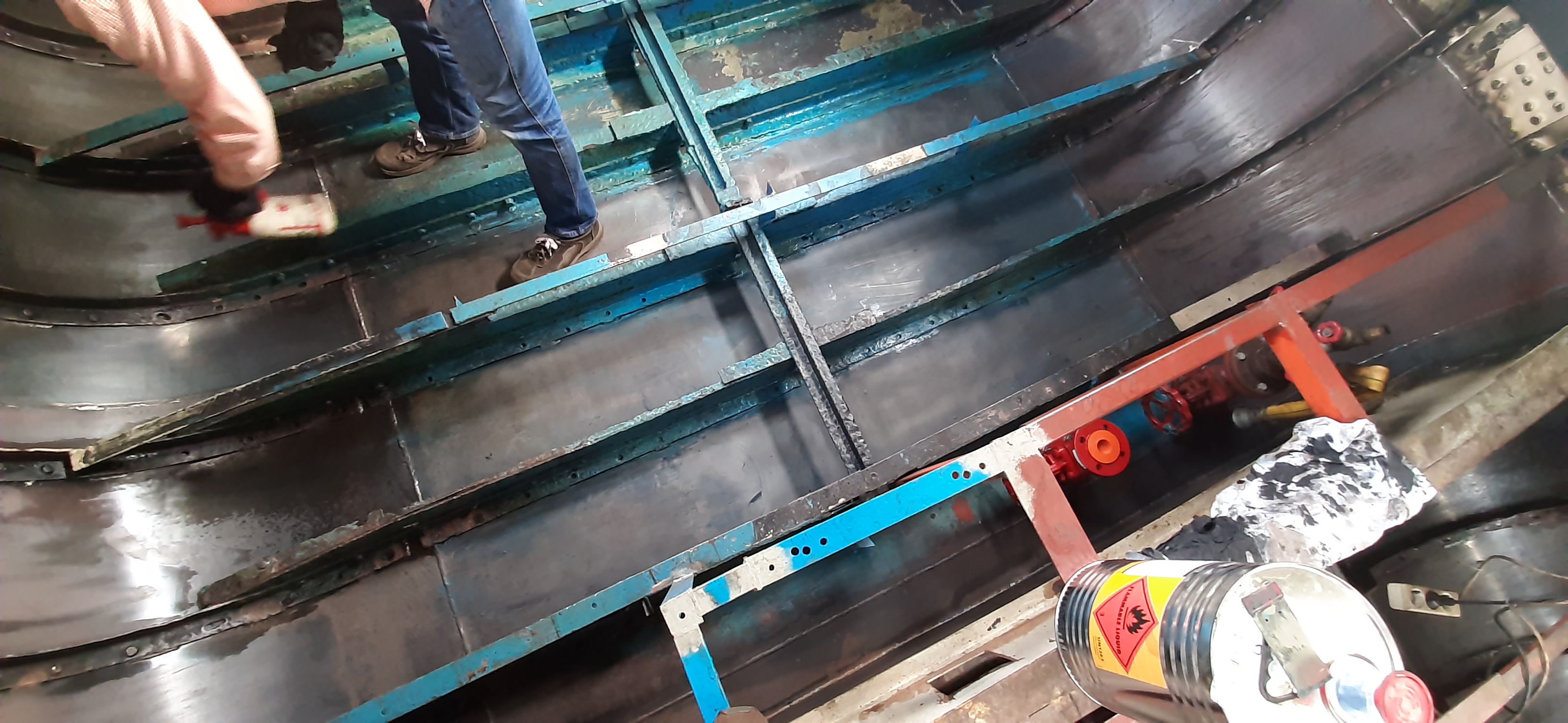 In der Zwischenzeit wurde der neue Boden, mit innen liegender Kühlschlange, gefertigt. Dieser wurde dann an die bestehenden Spanten angeschweißt. Die nun noch offenen Rundungen des Unterwasserschiffs wurden anschließend mit der Bordwand verbunden.