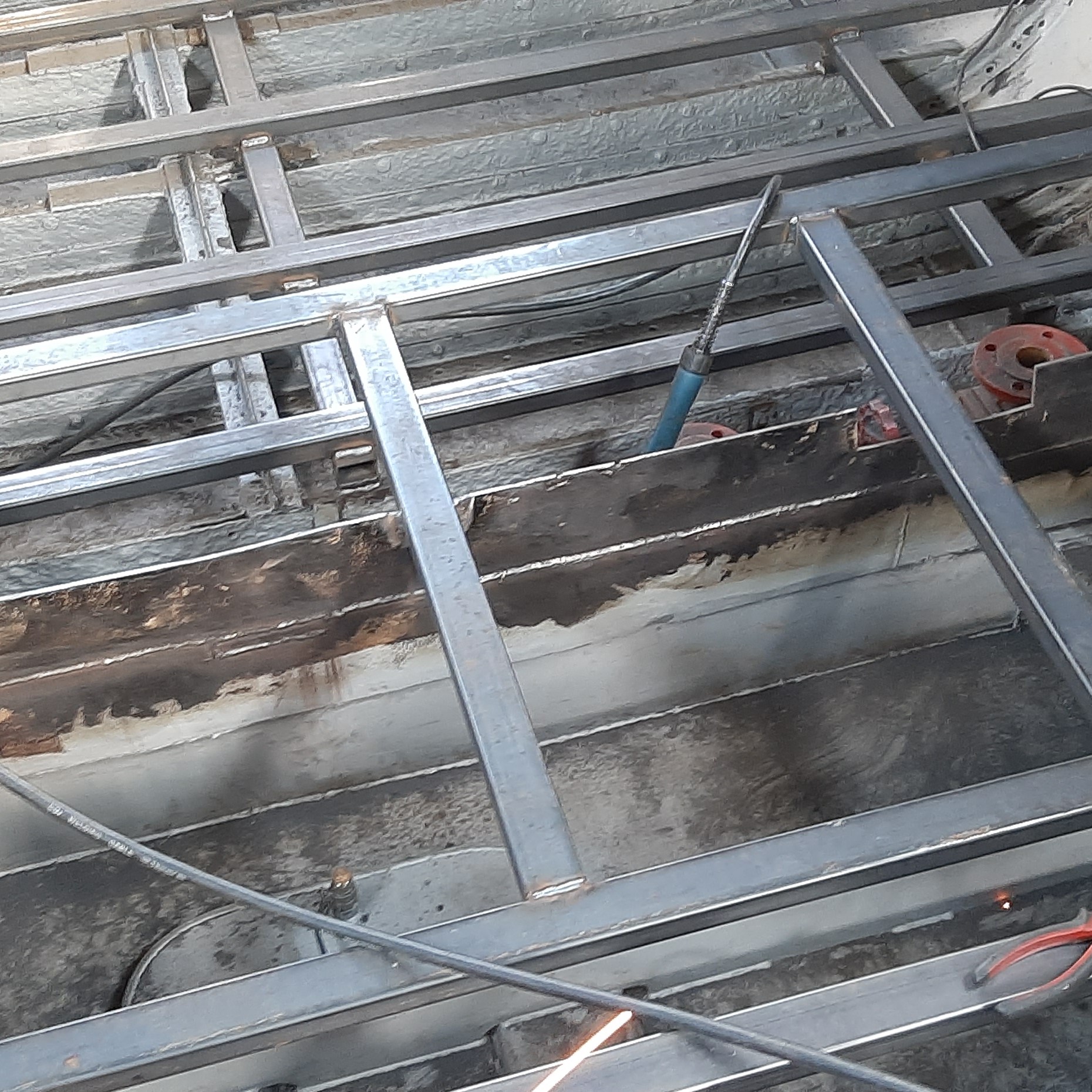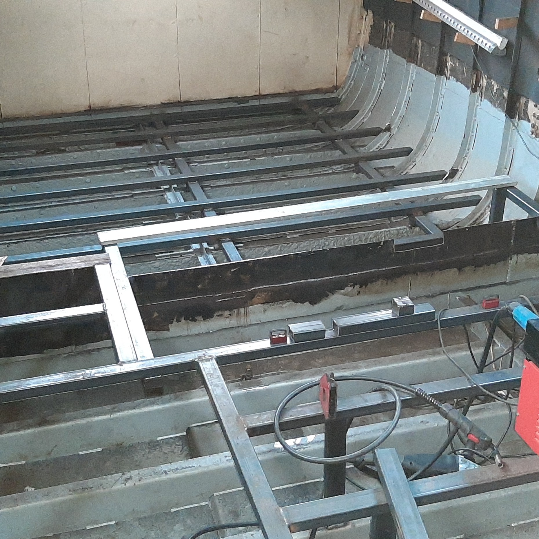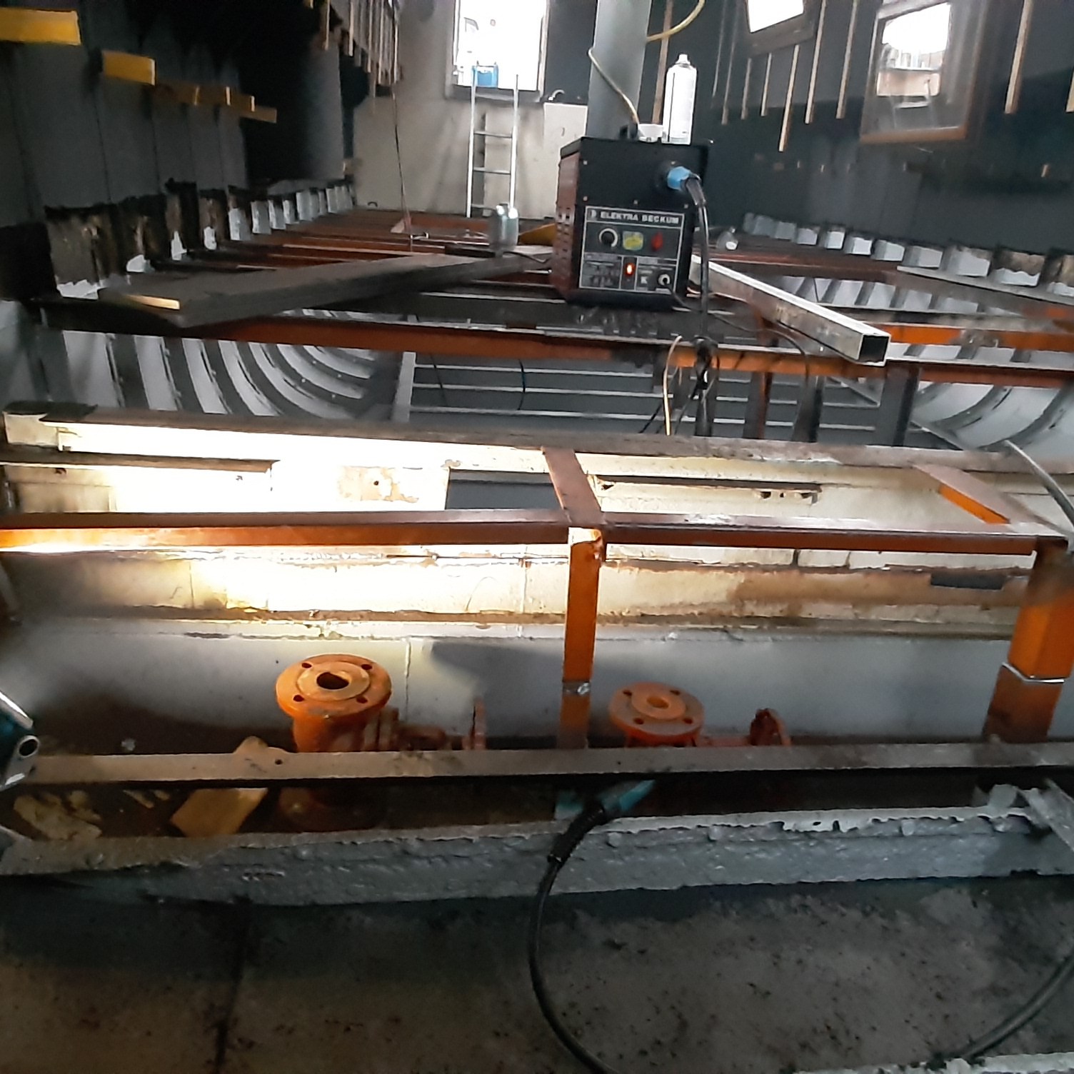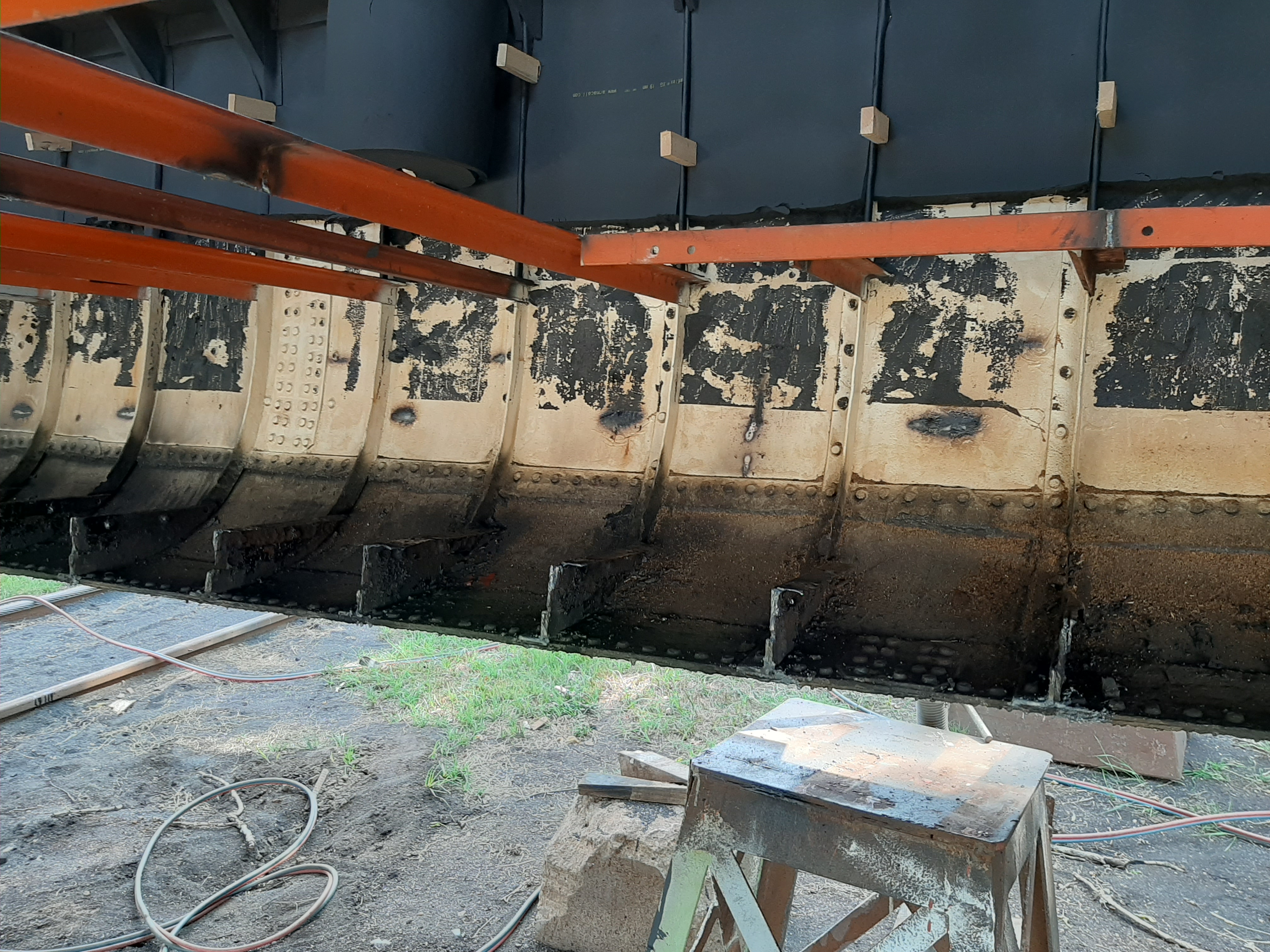 In der Zwischenzeit wurde der neue Boden, mit innen liegender Kühlschlange, gefertigt. Dieser wurde dann an die bestehenden Spanten angeschweißt. Die nun noch offenen Rundungen des Unterwasserschiffs wurden anschließend mit der Bordwand verbunden.