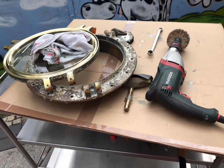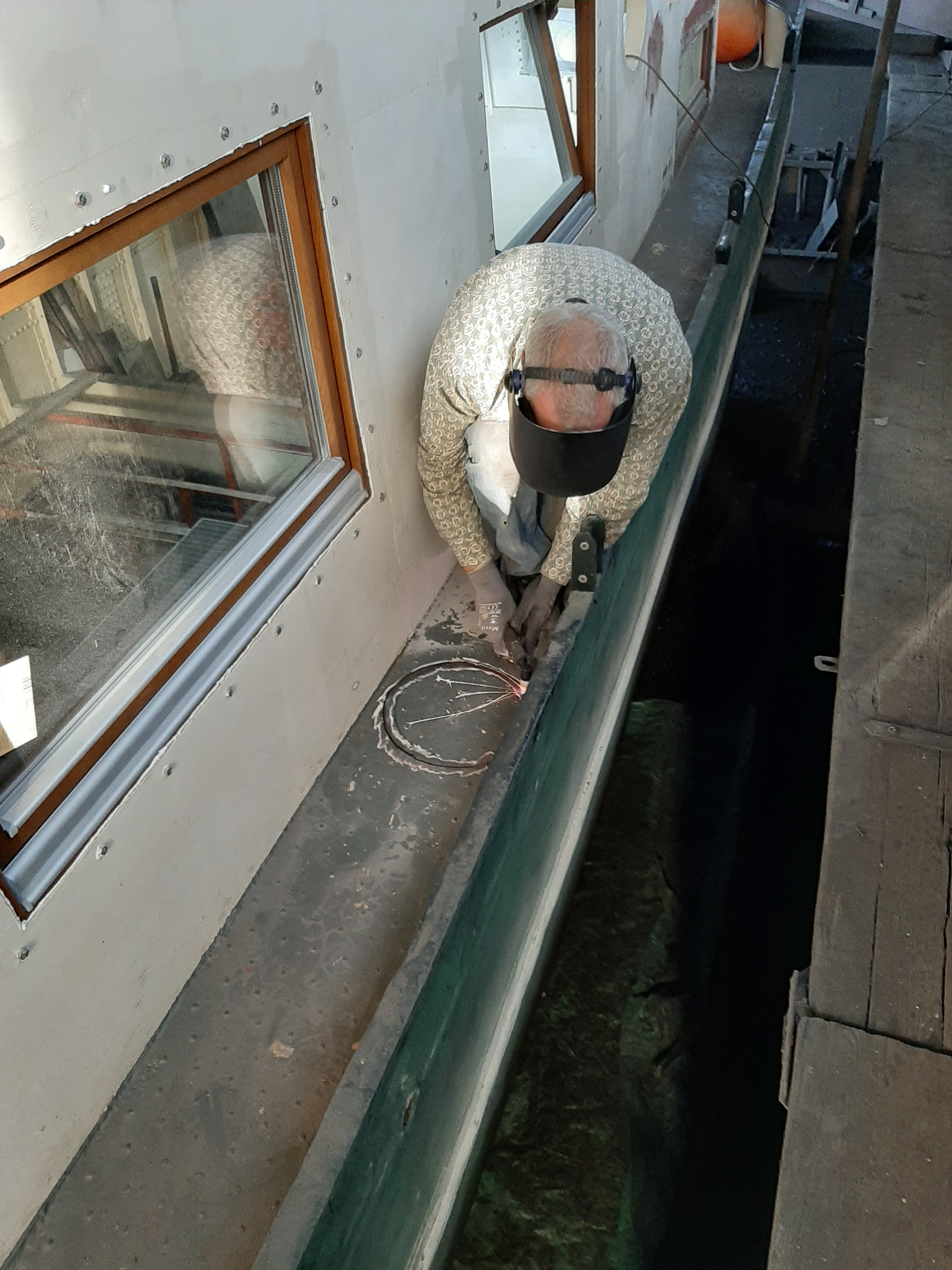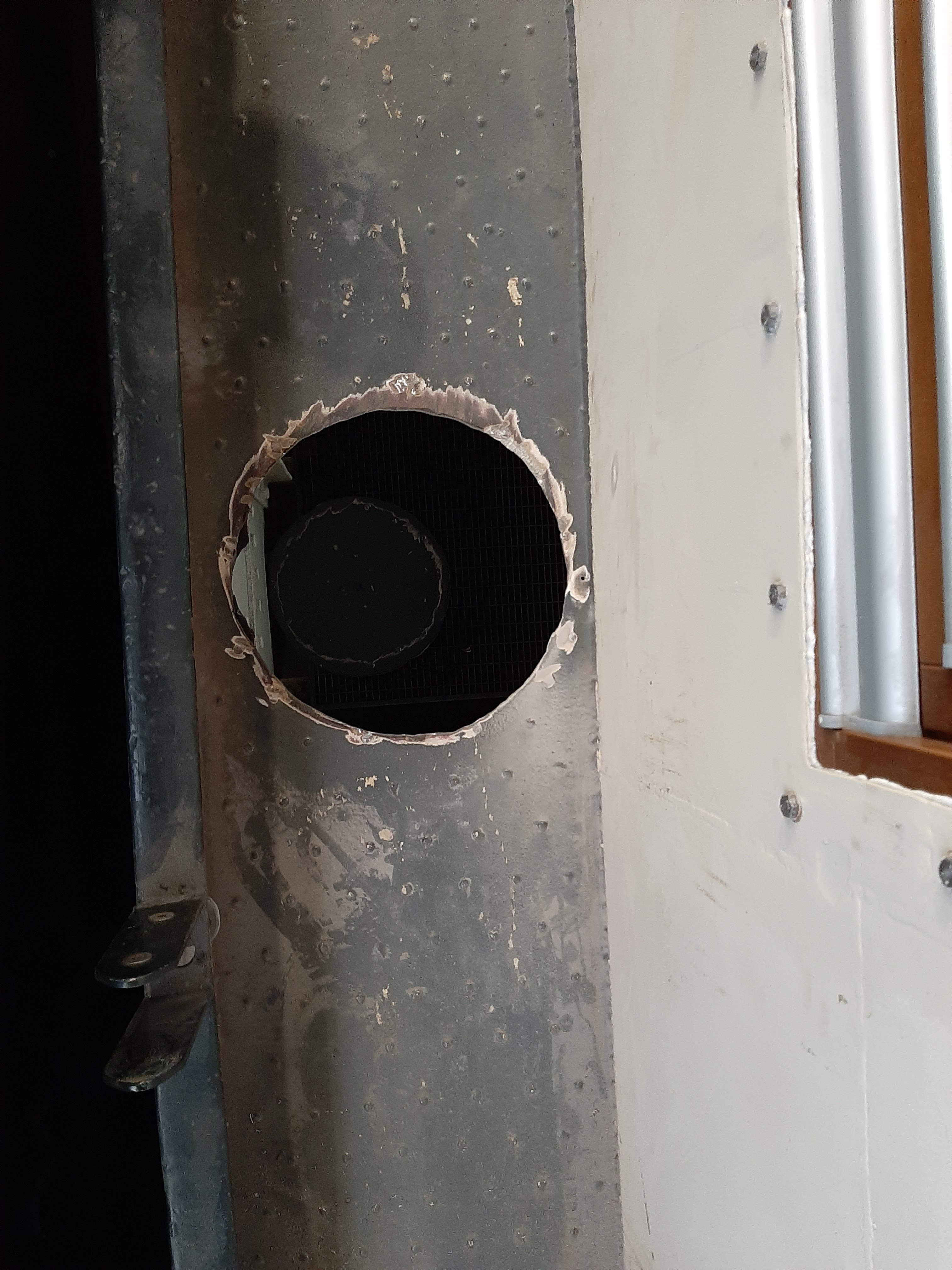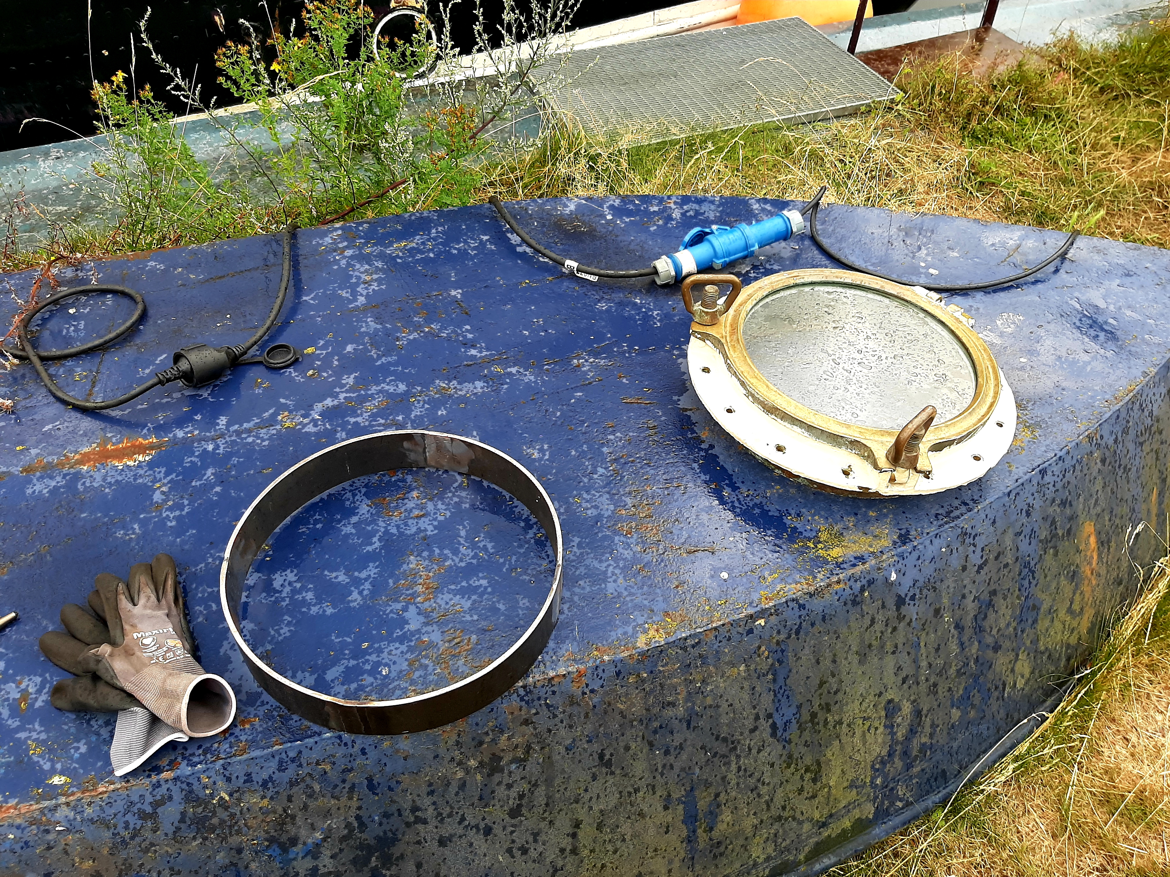 Dann war da noch das Bullauge. Das Bullauge habe ich ganz zu Beginn der Restauration gekauft und wollte es schon lange einbauen. Das Problem: Es gab keinen Flansch um es an die Außenwand zu montieren. Der Flansch ermöglicht, dass das Bullauge mit genügend Abstand zu Außenwand eingebaut werden kann, sodass wir eine Dämmung anbringen können. Für den Flansch habe ich das komplette Internet abgesucht, aber im Endeffekt war wieder selbstbauen angesagt. Ein Freund hatte noch ein Stück Metallrohr von einem Stegbau liegen. Leider im falschen Durchmesser. Deswegen wurde das Rohr aufgetrennt ein Stück eingeschweißt und alles möglichst rund gedängelt. Den Kragen haben dann mein Vater und ich angeschweißt. Nachdem der Flansch fertig war, wurde er mit der Außenwand verschweißt. Das alte, viel zu kleine Bullauge wurde abmontiert und das Loch verschlossen.