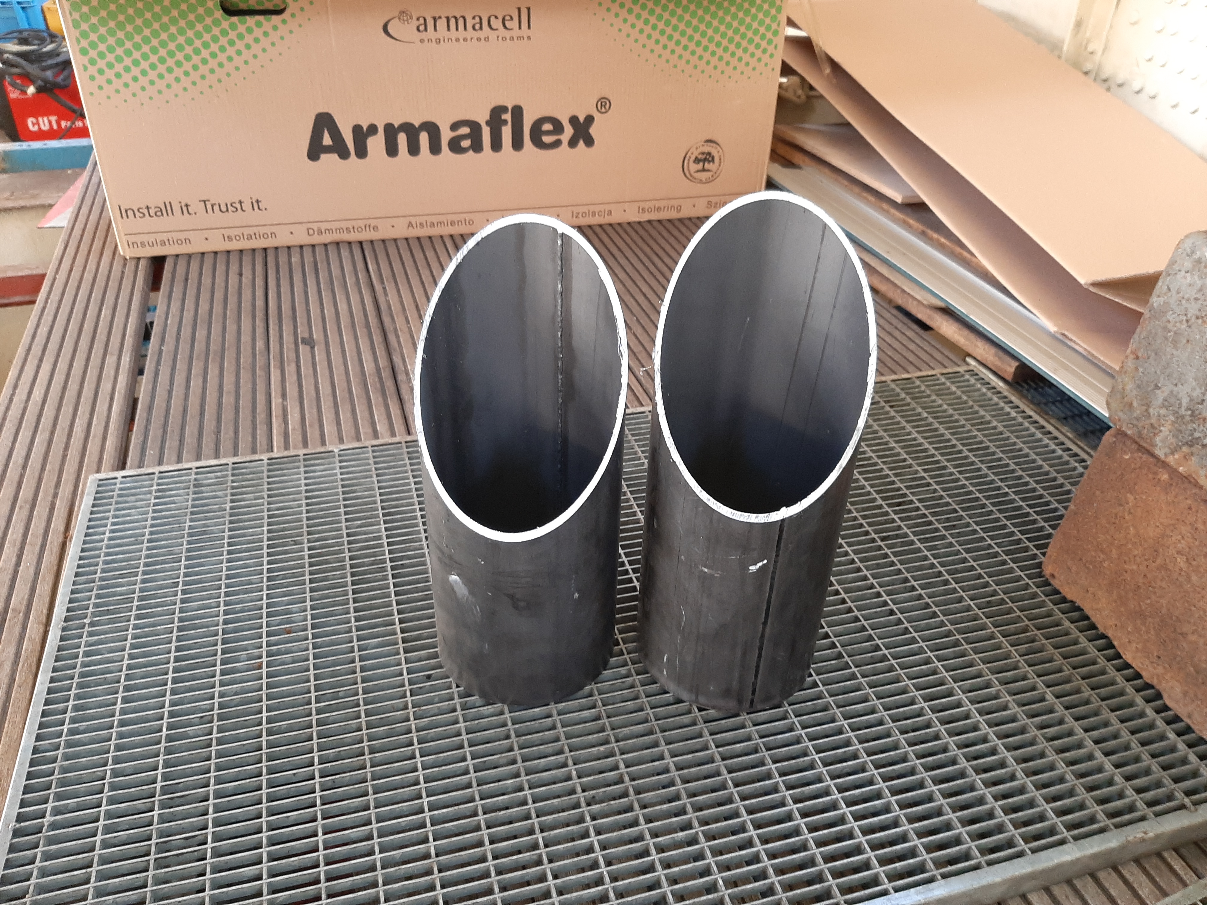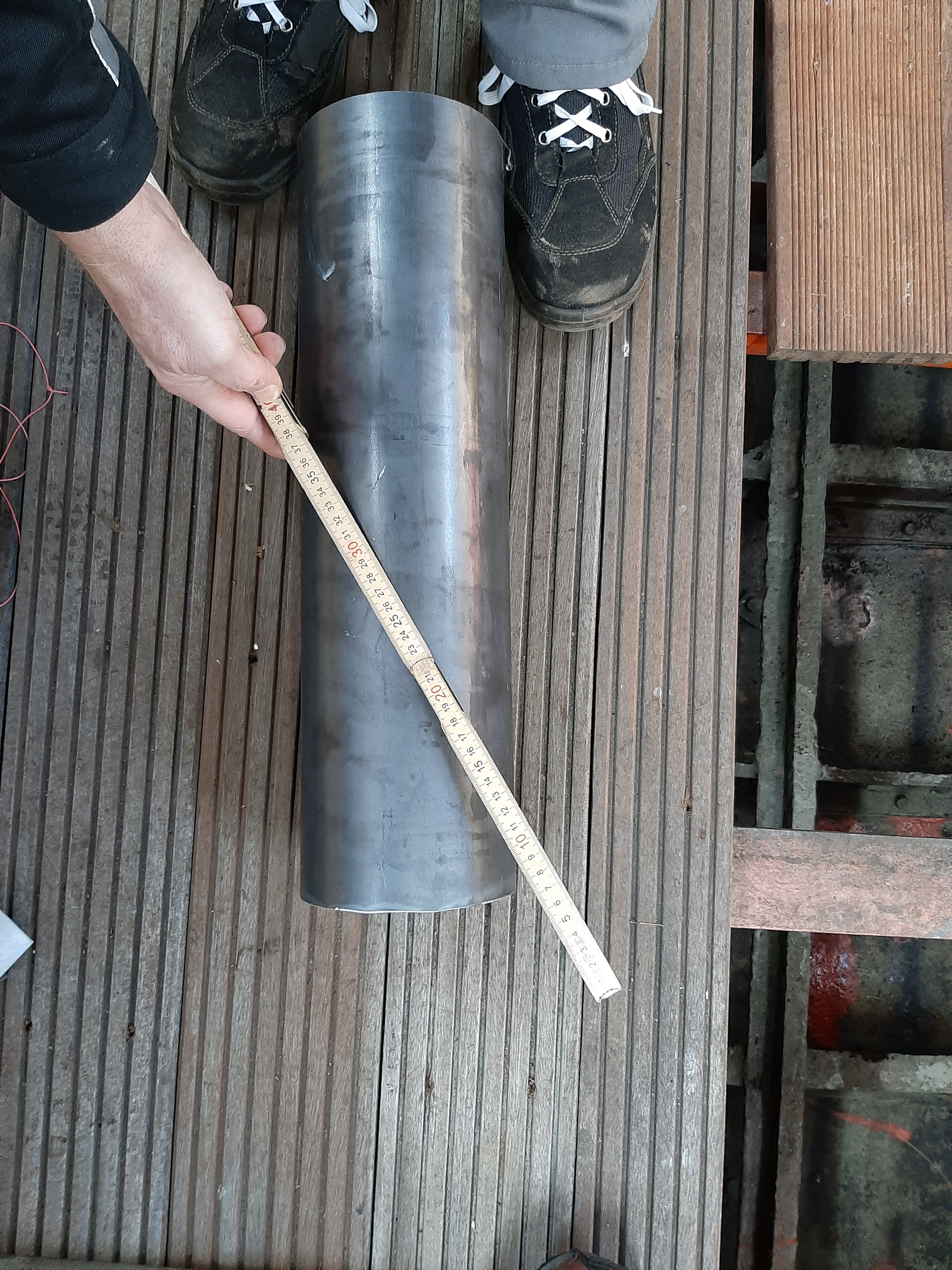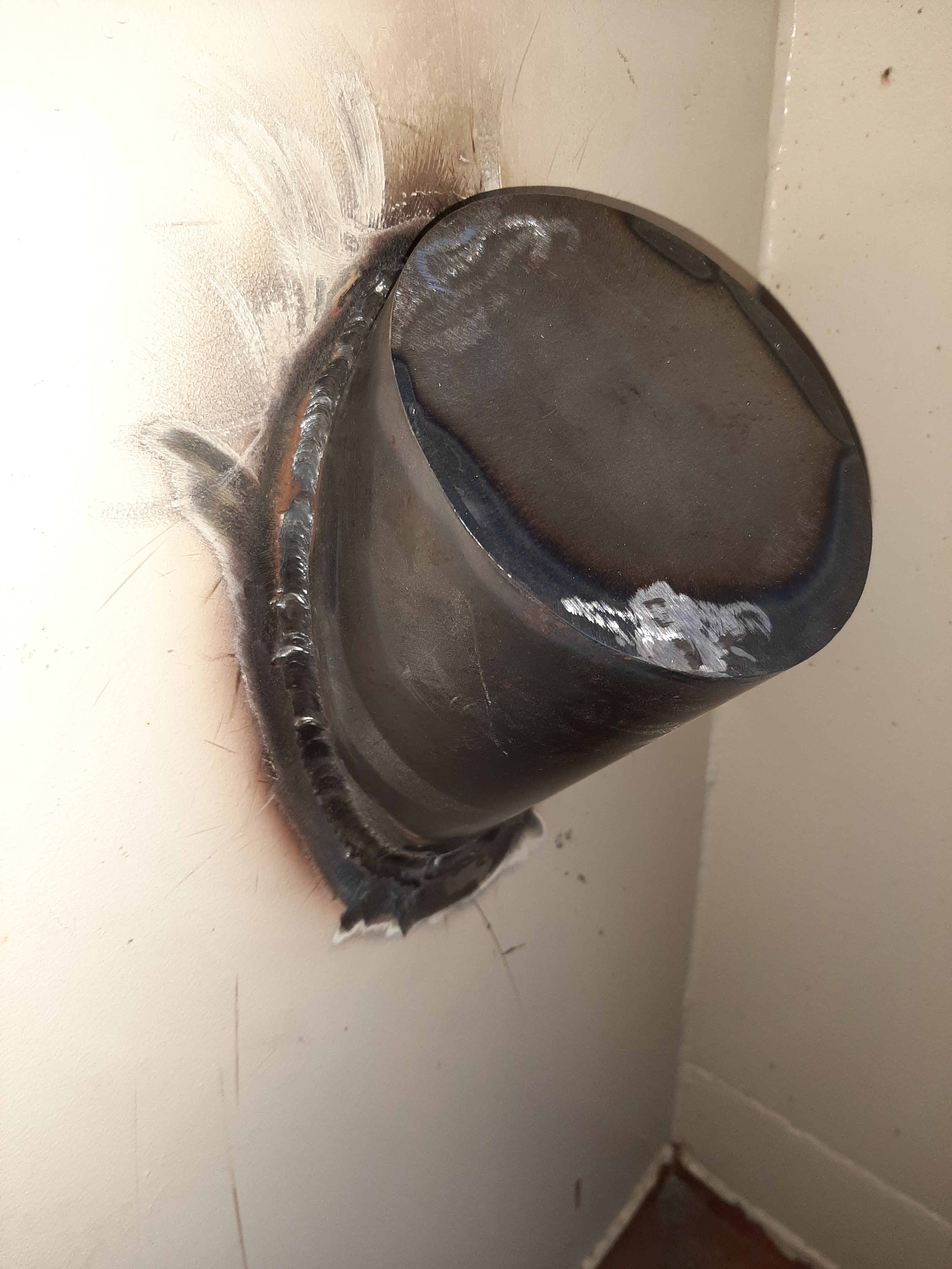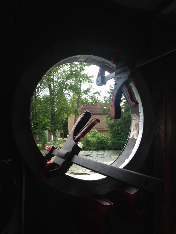 Dann war da noch das Bullauge. Das Bullauge habe ich ganz zu Beginn der Restauration gekauft und wollte es schon lange einbauen. Das Problem: Es gab keinen Flansch um es an die Außenwand zu montieren. Der Flansch ermöglicht, dass das Bullauge mit genügend Abstand zu Außenwand eingebaut werden kann, sodass wir eine Dämmung anbringen können. Für den Flansch habe ich das komplette Internet abgesucht, aber im Endeffekt war wieder selbstbauen angesagt. Ein Freund hatte noch ein Stück Metallrohr von einem Stegbau liegen. Leider im falschen Durchmesser. Deswegen wurde das Rohr aufgetrennt ein Stück eingeschweißt und alles möglichst rund gedängelt. Den Kragen haben dann mein Vater und ich angeschweißt. Nachdem der Flansch fertig war, wurde er mit der Außenwand verschweißt. Das alte, viel zu kleine Bullauge wurde abmontiert und das Loch verschlossen.