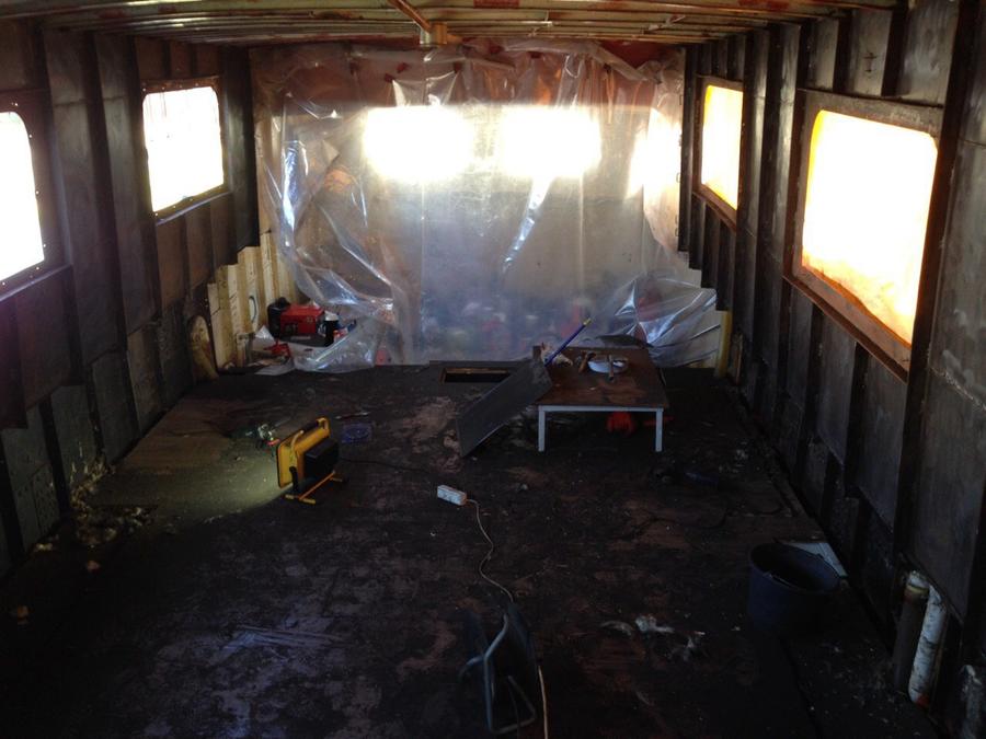 Wir fingen damit an, unseren Zwischenboden zu entfernen. Auch die Schottwand musste dran glauben. Nach dem Rückbau des alten Zwischenbodens hatten wir einen komplett leeren Rumpf. Das Prinzip mit den beiden großen Luken haben wir beibehalten. Wir verschmälerten die Luken um knapp 20 Zentimeter, um mehr Spielraum in der Raumgestaltung zu haben.