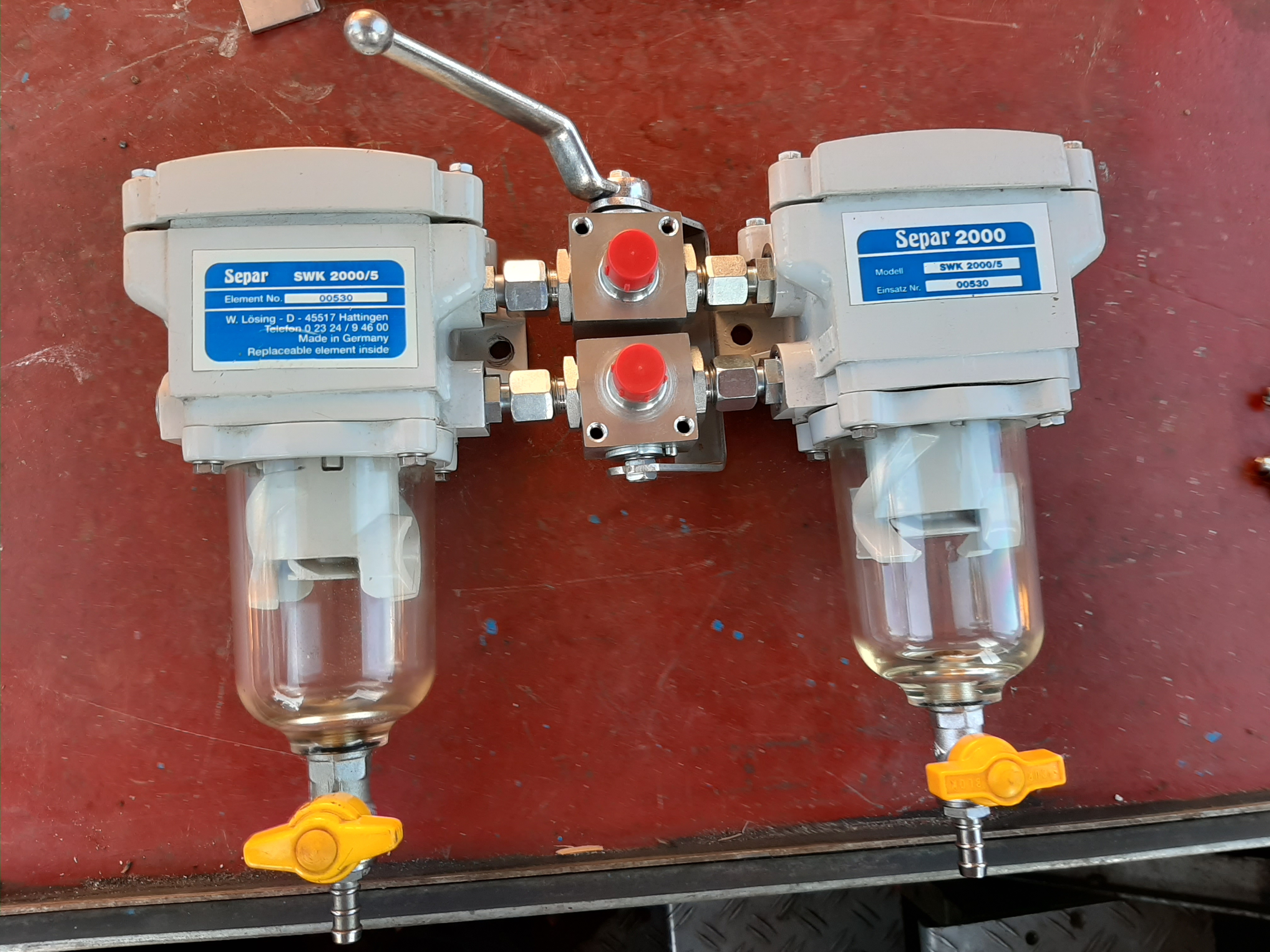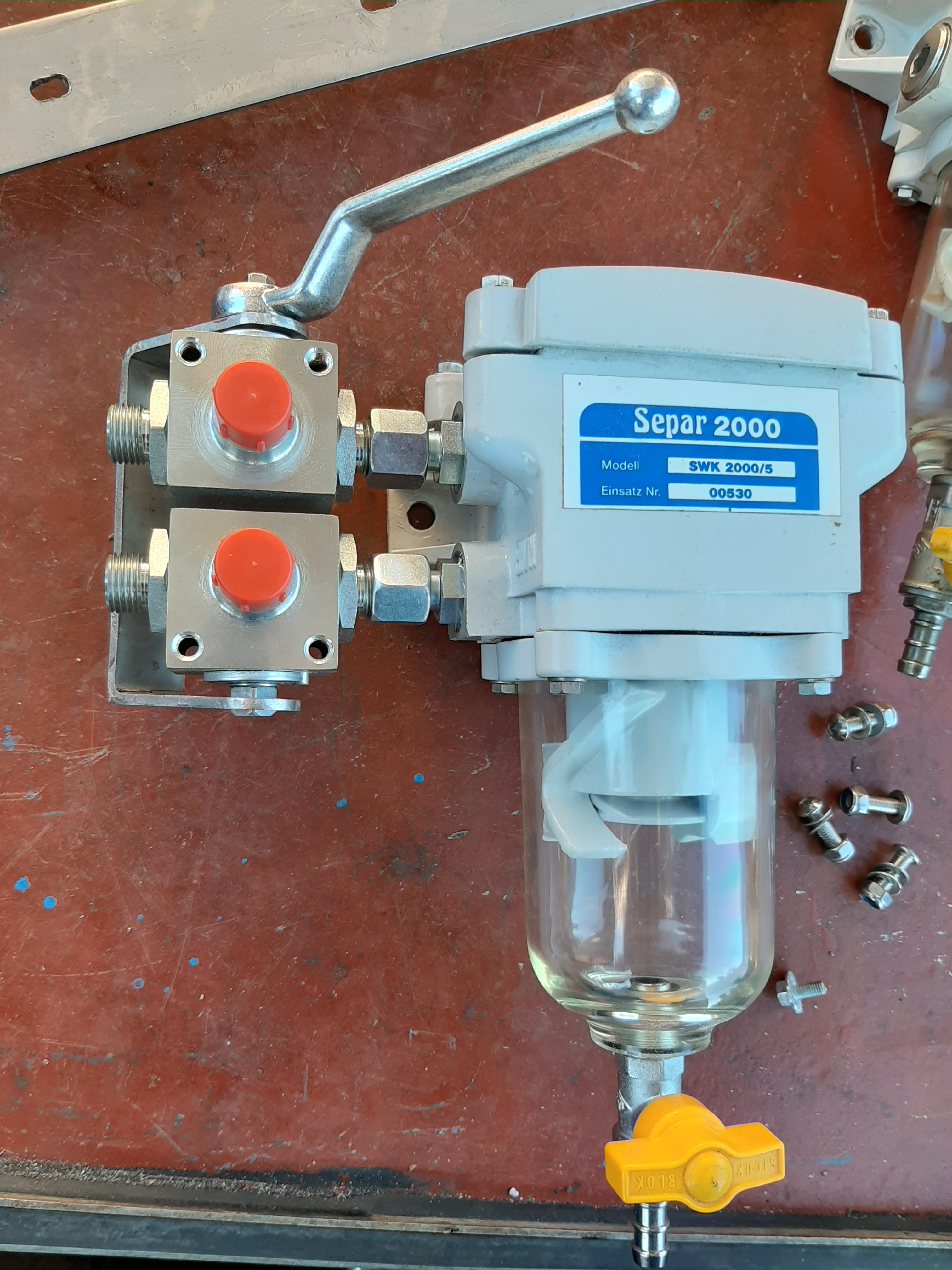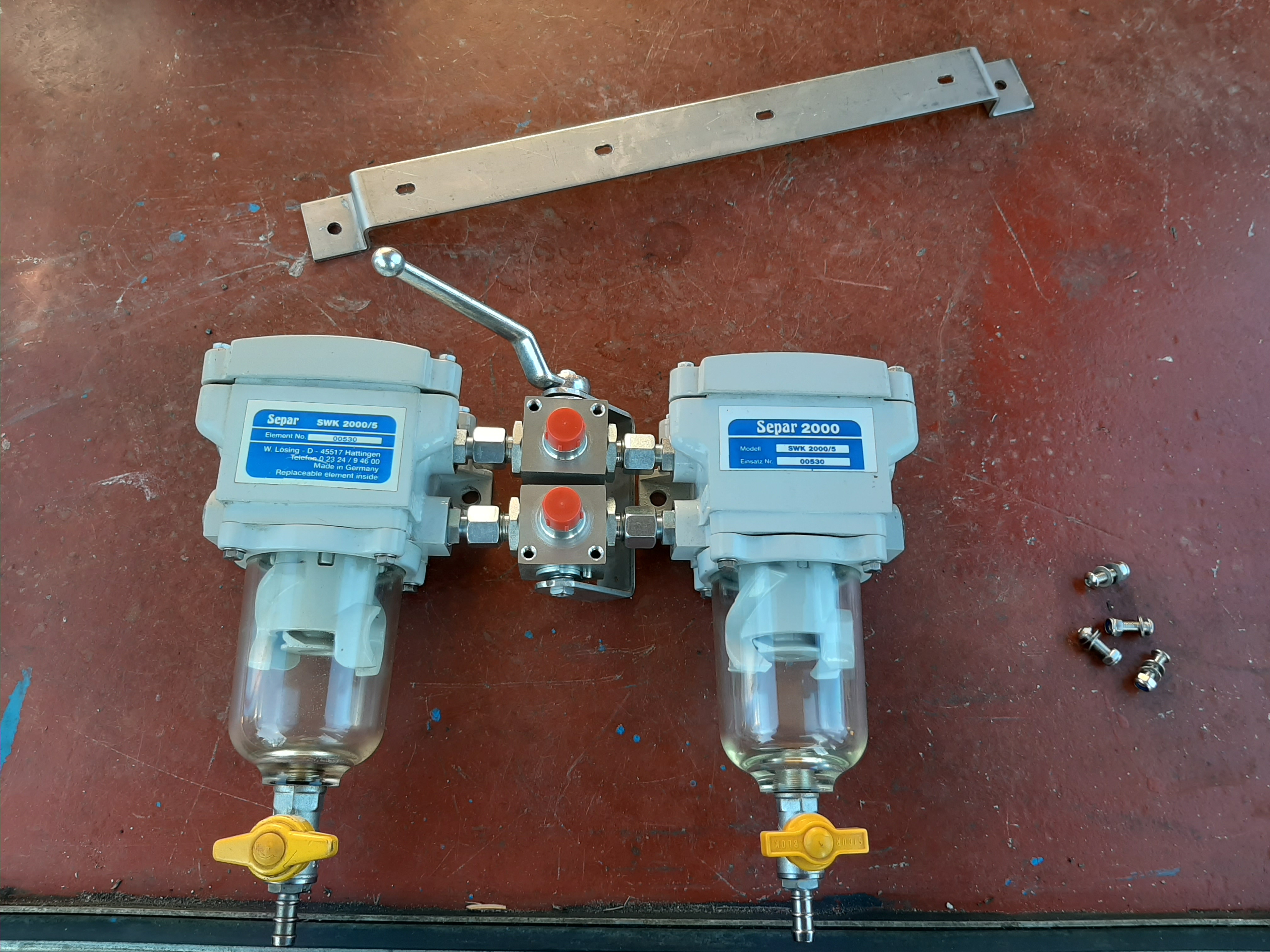 Im Motorraum wurde dann auch noch geschweißt. Und zwar eine Halterung für den neuen Tank. Ursprünglich hatten wir diesen direkt vor dem Motor auf dem Motorfundament „abgestellt“. Dies hatte allerdings zur Folge, dass wir wenig bis gar nicht die Kühlwasserschläuche inspizieren konnten. Also haben wir ein Untergestell für den Tank angeschweißt. Im gleichen Zuge haben wir dann eine Separ Doppelfilteranlage installiert. Auch dafür musste wieder ein Freund für mich ein paar Edelstahlbleche biegen. Wir waren zu geizig für das Komplettpaket, also kauften wir alle Zubehörteile einzeln und bauten es selber.