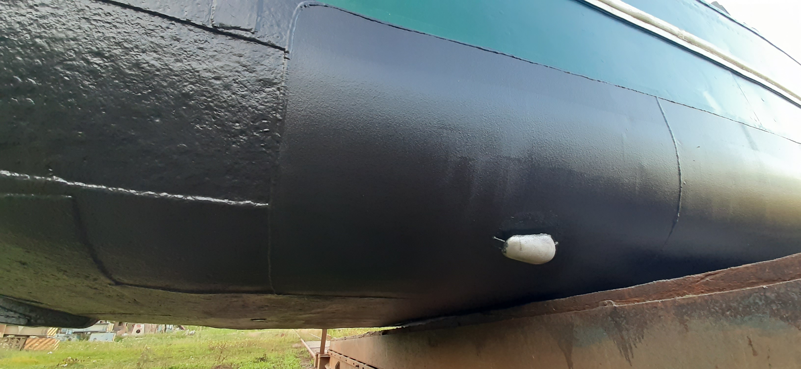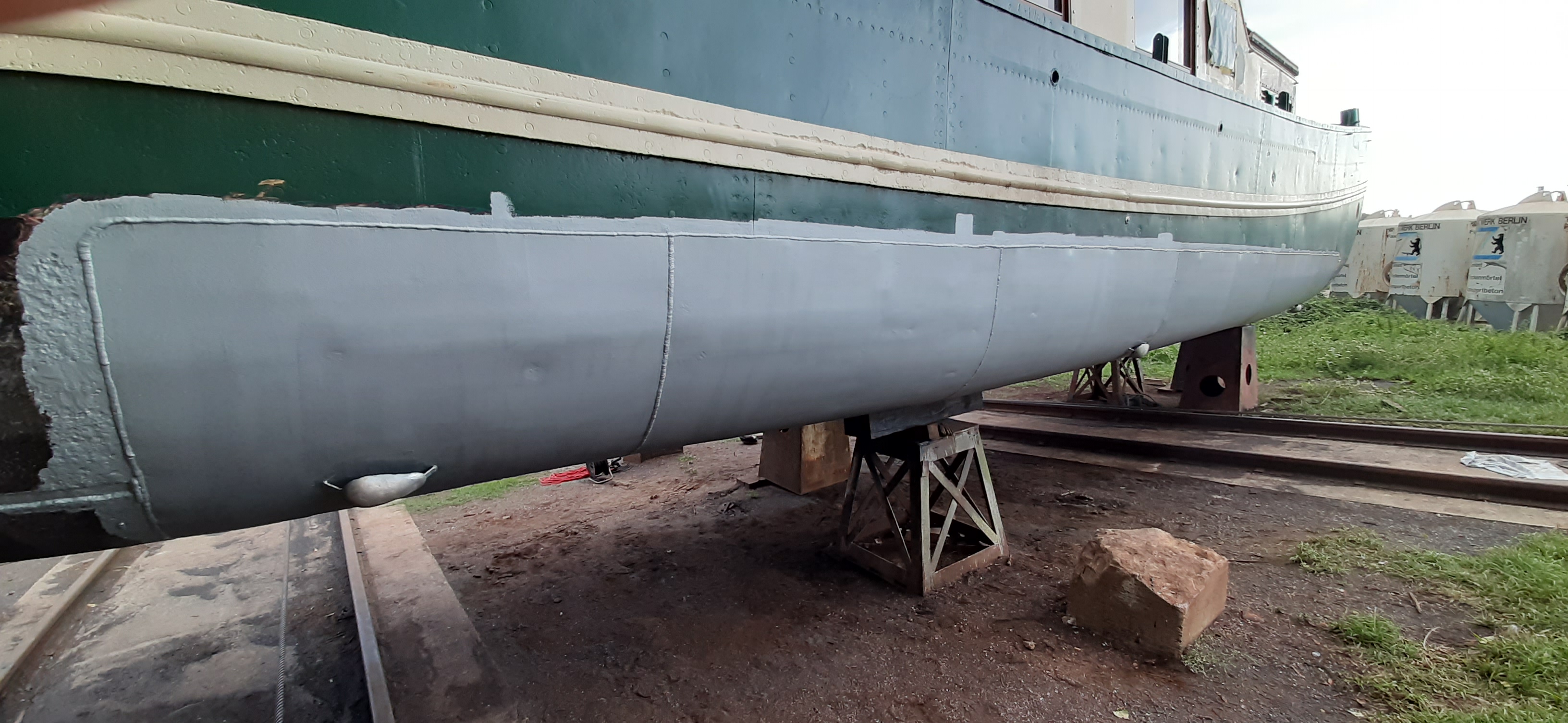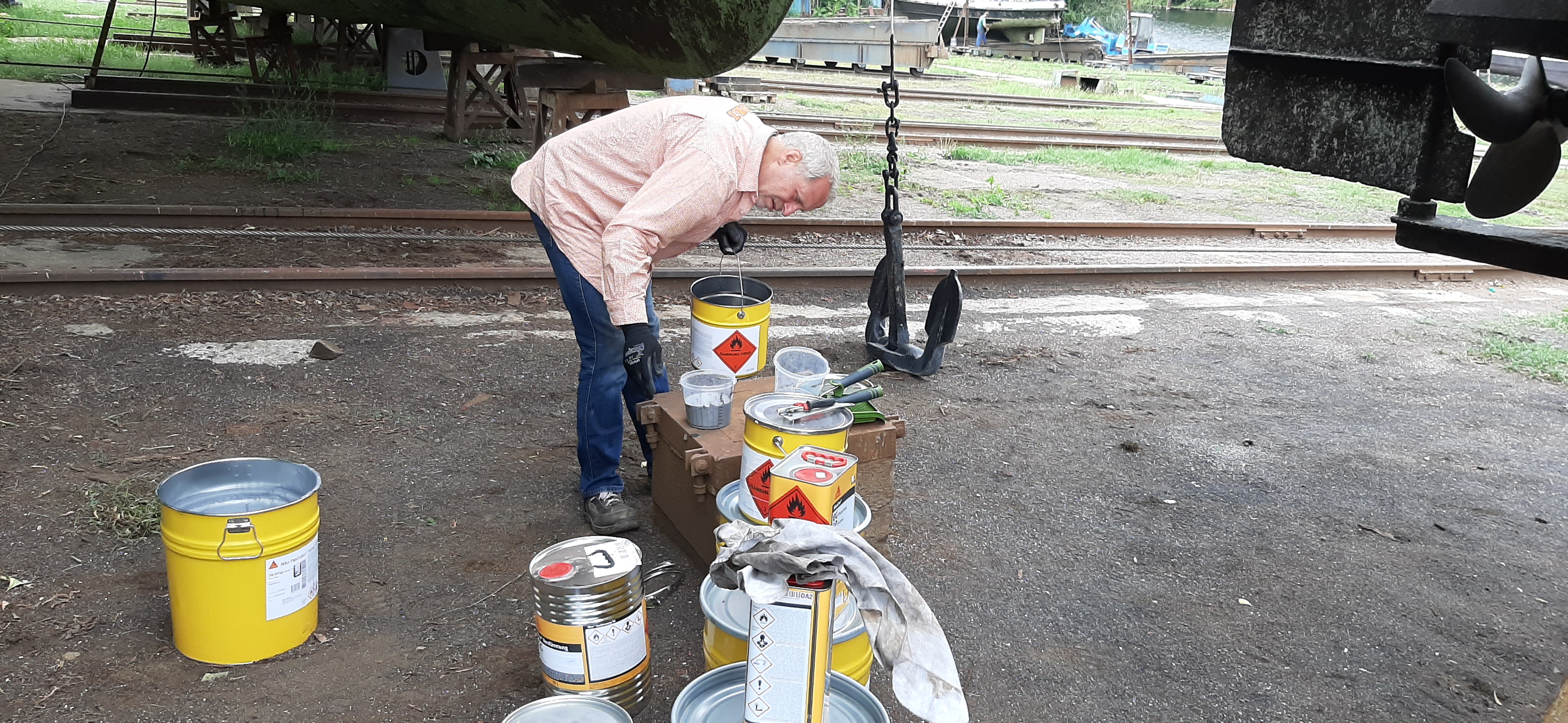 Nach der Überführung, über die ich hier auf einer anderen Seite berichte, ging es dann an den Korrosionsschutz. Auch hier haben wir uns von der Werft beraten lassen und die Produkte von SIKA verarbeitet. Die Schweißnähte wurden alle mit Kreide eingepinselt und von Innen mit Diesel bestrichen. So sollten sich eventuelle undichte Stellen bemerkbar machen. Dies galt es zunächst zu bereinigen. Wir verarbeiteten zuerst einen Primer, dann einen Zwischenanstrich und final einen Endanstrich, alles in 2K. Danach kamen noch ein paar Schichten Antifouling der Marke Wilckens drauf.