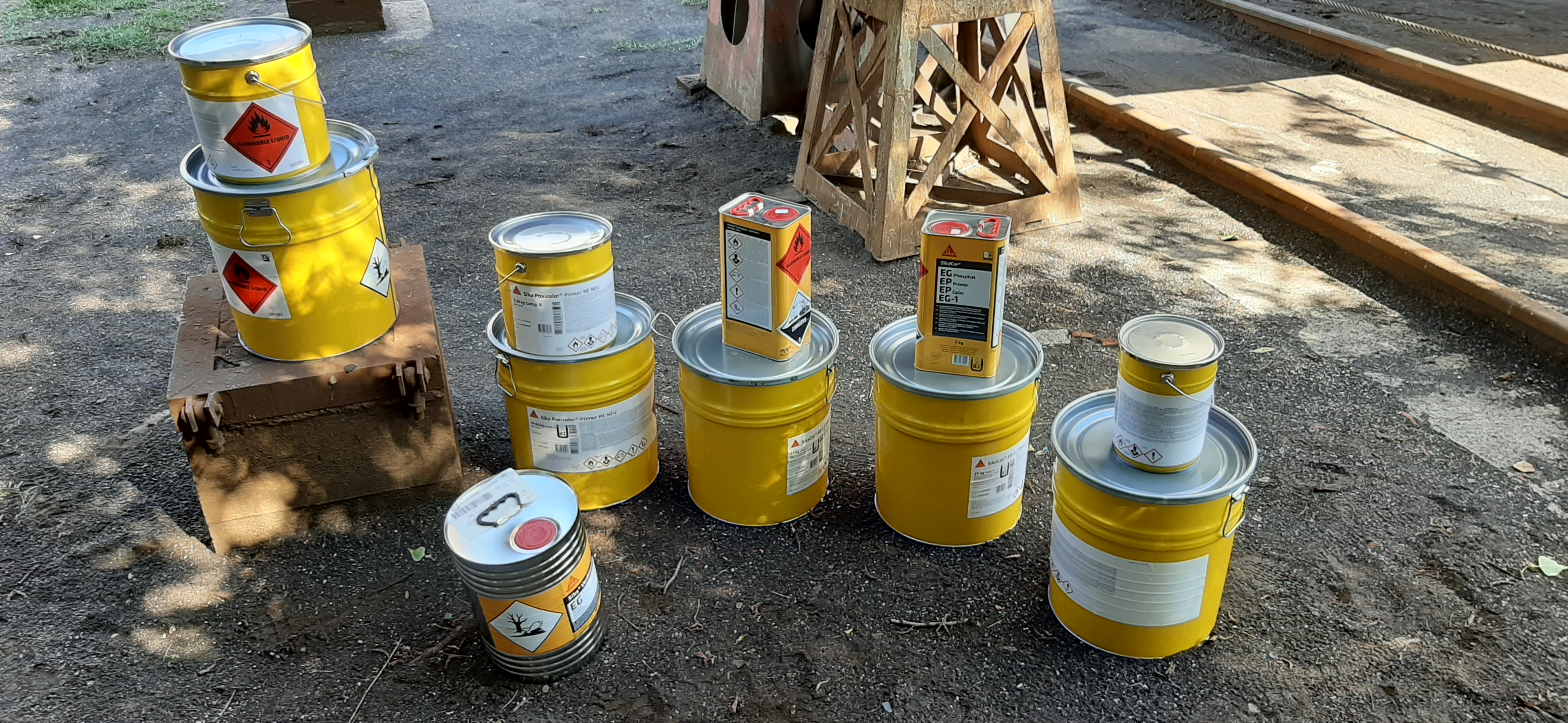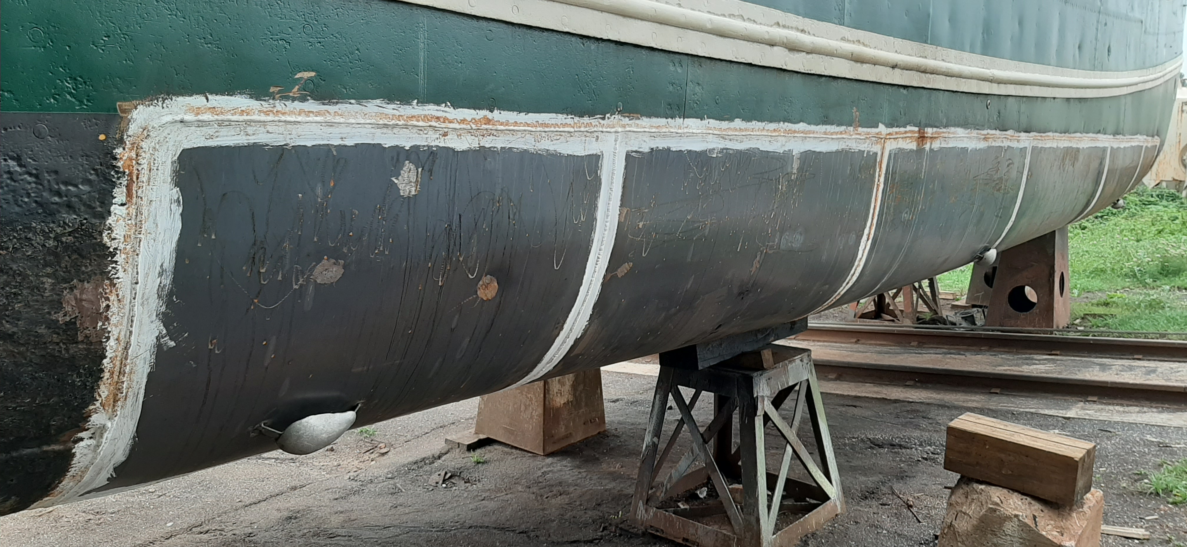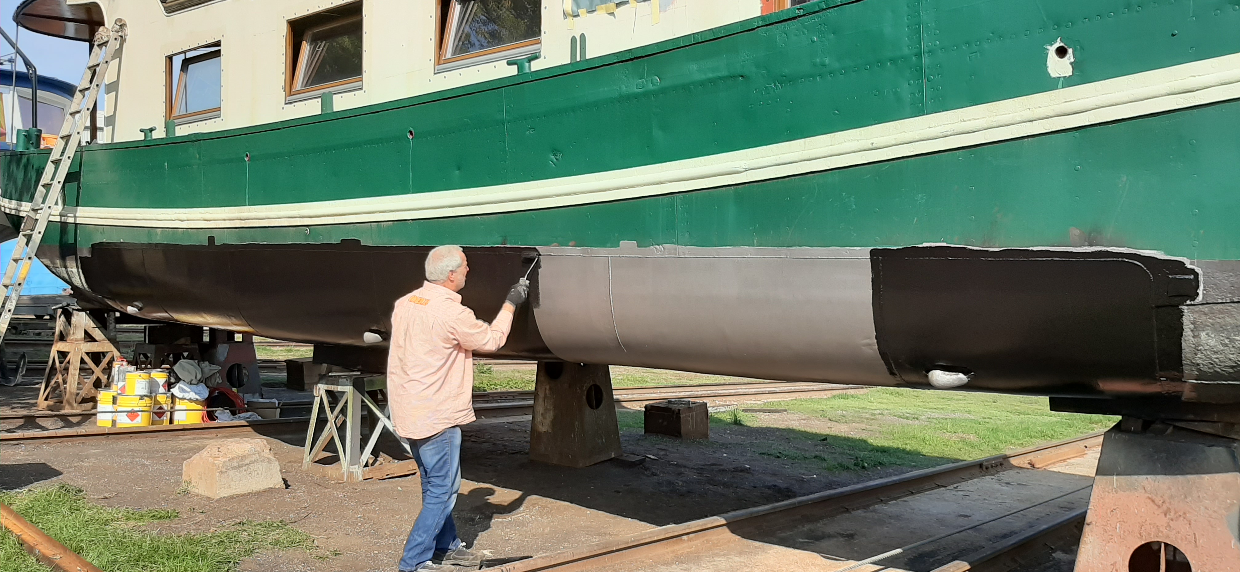 Nach der Überführung, über die ich hier auf einer anderen Seite berichte, ging es dann an den Korrosionsschutz. Auch hier haben wir uns von der Werft beraten lassen und die Produkte von SIKA verarbeitet. Die Schweißnähte wurden alle mit Kreide eingepinselt und von Innen mit Diesel bestrichen. So sollten sich eventuelle undichte Stellen bemerkbar machen. Dies galt es zunächst zu bereinigen. Wir verarbeiteten zuerst einen Primer, dann einen Zwischenanstrich und final einen Endanstrich, alles in 2K. Danach kamen noch ein paar Schichten Antifouling der Marke Wilckens drauf.