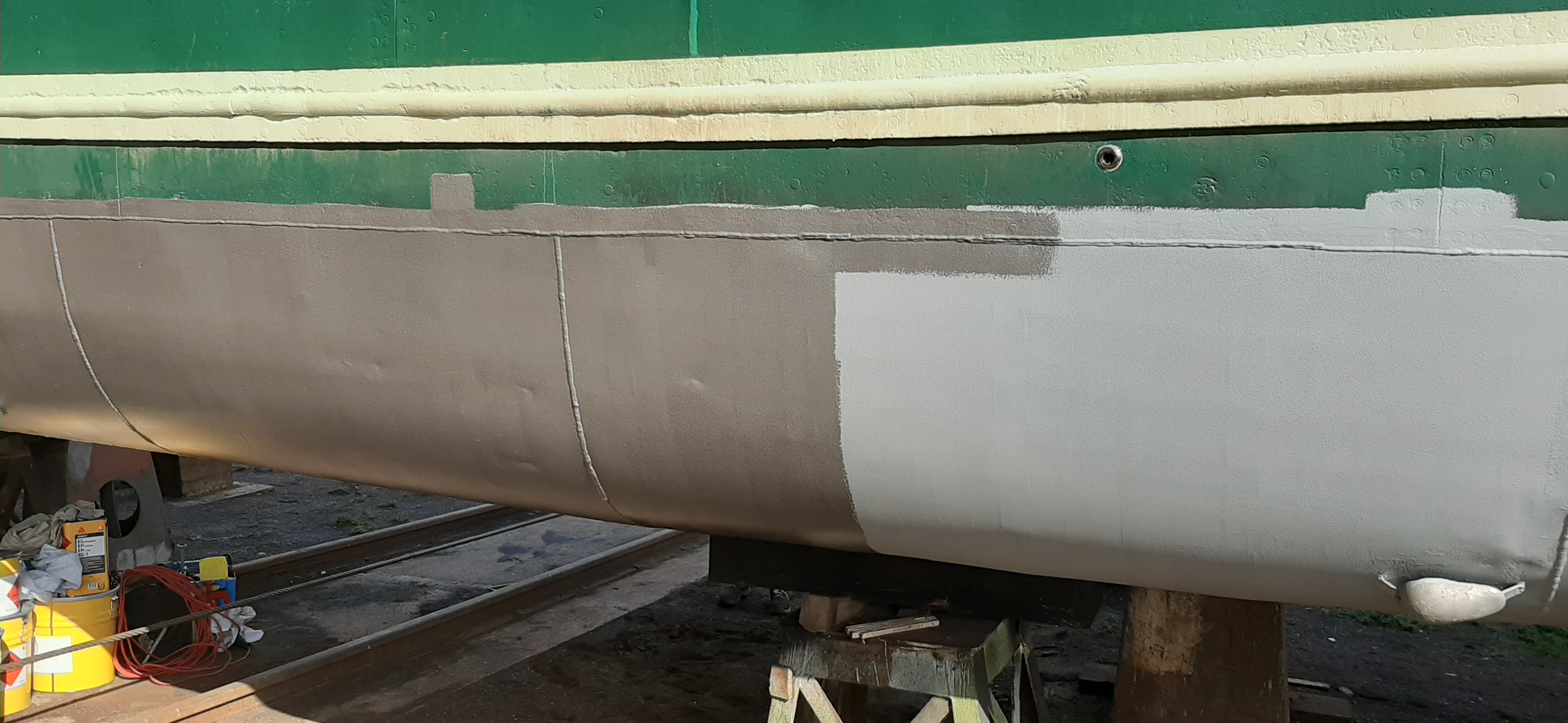 Das Antifouling wurde dann von der Werft erneuert. Dazu wurde der Dreck, die Algen und die Muscheln entfernt. Dann alles angeschliffen. Anschließend ein Haftvermittler gespritzt und zu guter Letzt 3 Schichten Hartantifouling. Arbeiten die sich als teurer Unfug herausstellen sollten.